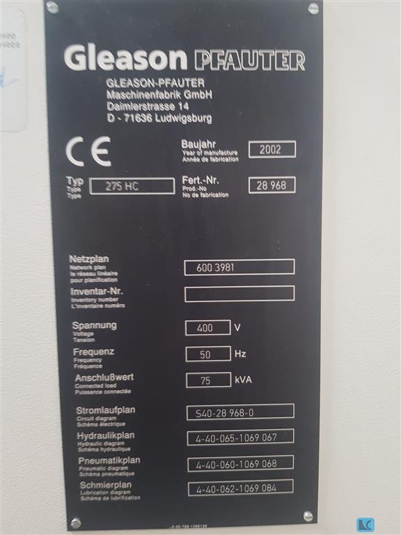 max. wheel diameter:275 mm gear width: mm max. module: weight of the machine ca.:9,4 t dimensions of the machine ca.:3,7 x 3 x 2,82 m min. number of teeth:5 max. number of teeth:2000 range of tooth size:20 mm max. gear width (internal machining):58 mm X-axis:325 mm y-axis:350 mm Z-axis:475 mm Bevel gear milling machine Gleason Pfauter including Promot Automation