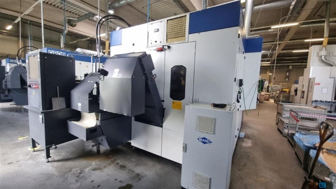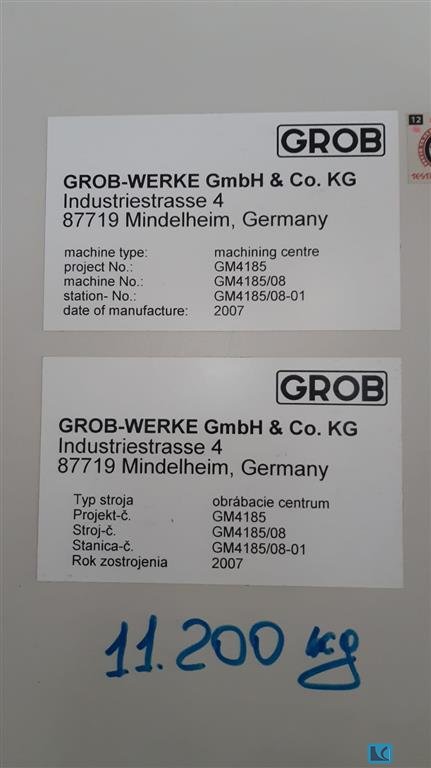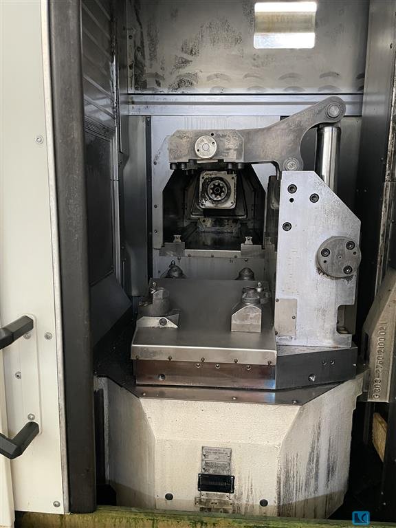 x-travel:800 mm y-travel:950 mm z-travel:1020 mm weight of the machine ca.:17 t dimensions of the machine ca.:6 x 3 x 3,2 m Diameter of the table:770 mm max. table load:800 kg tool taper:HSK-A63 max. tool length:465 mm no. of tools in magazin:60 spindle turning speed range:12.000 U/min feed power:8 kN kp power capacity:25/35 kW 5 axis G550-1024 HSK A-63 Grob (Bezeichnung G550-1024) 1 spindle