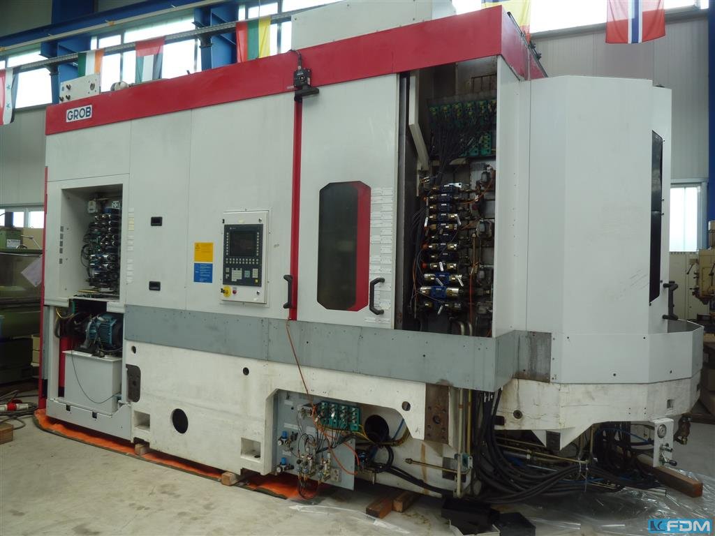 x-travel:800 mm y-travel:950 mm z-travel:1020 mm control:HEIDENHAIN iTNC 530 table load capacity:800 kg tool taper:HSK 63 turning speeds:16.000 1/min spindle:35 / 25 kW table-size:770 mm max. torque on the spindle:160 / 223 Nm tool change unit:120 (2x60) Pos. weight of the machine ca.:20 t dimensions of the machine ca.:3,3 x 6,15 x 3,2 m 5-axis simultaneously machining center with controlled swivel-rotary table (A/B-axis), milling head horizontal, internal coolant device (10-80bar), oilmist-suction, electromech. tool-length measuring device GROB, chipconveyor, 3D touch probe, KINEMATICOPT, BLUM laser, el. handwheel, hour meter: approx. 82.000 h "machine on", approx. 48.800 h "spindle on"