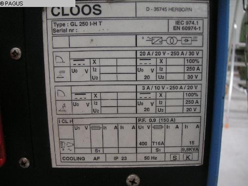 Spawarka TIG z chłodzeniem wodnym CLOOS GL 250 I-HAT 20 / 250 A 10 / 20 V rok budowy 1990 używany, testowany ! Wymiary: 1200 x 600 x 800 mm