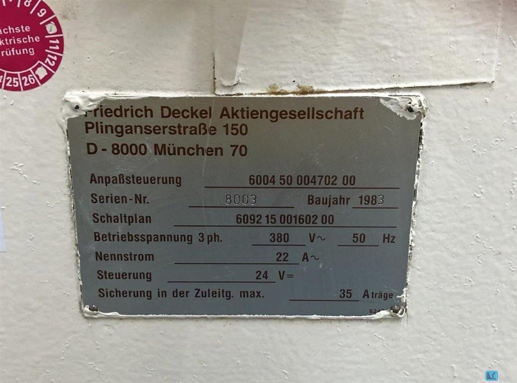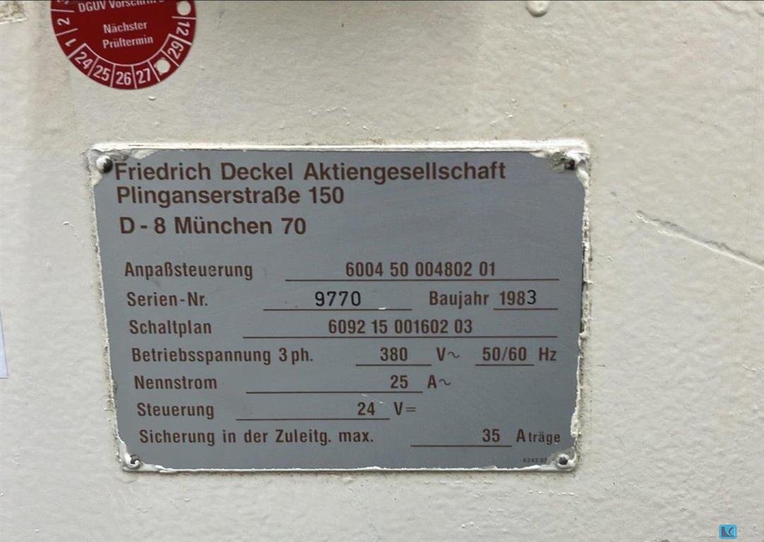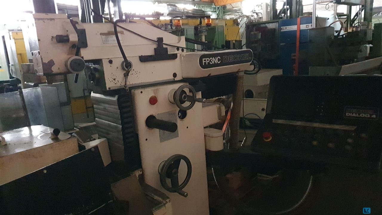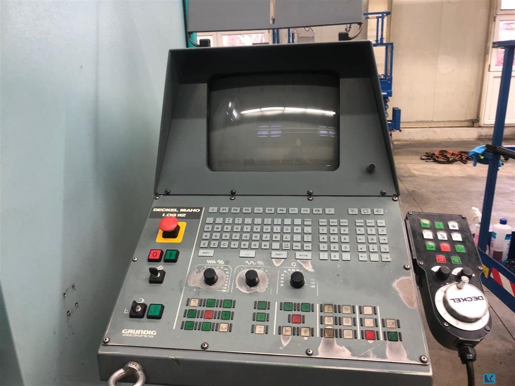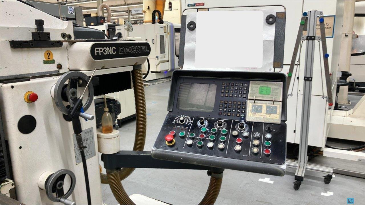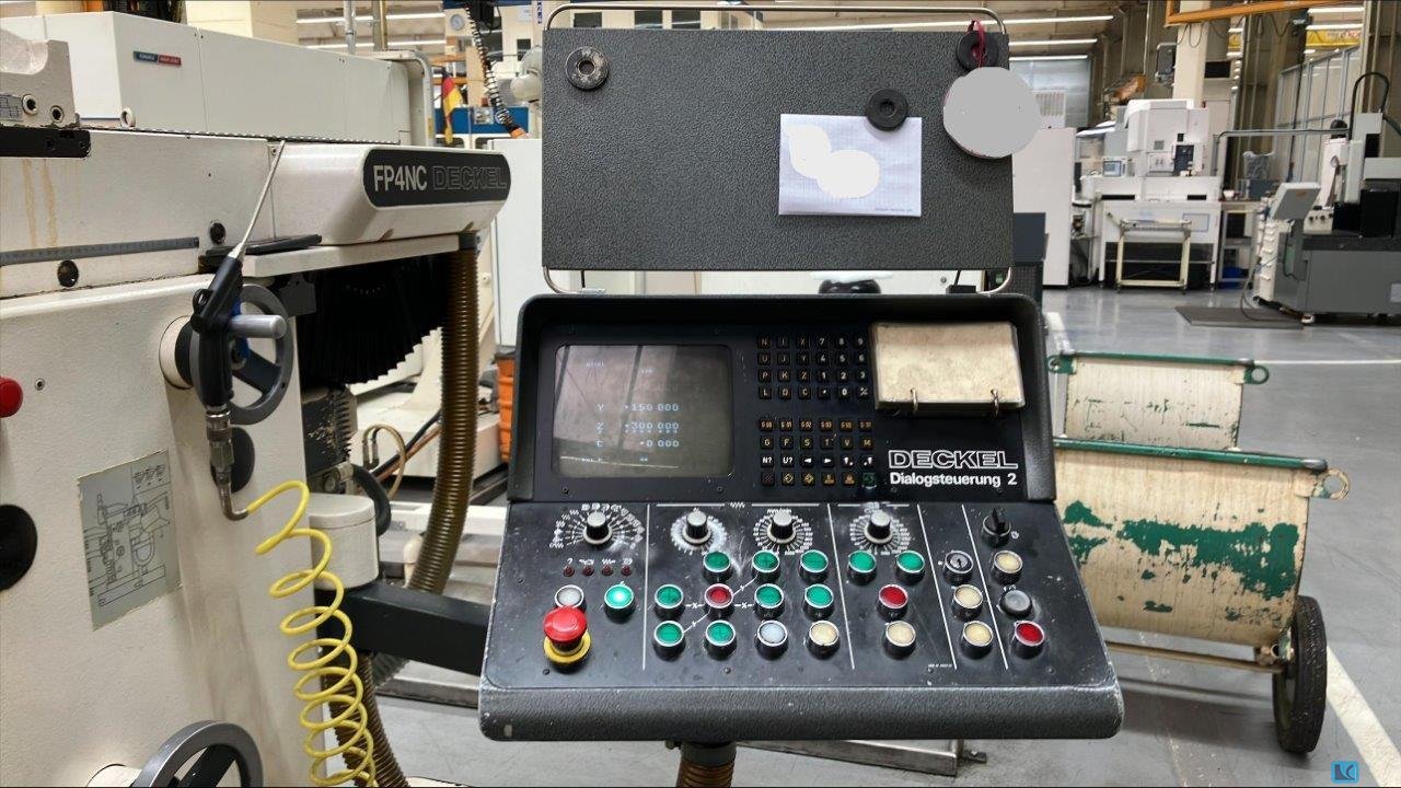 DECKEL FP4 NC Fraesmaschine Dialog 4 Sterowanie dialogiem 4, zakres roboczy 560 x 500 x 450 mm, skok pinoli 80 mm, 18 prędkości wrzeciona 31,5 -6300 min, składana głowica, uchwyt narzędziowy SK 40, prędkość posuwu 1-4000 mm/min, szybki traw 6000 mm/min, obciążenie stołu 800 kg, waga 2070 kg, całkowita wartość przyłącza 16 kVA.