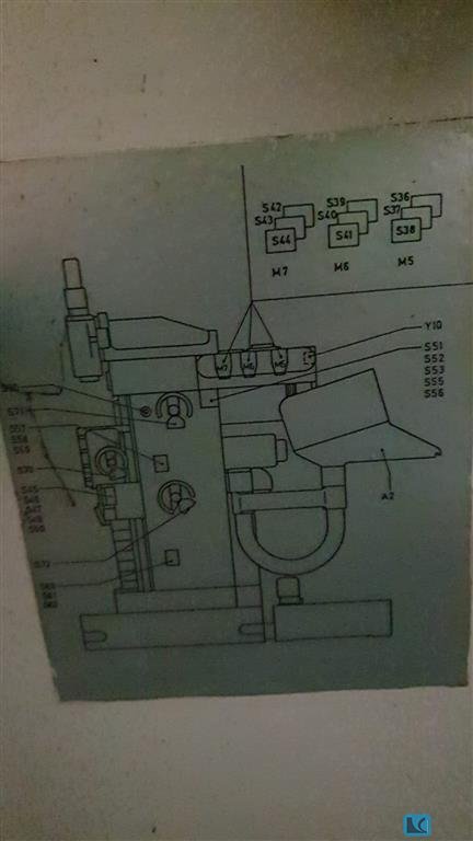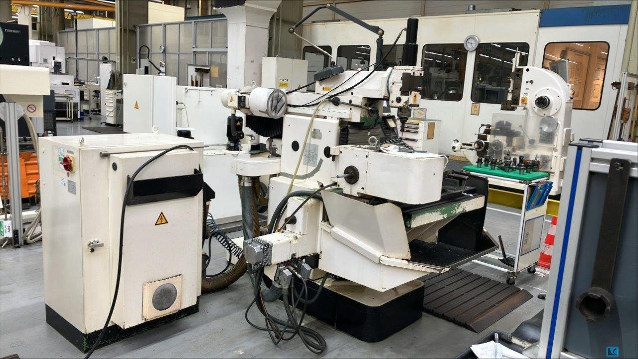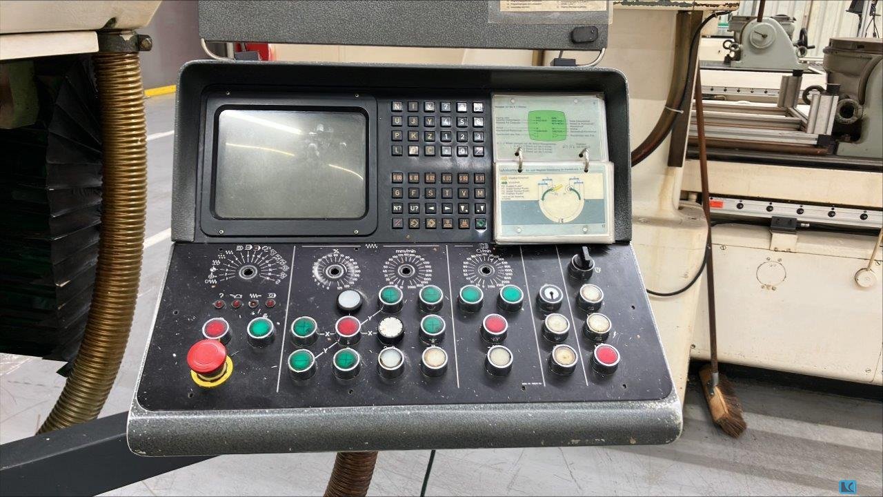 Rok budowy lat 80. Dane techniczne: Skok X/Y/Z: 400 / 400 / 400 mm Uchwyt na narzędzia: SK 40 Zakres prędkości: 40 - 4000 1/min Feed, krok po kroku Regulowane: 2 - 360 mm/min Szybki obrót: 4000 mm/min Stoł kątowy: 700 x 460 mm, maksymalna ładunek 350 kg Zmieniacz narzędzi: Liczba narzędzi: 20 Maksymalna średnica narzędzia: 80 mm Maksymalna długość narzędzia: 300 mm Maksymalna waga narzędzia: 6 kg Sprzęt: - Sterowanie: pokrywa sterowania ścieżką CNC Dialog 11 - System zacisku hydromechanicznego SK 40 z śrubą dokręcającą DIN 69872 - Pionowe i poziome wrzeciono robocze - Ręcznie obracająca się głowica frezowaca +/- 90 - Geometrycznie stopniowa bezpośrednia skrzynia biegów dla maksymalnego momentu obrotowego - Wydajność frezowania na wrzecionie roboczym