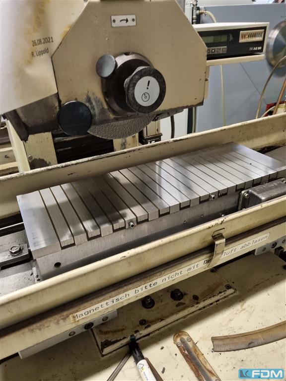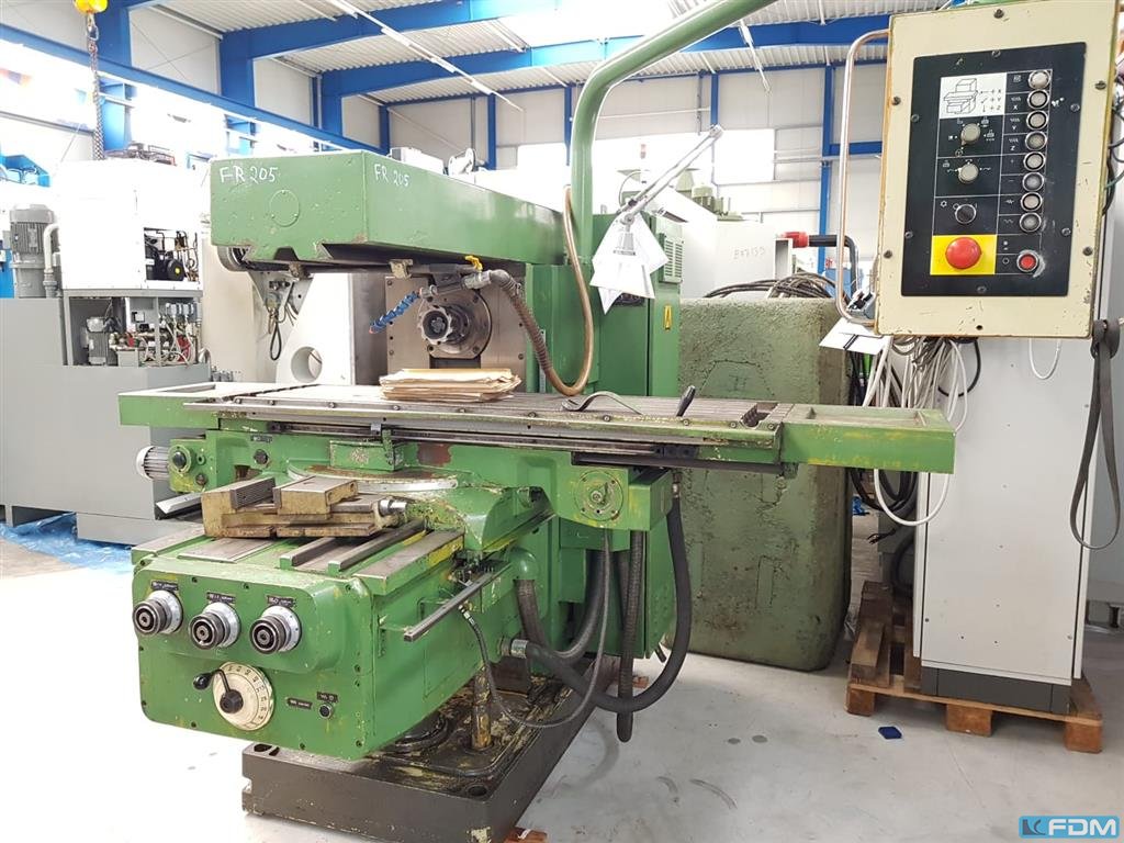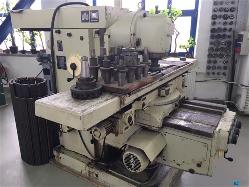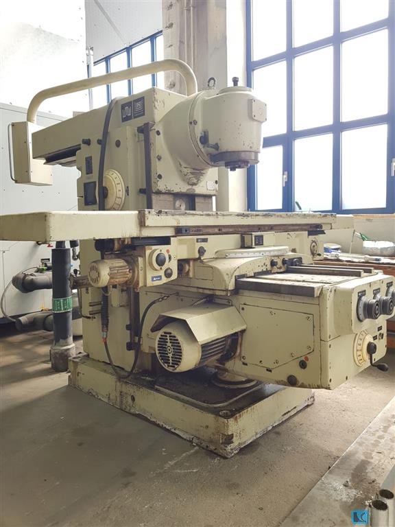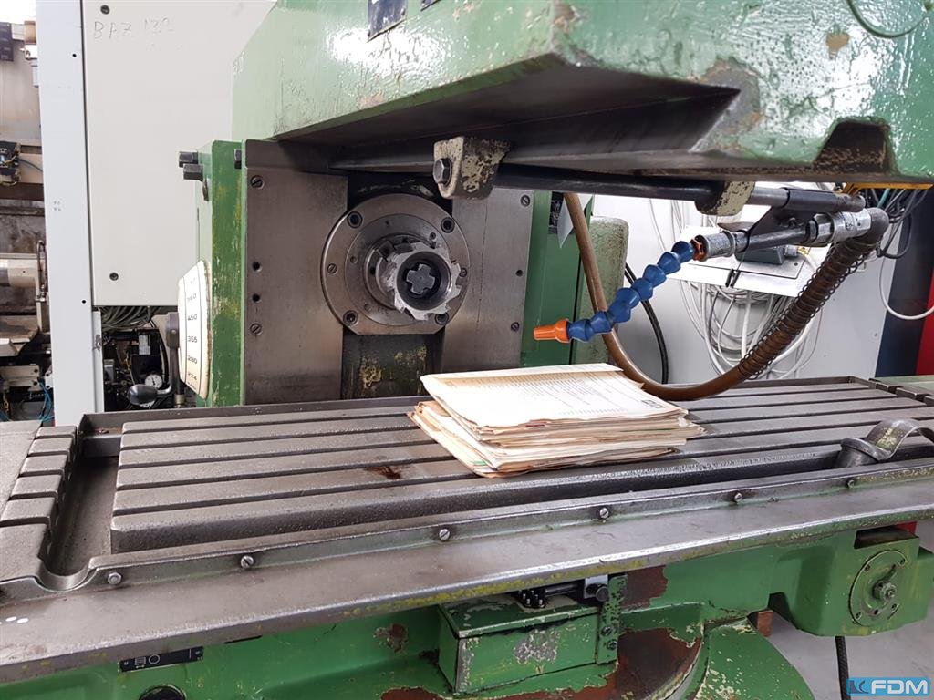 Uniwersalna frezarka narzędziowa, używana uniwersalna frezarka, używana Typ FU 315 - V/2 Fabr. WMW Heckert Rok budowy: 1979 Rozmiar stołu/ stół: 1250 x 315 mm Laengsmotion / longit. ruch: X: 850 mm Ruch poziomy/ horiz. Ruch: Y: 270 mm Ruch pionowy/ Vert. ruch : Z 355 mm Uchwyt na narzędzia/stożek: ISO 50 Prędkości wrzeciona R+L w nieskończoność/ prędkości wrzeciona (lewy/prawy) 28 - 1400 obr./min. Pre-shot bezstopniowe wszystkie osie X, Y i Z/ zasila ją cała oś 10 - 630 mm/min / 250 mm/min Moc/obciążenie napędu 3,8 kW Waga: 2 t