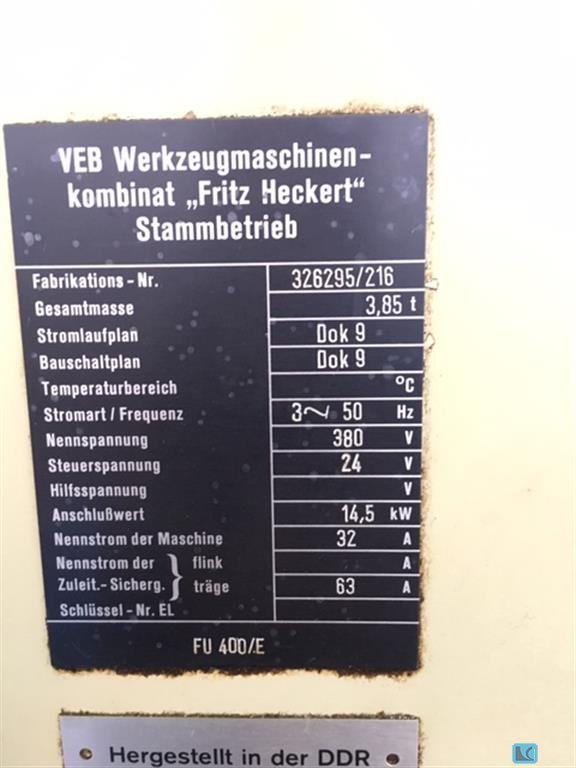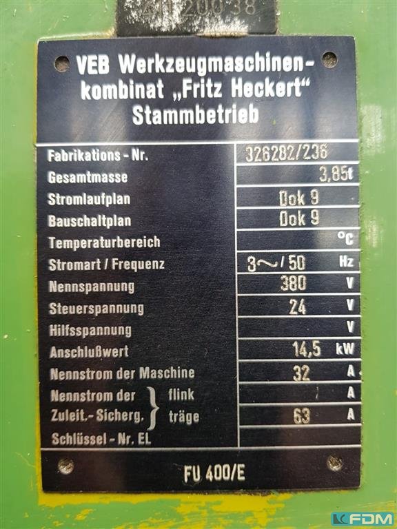 Dostępne są różne frezarki CNC oraz konwencjonalnie sterowane, produkowane przez Fritza Heckerta. 1) Fritz Heckert FU 315/E, waga: ok. 4000 kg. 2) Fritz Heckert FU 315 2/PS, waga: ok. 3900kg. 3) Fritz Heckert FU 315 2/PS, waga: ok. 3900kg. 4) Fritz Heckert FU 315 2/PS, masa: ok. 3900 kg. 5) Fritz Heckert FU 315/E, waga: ok. 3200kg. 6) Fritz Heckert FW 400/E, masa: ok. 3700kg. 7) Fritz Heckert FU 315 x 12. 8) Fritz Heckert FU 315, waga: ok. 3100kg. Możliwe jest przeprowadzenie inspekcji na miejscu.