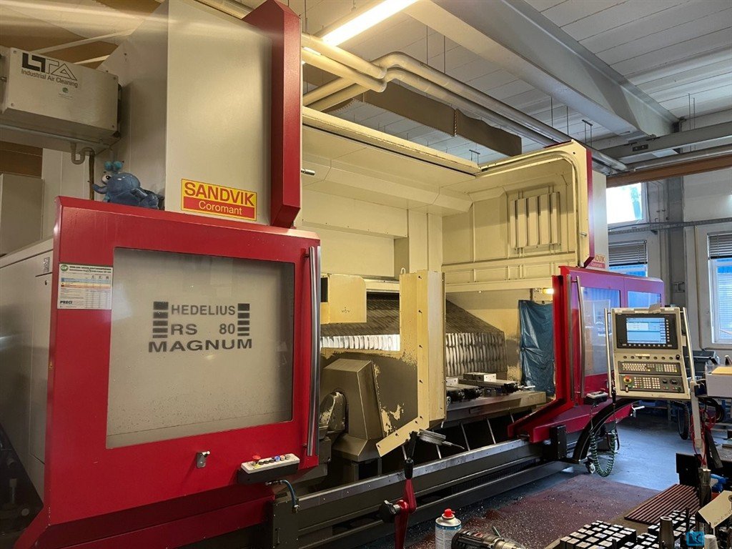 Centrum obróbki CNC Hedelius C60P-2000 Magnum Sterowanie: Heidenhain iTNC 530 Rok produkcji: 2009 Podróże: Oś X 2000 mm Oś Y 620 mm Oś Z 520 mm Powierzchnia zacisku 2 500 x 600 mm Montaż: SK 40 Magazyn narzędziowy: 56 – Taca Prędkość obrotowa: 8 000 obr./min Akcesoria: - Taśmowiec chipowy AME KB 448 - Filtr taśmowy AME PS 120 - LTA ssanie - Maska maszynowa