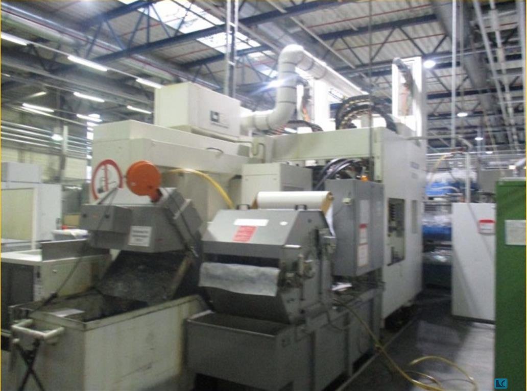 HELLER MC16 4-osiowe poziome centrum frezarskie JOM 2000 4-osiowe sterowanie torem CNC SIEMENS, model SINUMERIC 840 D Wzdłużna oś X 630 mm Pionowa oś Y 630 mm Poprzeczna oś Z 630 mm Stół obrotowy NC Oś uchylna B 360.000 x 0,001 Wymiary palety 400 x 500 mm Max. rozmiar obrabianego przedmiotu x wysokość 720 x 800 mm Max. ciężar detalu 500 kg Czas wymiany palety 9 sek. Prędkość obrotowa osi B 40 obr./min Stożek uchwytu narzędziowego HSK 63 Rozmiar narzędzia x dł. x waga 150 x 227 x 12 mm/kg Bezstopniowa regulacja prędkości obrotowej wrzeciona 45 – 24 000 obr./min Posuwy / szybkie posuwy XYZ: 1 – 60 000 mm/min Siła posuwu 10.000 nm Moment obrotowy wrzeciona 48/72 Nm Napęd wrzeciona 30 kW Całkowite obciążenie elektryczne, ok. 60 kW - 400 V - 50 Hz Masa całkowita: 12,5 tony Akcesoria / Funkcje specjalne: -Oddzielny stojący 80-pozycyjny mag ...