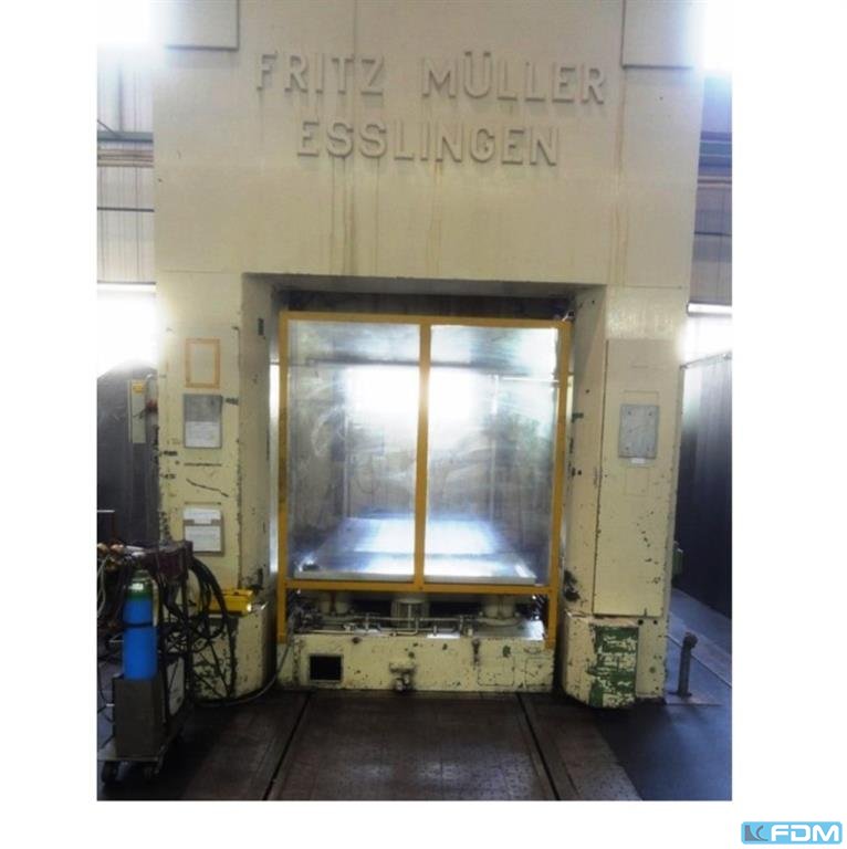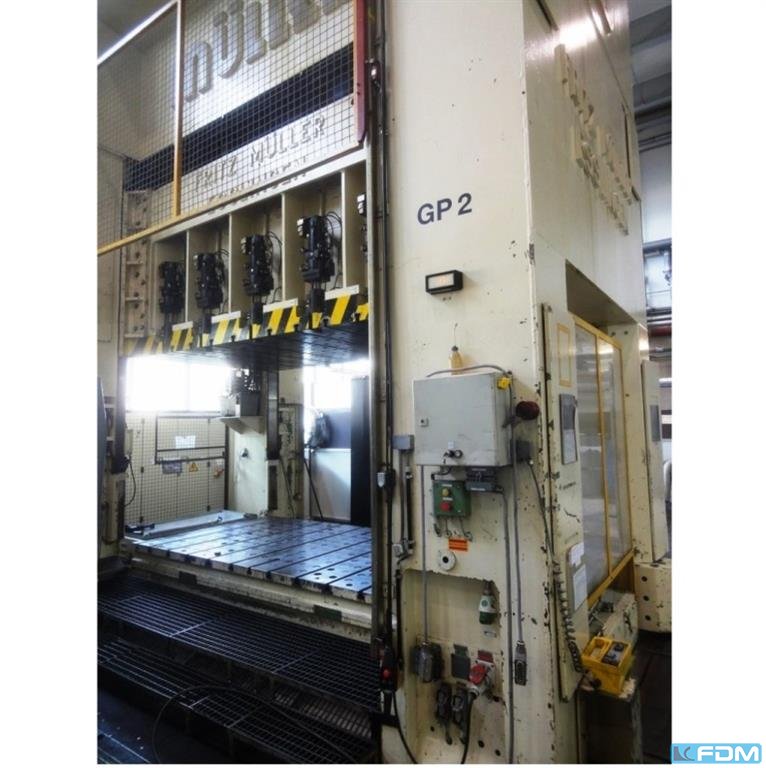 (2000) 1000t Müller Knuckle-Joint Press Precyzyjna prasa do stawów stawowych o dużej pojemności Ten nowoczesny model stanowi znaczący skok w mocy prasowania, oferując ogromną pojemność 10 000 kN i jest zaprojektowany do precyzyjnych operacji na dużą skalę. Szczegóły techniczne Typ maszyny: Wydruk do przegubów kostkowych Producent: Müller Model: KNP 1000 Numer maszyny: 2912 Rok produkcji: 2000 Siła nominalna: 1000t Pojemność robocza: 33 kJ Skok tarana: 100 mm Regulacja RAM-u: 65 mm Tempo ruchu: 40 uderzeń/min Wysokość zamknięcia (od stołu do tarana): 400 mm Powierzchnia RAM (Szerokość x Szerokość): 700 mm x 500 mm Powierzchnia stołu (szerokość x wyk): 700 mm x 750 mm Moc silnika: 30 kW Napięcie robocze: 400 V Odległość bezpieczeństwa: 225 mm Wartość graniczna (czas zatrzymania): 97 ms Masa całkowita: 42 000 kg Wymiary ...