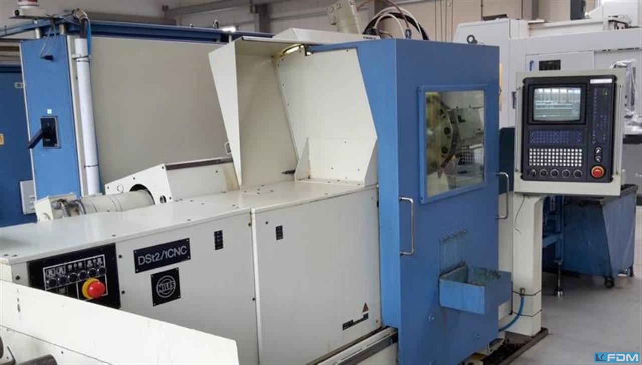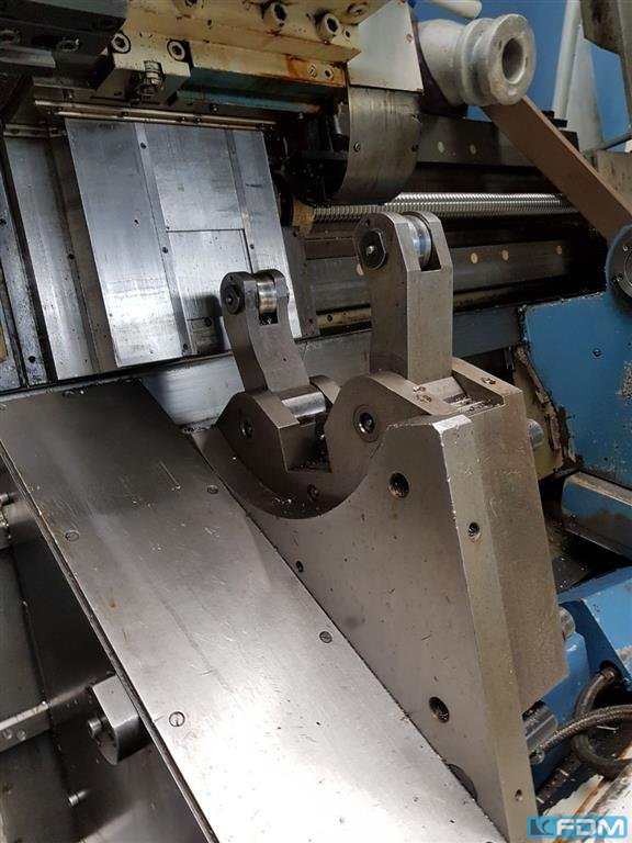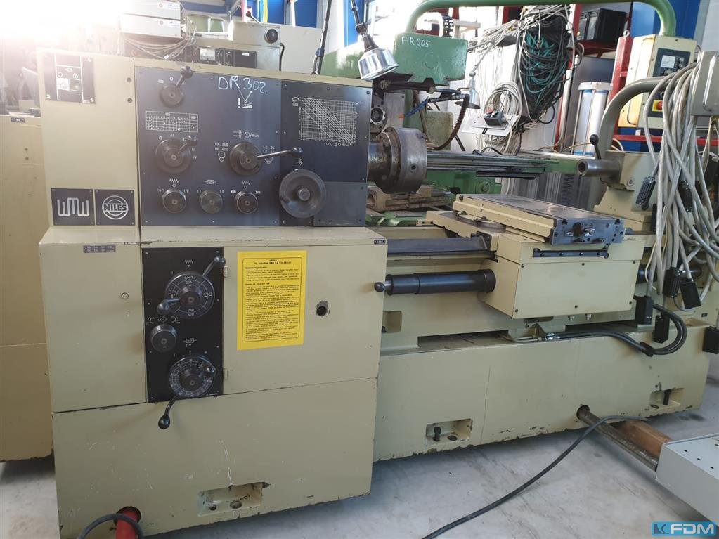 Tokarka równoległa WMW NILES typ DLZ 500 IV L 1000 Między punktami: 1000 mm Maxi Ø na ławce: 500 mm Maxi Ø nad siodełkiem: 300 mm Średnica wrzeciona: Ø 50 mm Prędkość obrotowa wrzeciona: od 28 do 1400 obr./min Uchwyt 3-szczękowy Ø 200 mm Gwinty: metryczne + Whitworth Konik CM4 Automatyczne posuwy poprzeczne + wzdłużne + szybkie Pompa smaru Napięcie: 380 V Wymiary (dł. x szer. x wys.): 3000 x 1400 x 1500 mm Waga: ok. 2,5 T