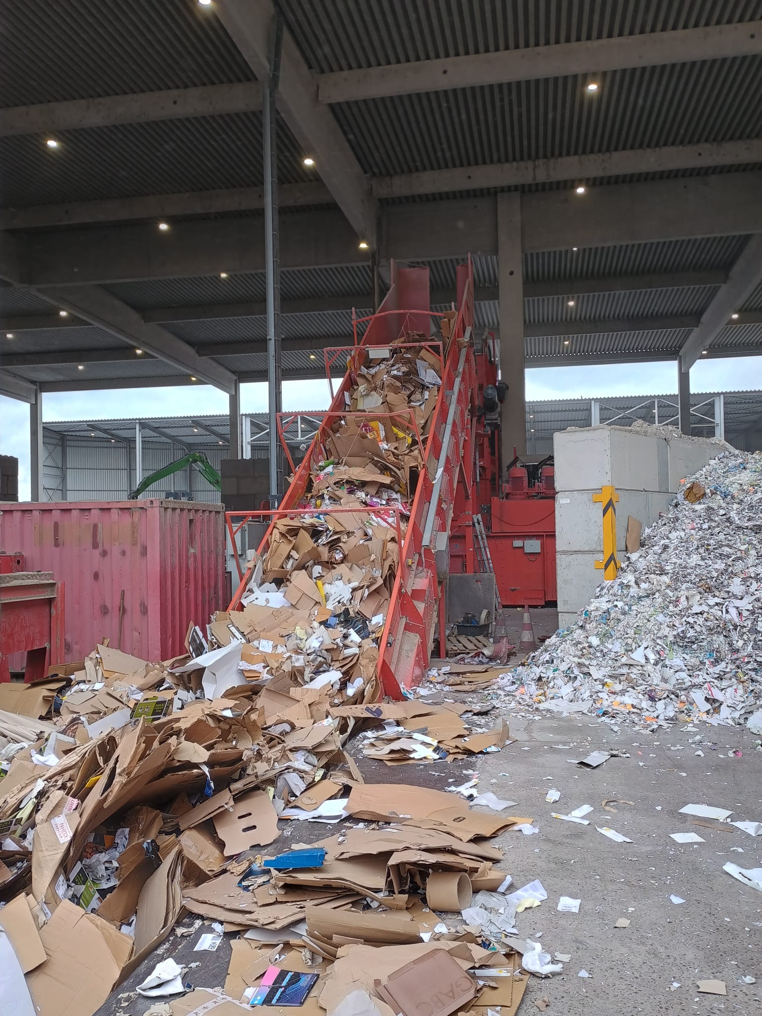 automatyczna belownica Producent: PAAL Typ: KONTI 275 D/k Rok budowy 1999 Specyfikacje: Siła nacisku: 75 t Siła nacisku właściwego: 9,09 kg/cm² Format kanału: 750 x 1.100 mm Waga beli: 500 - 750 kg, w zależności od materiału i długości beli Otwór wypełniający: 1.550 x 1.020 mm Moc napędu: 75 kW Wydajność: 350 m³/h Wydajność prasowania: - ok. 12,0 t/h w domu towarowym (gęstość nasypowa 35 kg/m³) - ok. 21,0 t/h dla papieru mieszanego (gęstość nasypowa 60 kg/m³) - ok. 33,0 t/h dla towarów zebranych (gęstość nasypowa 100 kg/m³) Wiązanie: 4-krotne pionowe + 3-krotne poziome Masa maszyny: ok. 25,0 t