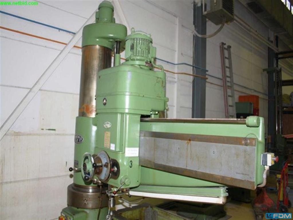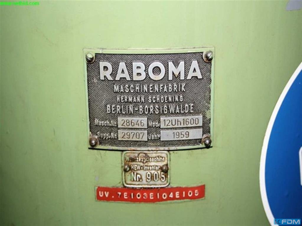 Producent: RABOMA Modelu: 12Rh1600 Rok produkcji: 1957 Typ maszyny: Wiertarka promieniowa Specyfikacja techniczna: - Max. Wydajność wiercenia (materiał pełny): 75 mm - Średnica wrzeciona: 114 mm - Stożek wrzeciona: MK 5 - Przesuw wrzeciona: 500 mm - Moc napędu: 7,5 kW - Zakres prędkości: 14 – 1 400 obr./min Wymiary stołu roboczego: - Powierzchnia górna: 750 × 1 000 mm - Powierzchnia boczna: 530 × 1 000 mm - Płyta podstawy: 1.000 × 1.600 mm Regulacje i ruchy: - Regulacja wysięgnika: - Pionowo: 1 000 mm - Poziomo: 950 mm (zamykany na klucz) - Regulacja suwaka wiertła: - Poziomo: 1 000 mm - Zakres obrotu wysięgnika: