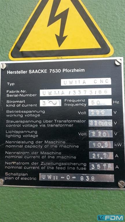Producent Producent Saacke Typ typu UW2 CNC Rok budowy Rok budowy 1989 Steuerung control Sinumerik Rozmiar maszyny wymiary maszyny 3500x3000x2500 mm Napięcie Spannung 400 V Masa maszyny ok. 2,5 t