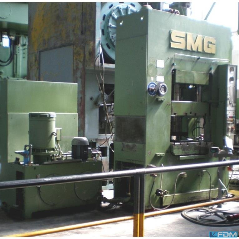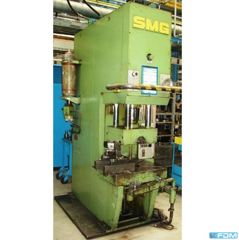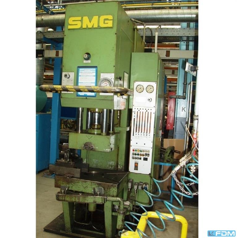 Prasa hydrauliczna SMG DS 40 została zbudowana w 2000 roku w Niemczech przez SMG Süddeutsche Maschinenbau GmbH. Maszyna, charakteryzująca się wysoką niezawodnością, jest wykorzystywana do tłoczenia i dziurkowania metali. Proces obróbki odbywa się z dużą siłą nacisku 40 ton, co w połączeniu z sztywnym korpusem zapewnia produkcję wysoce powtarzalnych i precyzyjnych części. Parametry, czyli prędkość pchnięcia, pozycja stołów roboczych oraz siła prasy, są regulowane za pomocą prostej kontroli opartej na wyłącznikach granicznych. Prasa SMG waży 4 tony. Specyfikacja techniczna prasy SMG DS 40 - maksymalna siła nacisku (regulowana): 40 t - wymiary stołu roboczego (L x W): 600 x 400 mm - skok górnego stołu roboczego: 150 mm - odległość między stołami roboczymi: 400 mm - wymiary (L x S x S): 1230 x 570 x 2500 mm - waga maszyny SMG DS40: 4 t