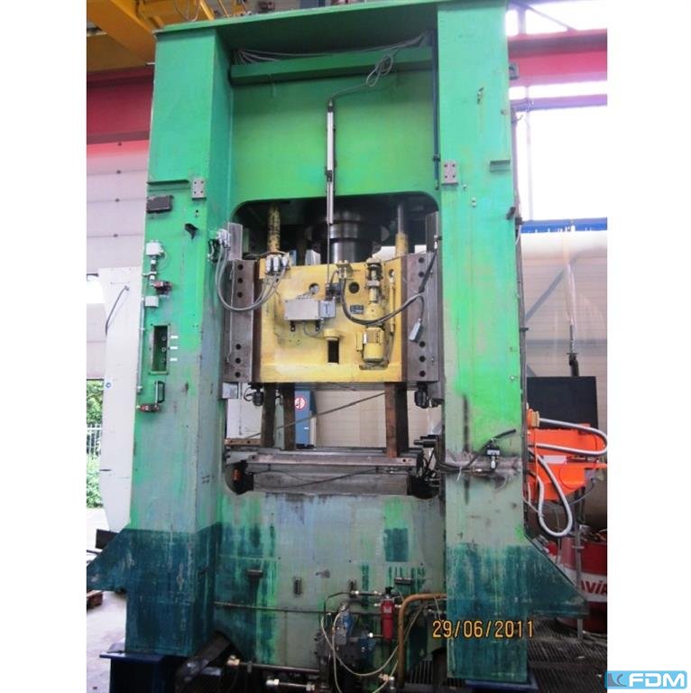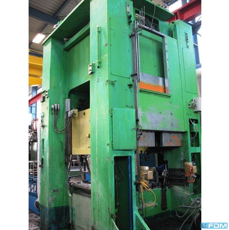 Maksymalna siła: 1600 ton Długość skoku suwaka: 400 mm Nieosiągalny kurs: 12 mm Liczba kursów suwaka na minutę: 16 Liczba pojedynczych turn-onów: 12 Zamknięta wysokość: 870 mm Regulacja: 220 mm Płyta pod forginig: -Od lewej do prawej: 1600 mm -Od przodu do tyłu: 1600 mm -Grubość: 650 mm Wymiary całkowite suwaka: 1600x1600 mm Przysłona w tabeli: 1000x1000 mm wymiary okna w policzkach: 1650x1650 mm Przebieg sztywnego popychacza w suwaku: 100 mm Siła sztywnego popychacza w tonie suwaka: 80 Główna moc silnika elektrycznego: 110 kW Przebieg poduszki pneumatycznej: 160 mm Siła wypchnięcia z pneumatycznej poduszki ton-force: 71 Poduszka hydropneumatyczna: -Kurs roboczy: 250 mm -Siła wypychania ton-force: 25 -Siła klipsa ton-force: 250 Wymiary ogólne prasy: 4670x4670x8110 mm Waga prasy: 140 ton