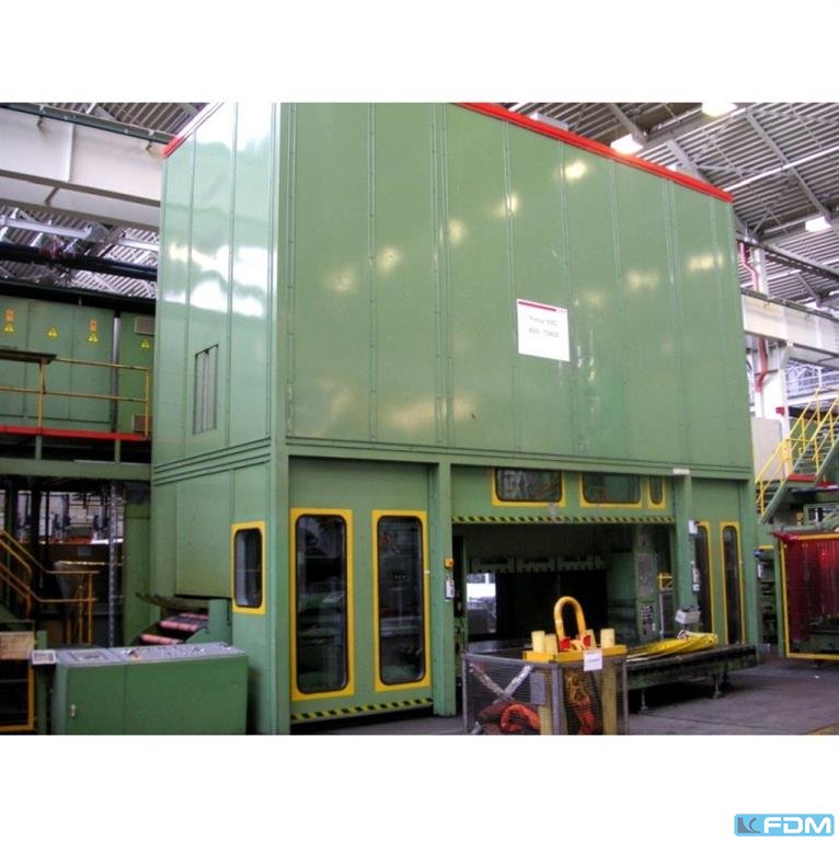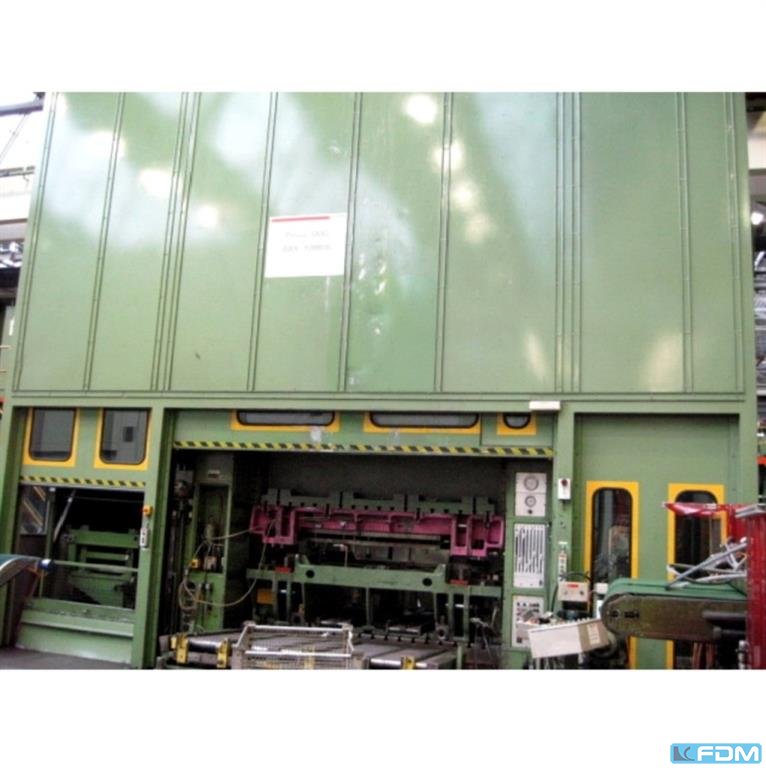 Nacisk całkowity: 1400 ton Skok: 950 mm Światło dzienne: 2000 mm Powierzchnia stołu: 3600 x 2500 mm Powierzchnia przesuwu: 3600 x 2500 mm Pojemność poduszki matrycy w stole: 400 ton Skok poduszki matrycy: 500 mm Powierzchnia podkładki poduszki matrycy: 3060 x 1860 mm Prędkość zbliżania: 400 mm / s Prędkość robocza: 40 / 80 mm / s Prędkość powrotu: 400 mm/sec Objętość oleju: 5000 l Wymagana moc: 450 kW Waga maszyny ok.: 240 ton