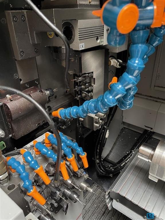 gebr. Centrum tokarsko-frezarskie CNC z długimi krótkimi i osią B Godzin: 7200 Sterowanie: Fanuc 31i-A Długość obróbki: max 250 mm Liczba sterowanych osi: 7 osi i maksymalnie 5 osi jednocześnie Oś B: 0-130 dowolnie programowalna Przejście pręta: od 3 mm do maks. 20 mm Moc napędu wrzeciona głównego: 3,7 kW Moc napędowa wrzeciona przechwytującego: 2,2 kW Prędkość obrotowa wrzeciona głównego: 10 000 obr./min Prędkość obrotowa wrzeciona przechwytującego: 10 000 obr./min Oś C: wrzeciono główne i przeciwwrzeciono Ilość belek liniowych: 2 sztuki Łączna ilość narzędzi: 35 sztuk Wymiary (dł. x szer. x wys.) w mm: 2,110x1,200x1,885 Waga: 3 300 kg Konwersja z toczenia wzdłużnego na toczenie krótkie Stacje wiercenia głębokich otworów Wrzeciono szybkoobrotowe NAKANISHI Wózek tylny z osią Y Wiercenie poprzeczne z tyłu Przenośnik Syste ...