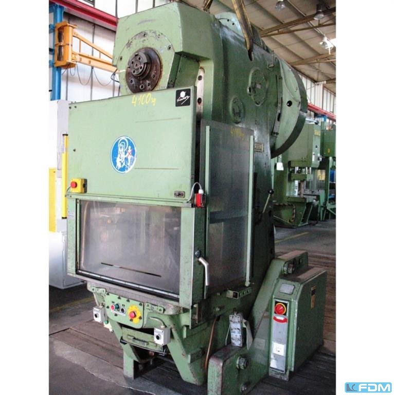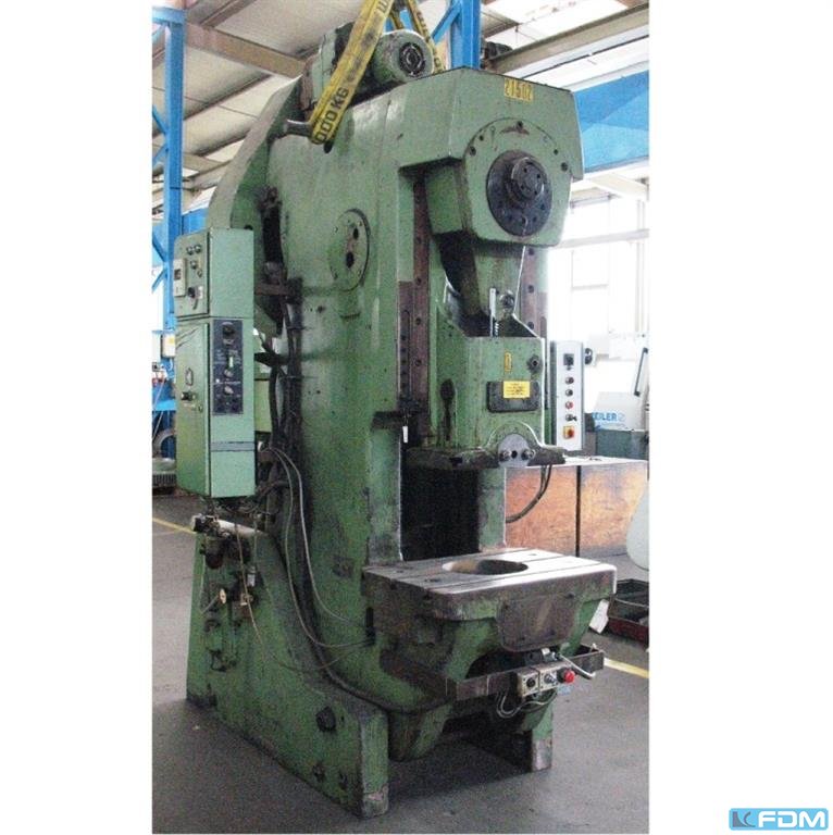 Prasa mimośrodowa jednokolumnowa WEINGARTEN typ E 40 Masch. Nr 643 / 62 Rok budowy 1963 Udźwig 40 ton. Zasięg 250 mm Otwór stołu 150 x 80 i 200 mm Powierzchnia stołu 560 x 460 mm Powierzchnia tłoka 250 x 200 mm Regulowany skok suwaka 8-88 mm Regulacja tłoka 63 mm Wysokość montażu 320 mm Otwór na trzpień zaciskowy 40 mm Częstotliwość skoków 100 / 130 uderzeń / min. Moc silnika 2,2 / 3 kW Przyłącze sieciowe 400 V, 50 Hz Wysokość stołu nad podłogą 840 mm - Kombinacja sprzęgło-hamulec dzięki ciernemu sprzęgłu gwintowanemu WEINGARTEN z zabezpieczeniem przepływu OT - Elektryczne zwalnianie skoku za pomocą obsługi oburęcznej - Zabezpieczenie przed przeciążeniem przez płytę zgniatającą - Ręczne centralne smarowanie smarem plastycznym - Łożysko podporowe przedniego wału korbowego - Szafa sterownicza przylegająca - UVV do ręcznego ...