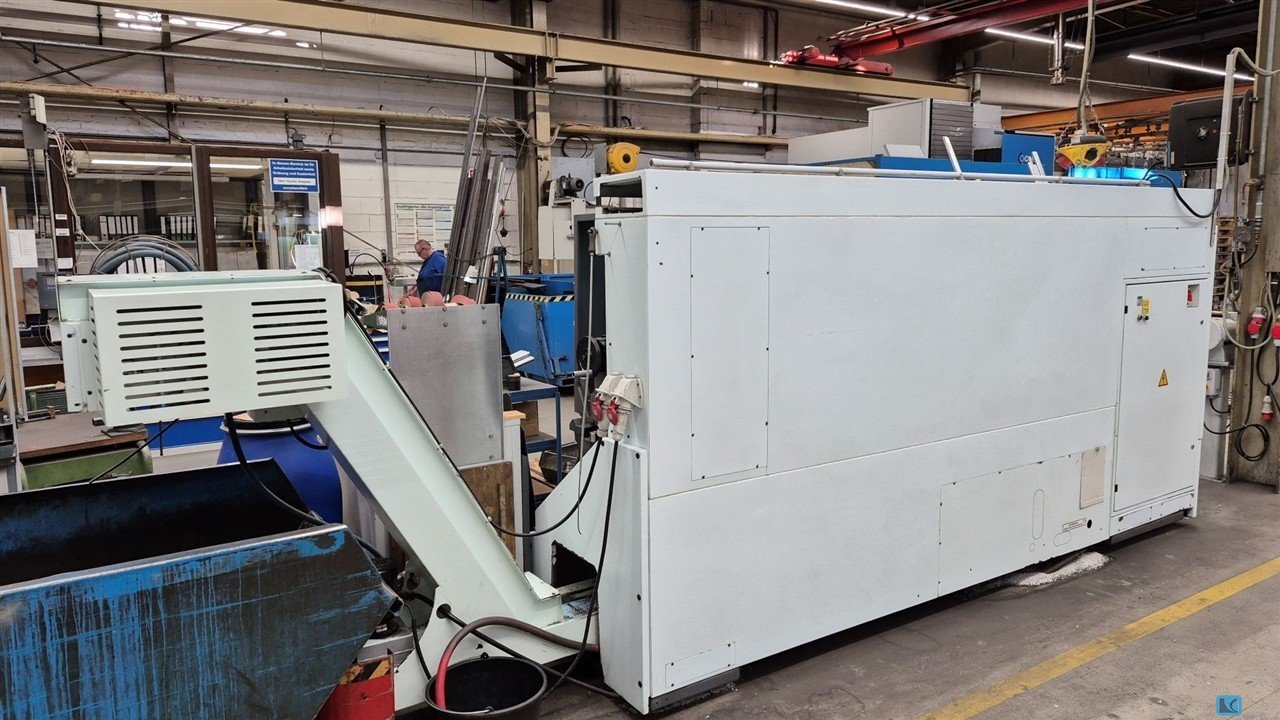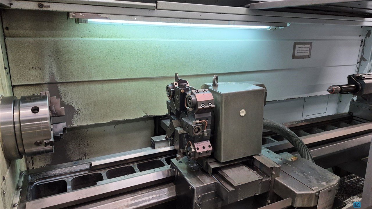 turning diameter:570 mm turning length:- mm control:- Diameter of rotation above the bed slide:360 mm Maximum width:2.000 mm revolutions per minute:max. 2500 U/min :11 kW max. longitudinal feed:7,5 m/min max. transverse feed:7,5 m/min rapid traverse longitudinal:12 m/min rapid traverse cross:15 m/min Pinole diameter:95 mm Pinolenhub:220 mm Pinolen intake: MK 5 weight of the machine ca.:2,97 t dimensions of the machine ca.:3,8m x 1,3m x 2m m Technical description: - Tool turret - automatic - 8-fold (see also options) - CAPTO Revolver Disc - Machine bed - made of perlite casting GG-26 - high stiffness due to strong ribbing - Bed slides - guideways hardened and ground - automatic lubrication of the bed rail - Reitstock - manual - Quick clamp - Operator station - two movable handwheels on the operator panel - a movable handwheel - Control - "Siemens 828 D" CNC control - Siemens "Comfort" (in ...