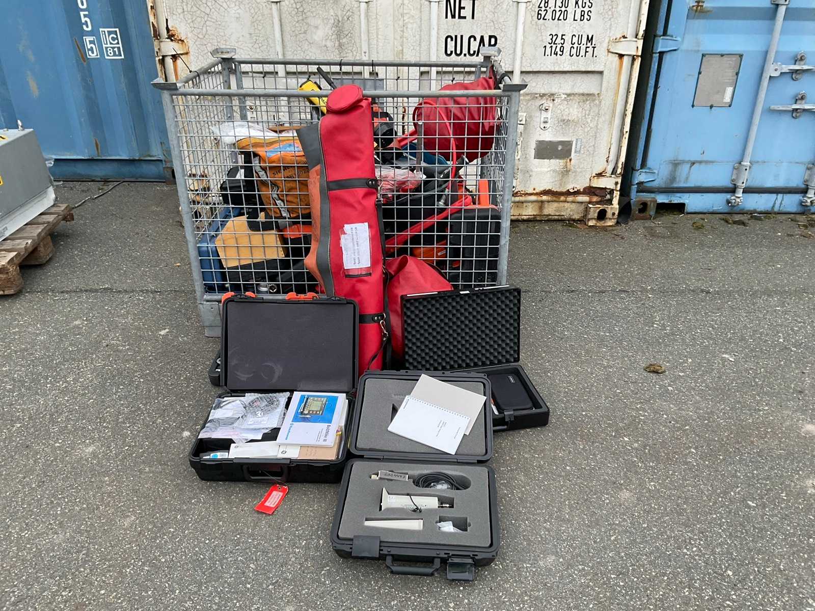 Zawartość: bębny kablowe, elektryczne jednostki sterujące (żółte pudełko), niebieski zbiornik ciśnieniowy lub filtr oraz różne kable i worki Auction-ID: A1-45495-310