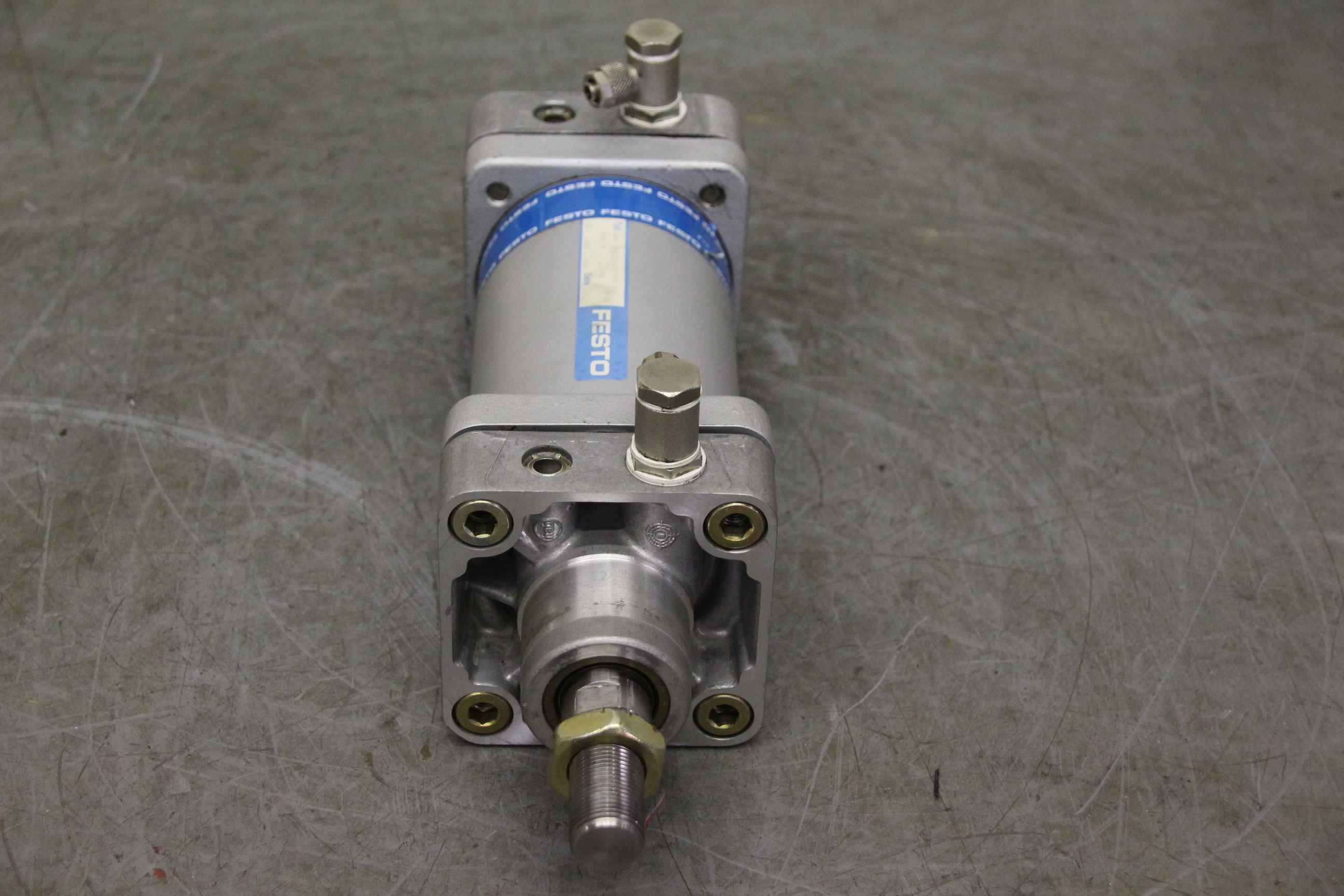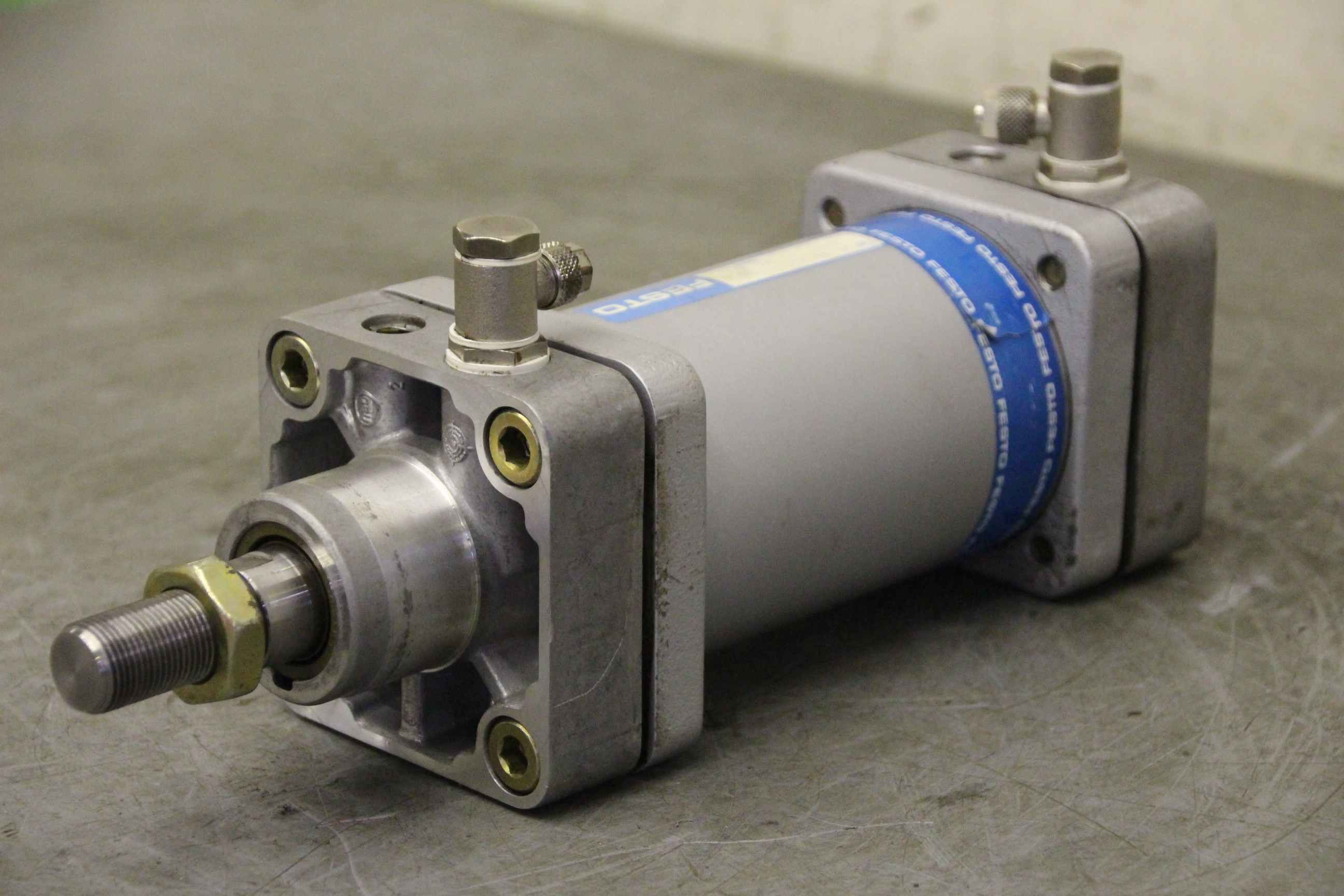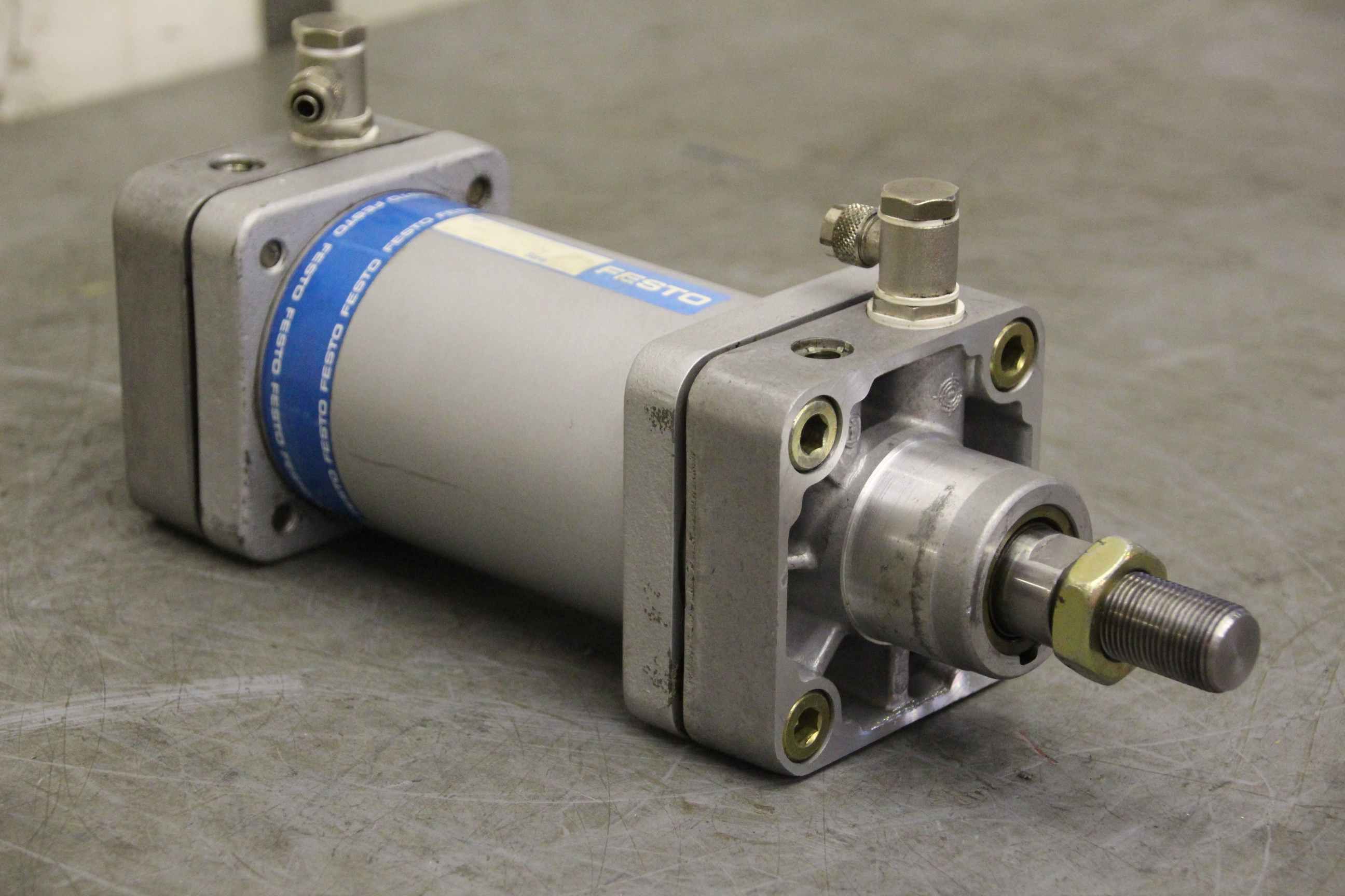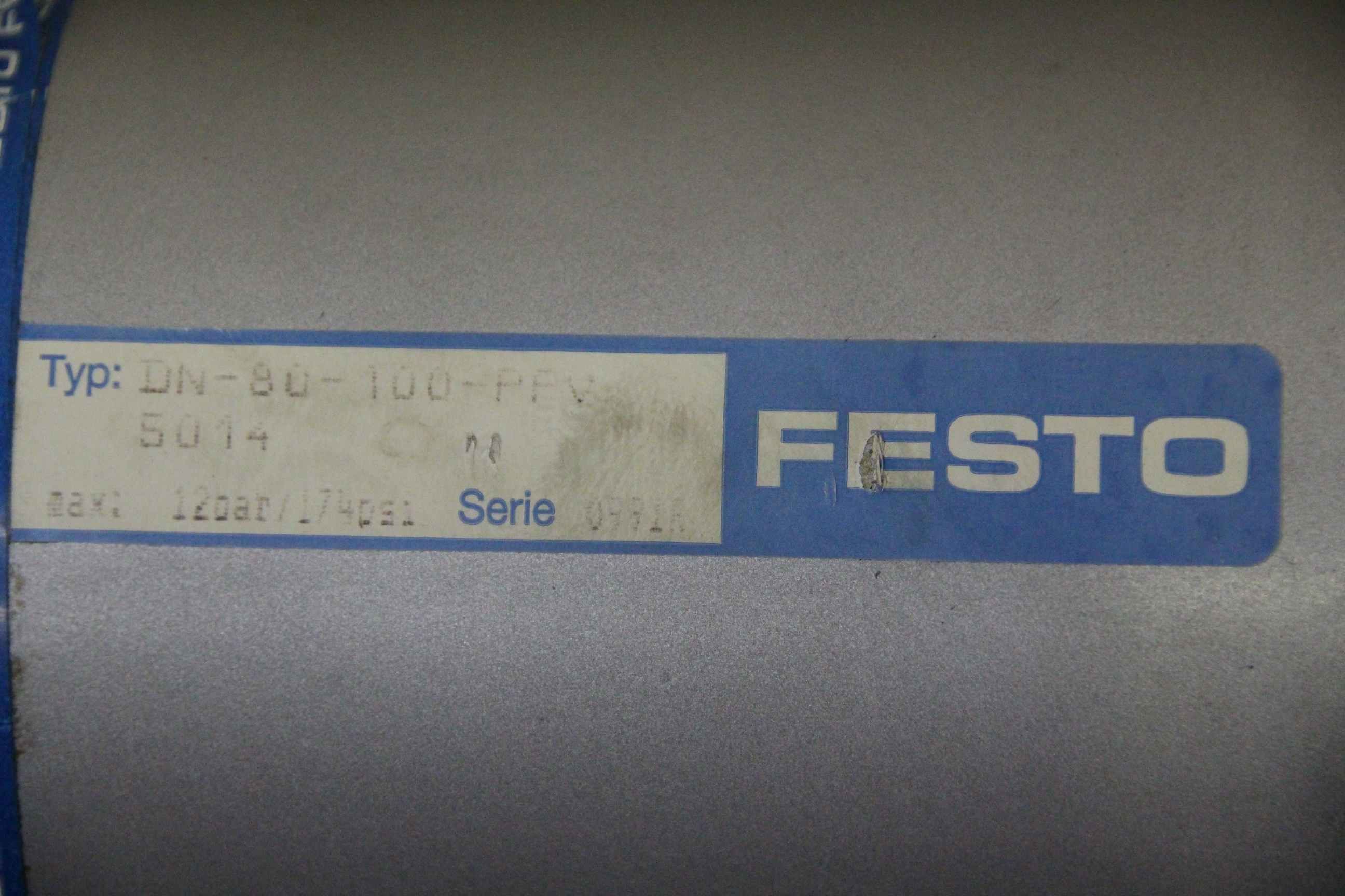 Pneumatic cylinders, air cylinders, standard cylinders, clamping cylinders-Festo type: DN-80-100-PPV-Piston diameter: 80 mm-Piston rod: Ø 25 mm-Stroke: 100 mm-Max. Pressure: 12 bar-Pneumatic damping: adjustable on both sides-Dimensions: 320/95/H125 mm-Weight: 4.8 ...