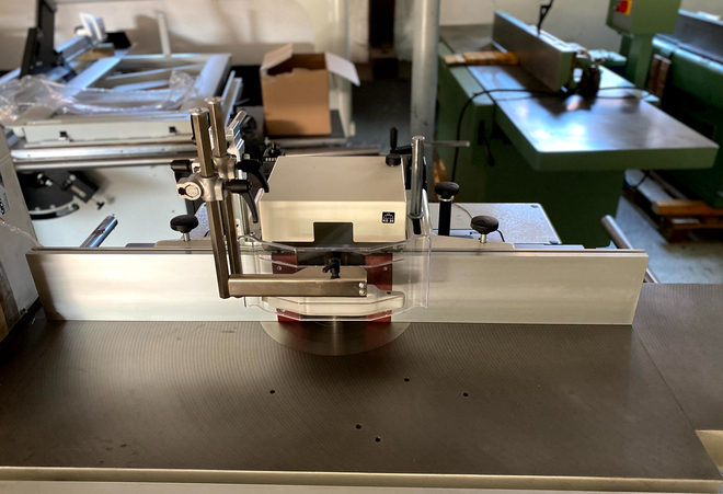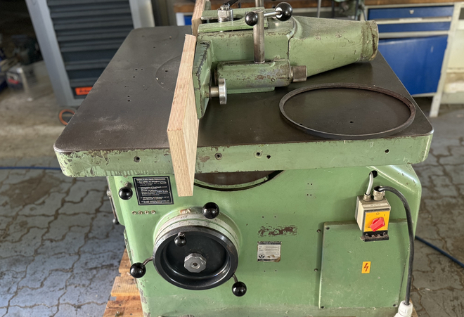 Maszyna do frezowania stołowego Bäuerle Typ SFM Z 3 rolkami do podawania Średnica wrzeciona 30 mm Moc silnika 3/4 kW Rozmiar stołu: 1100 mm x 900 mm Maksymalnie 400 mm otwiera stół Maksymalna długość zacisku wrzeciona wynosi 130 mm Obrót wrzeciona w lewo/prawo Prędkości regulowane za pomocą pasów 2800 / 4500 / 5600 / 6000 / 9000 / 12000 obr./min Z rozszerzeniem tabeli Masa około 650 kg