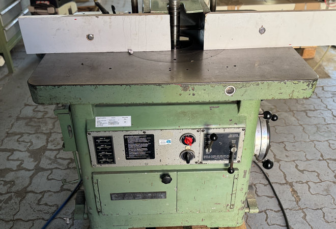 Maszyna do frezowania stołowego Bäuerle Z długim blaterem Typ SFM Maszyna nr 4702/81 Zbudowany w 1981 roku Za pomocą 4 rolek zasilają Hol-Her Średnica wrzeciona 30 mm Moc silnika 7,5/9,5 kW Rozmiar stołu 2000 mm x 920 mm Wysuwana osłona stołu do dużych ram Maksymalna średnica otwóru stołu wynosi około 400 mm Maksymalna długość zacisku wrzeciona wynosi ok. 130 mm Obrót wrzeciona w lewo/prawo Prędkości regulowane za pomocą pasów 2800 - 12000 obr./min Waga około 750 kg