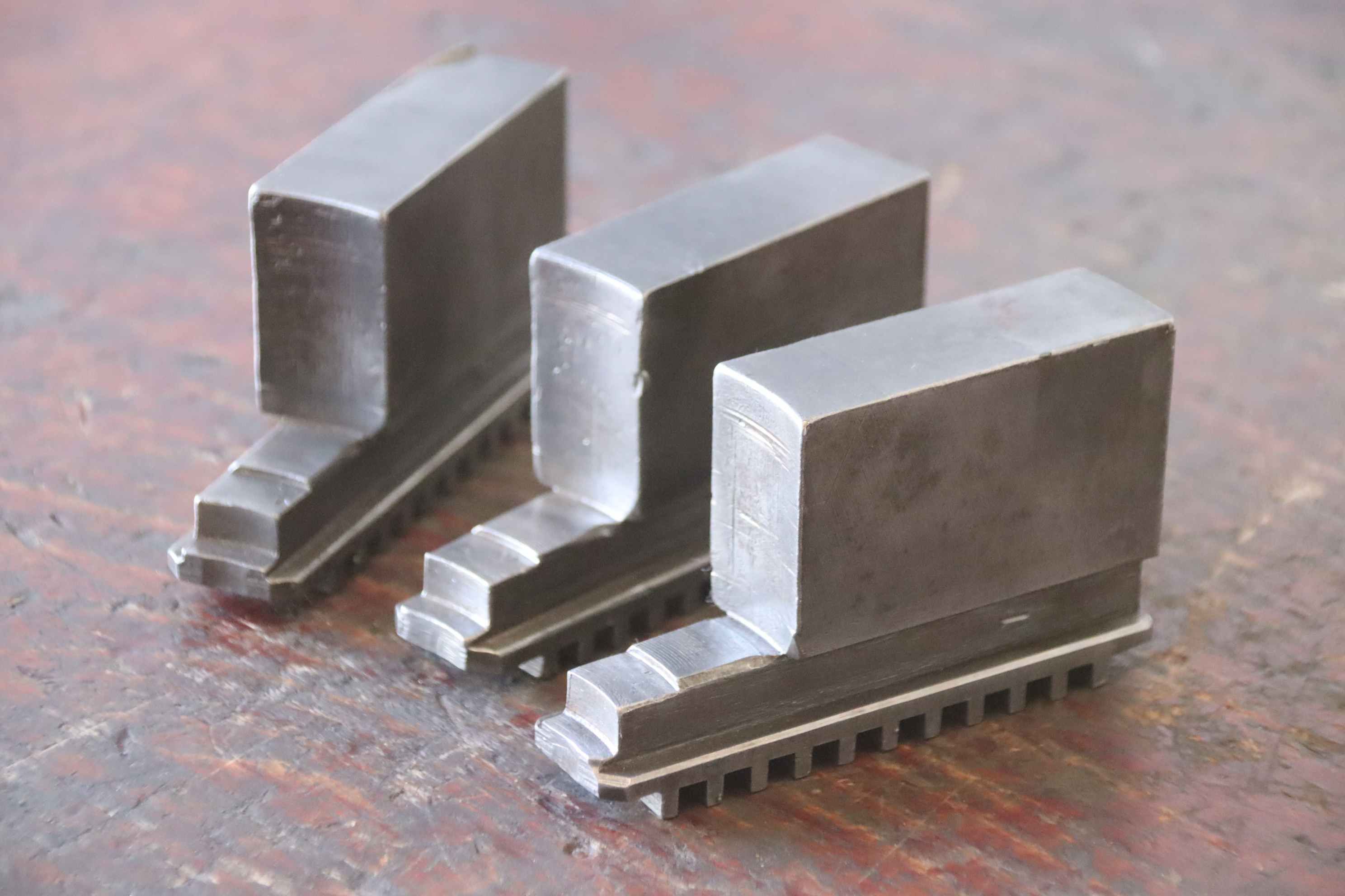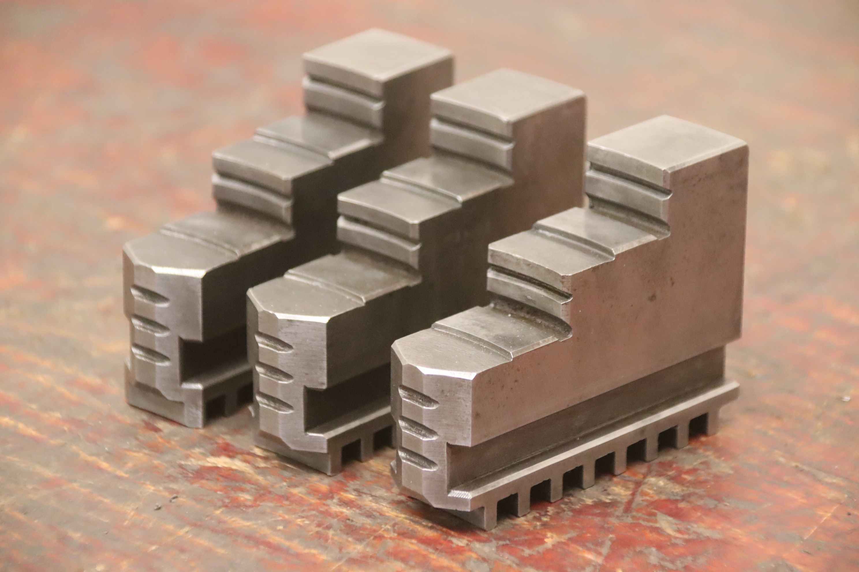 Interchangeable jaws, top jaws, three-jaw chucks, segment jaws, clamping jaws, stepped block jaws, stepped top jaws, block jaws -Interchangeable jaws: 3-piece hard top jaw set -Width: 40 mm -Dimensions total: 107/120/H55 mm -Total weight: 3.2 kg