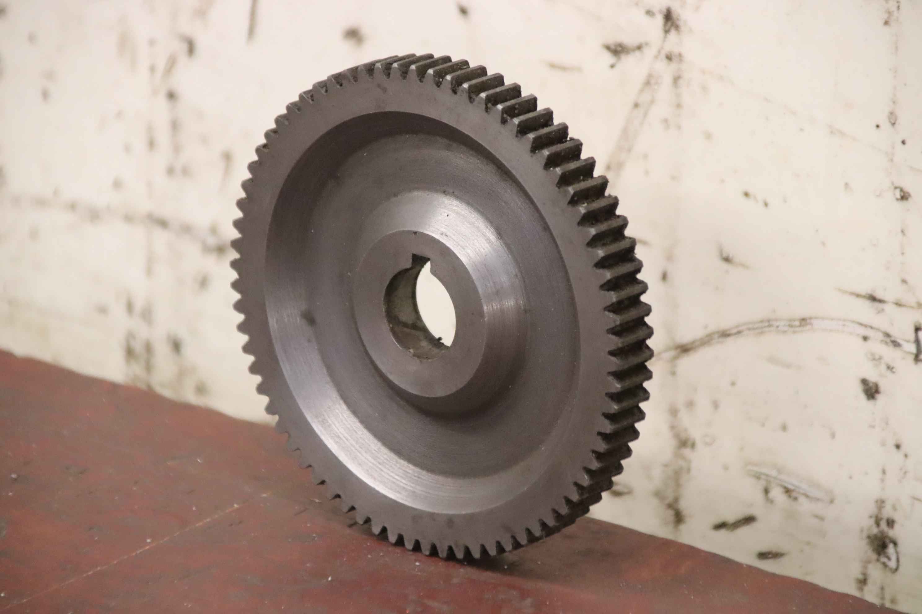 Gear, gears, gear shaft, pinion shaft, spur gear, spur gear, hollow ground gear-Gear: spur gear with hollow ground 63 teeth-Shaft holder: inner Ø 40 x 45 mm-Dimensions: see photos-Dimensions total: Ø 134 x 60 mm-Weight: 1.8 kg