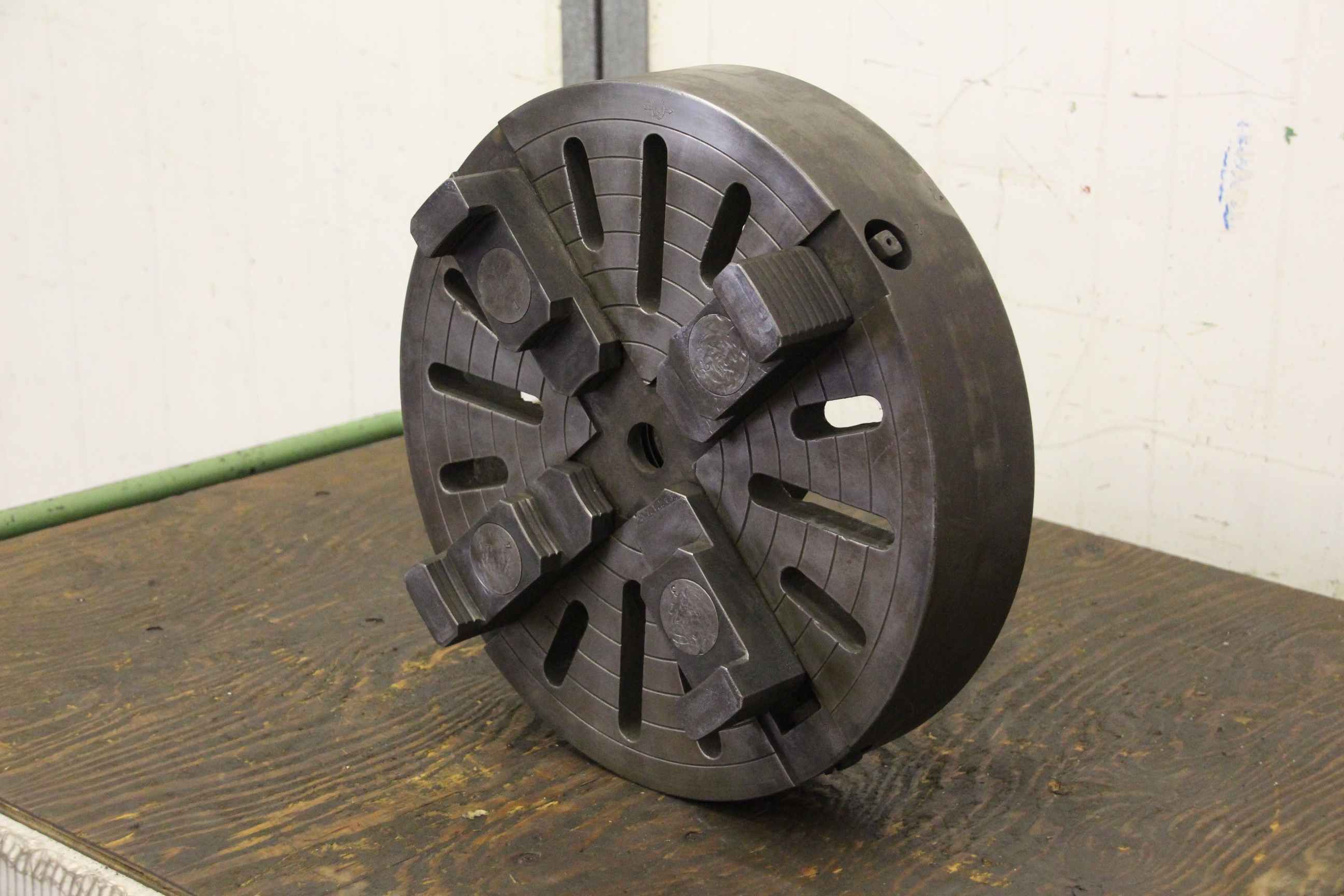Face plate, face plate chuck, four-jaw chuck, facing chuck -Chuck size: Ø 400 mm -Through hole: Ø 28 mm -Recording: approx M77 x 6 -Weight: 41 kg