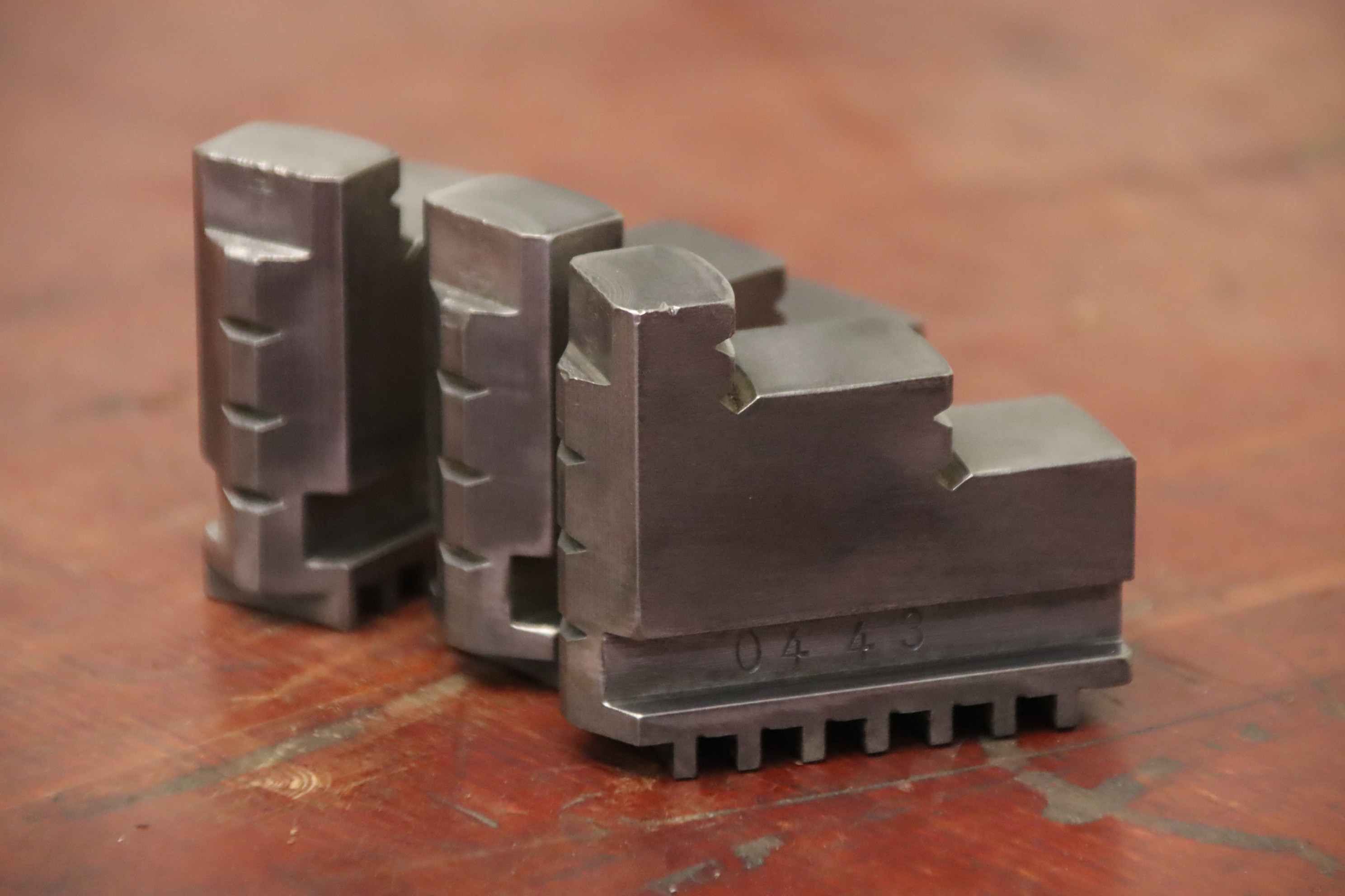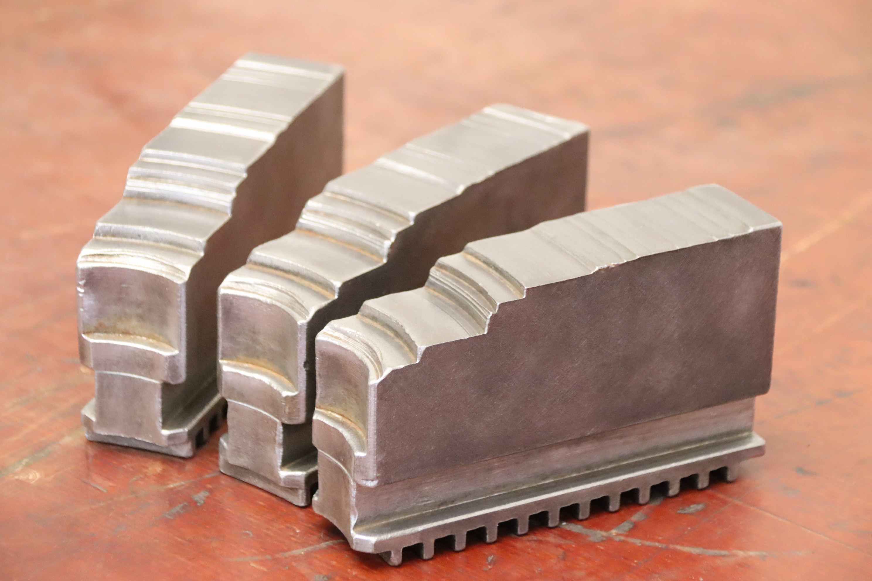 Interchangeable jaws, top jaws, three-jaw chucks, segment jaws, clamping jaws, step block jaws, step top jaws, block jaws, base jaws-Top jaws: Jaw set for three-jaw lathe chuck, soft-Jaw width: 34 mm-Dimensions: see photo technical drawing-Total dimensions: 135/105/H80 mm-Total weight: 6.6 kg