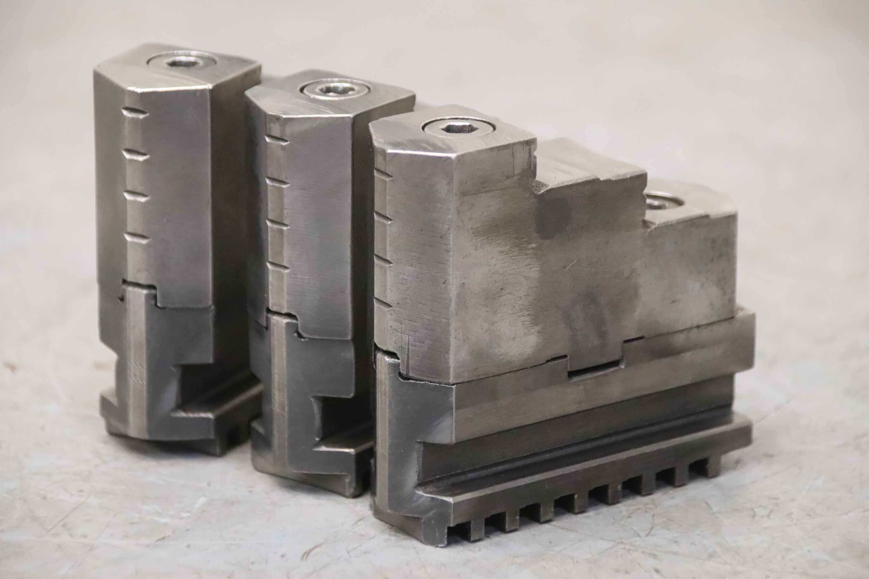 Interchangeable jaws, top jaws, three-jaw chucks, segment jaws, clamping jaws, step block jaws, step top jaws, block jaws, base jaws-Top jaws: Jaw set for three-jaw lathe chucks, hard-Jaw width: 26 mm-Dimensions: see photo technical. drawing-Quantity: 1 sets of interchangeable jaws available-Price: per set-Total dimensions: 80/78/H78 mm / 78/78/H75 mm-Total weight: 2.5 kg/set