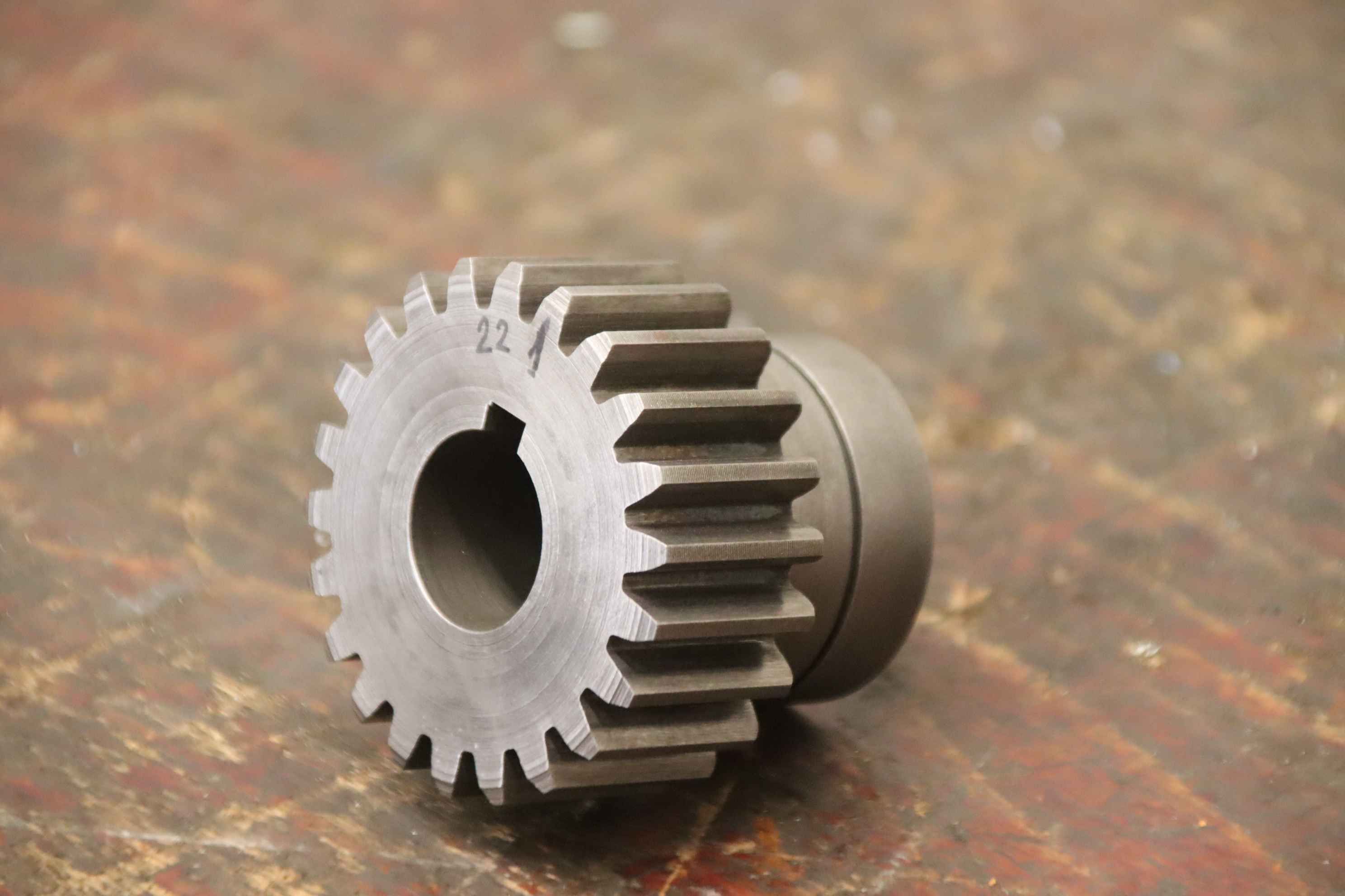 gear, gears, gear shaft, pinion shaft, spur gear, spur gear-Gear shaft: straight-toothed pinion shaft-Gear: Diameter Ø 60 mm / 22 teeth-Tooth width: 25 mm-Shaft mount: inside Ø 22 mm-Dimensions: see photo technical drawing-Number: 3x gear shaft available-Price: per piece-Total dimensions: Ø 60 x 50 mm-Weight: 0.6 kg/piece