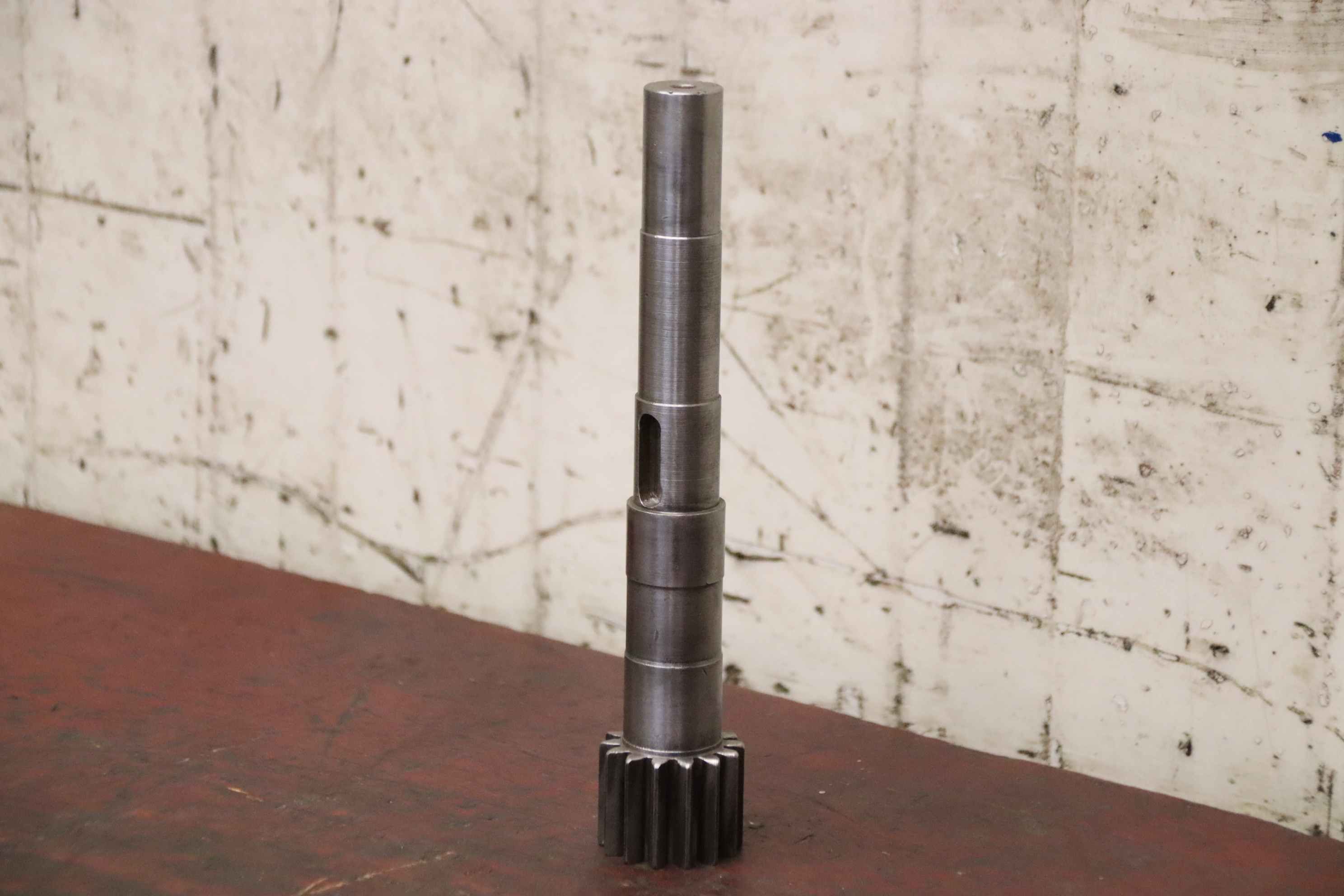 gear, gears, gear shaft, pinion shaft-Gear shaft: straight-toothed pinion shaft-Gear: Diameter Ø 42 mm / 14 teeth-Tooth width: 83 mm-Dimensions: see photo technical drawing-Number: 9x gear shaft available-Price: per piece-Total dimensions: Ø 42 x 220 mm-Weight: 0.9 kg/piece