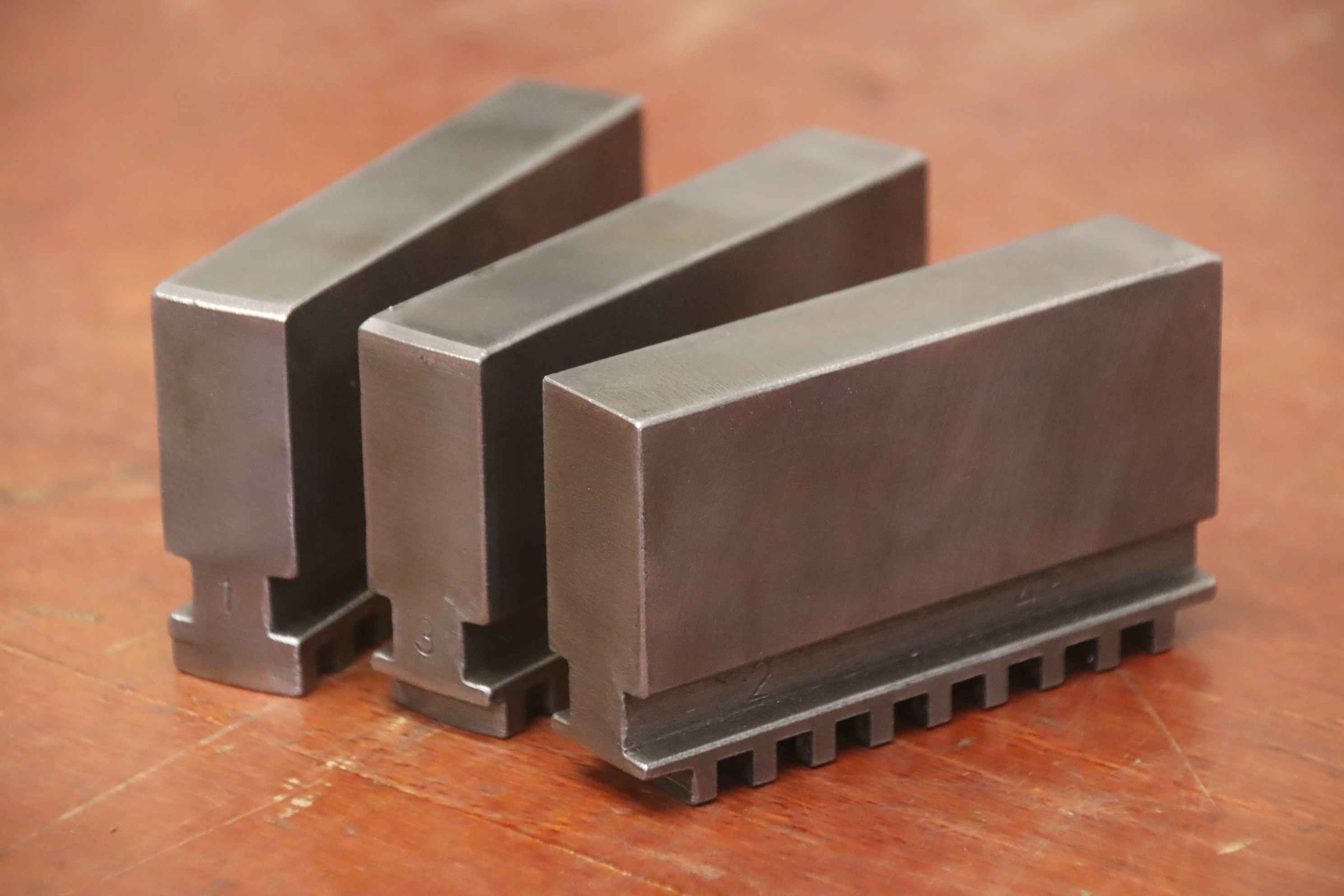 Interchangeable jaws, top jaws, three-jaw chuck, segment jaws, clamping jaws, stepped block jaws, stepped top jaws, block jaws, base jaws, 4-jaw set-Top jaws: Jaw set for three-jaw lathe chucks, hard-Jaw width: 30 mm-Dimensions: see photo techn. drawing-Total dimensions: 105/90/H75 mm-Total weight: 3,6 kg