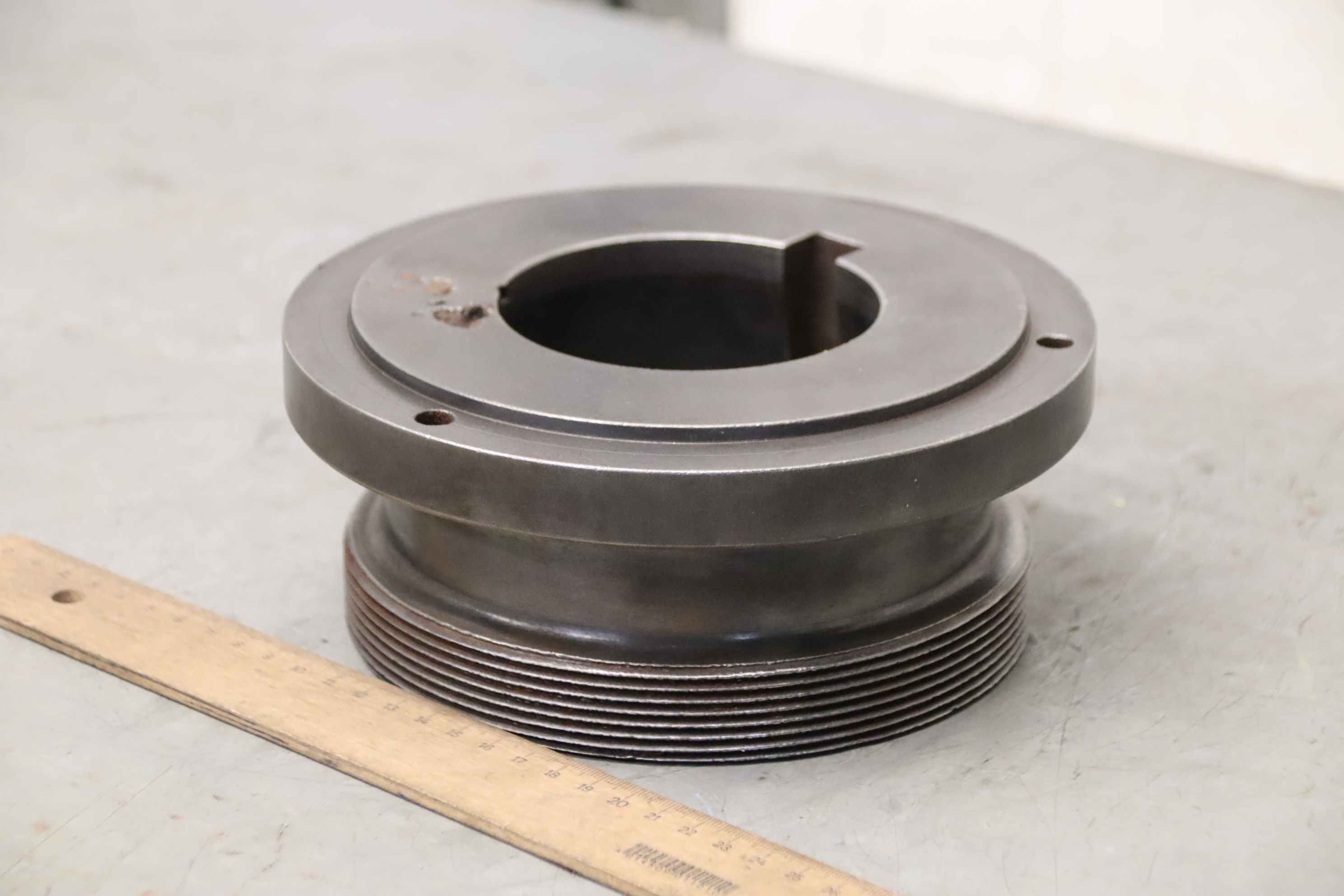 Chuck flange, flange mount, lathe chuck flange, driver flange-Chuck flange. driving flange-Outer diameter: 190mm-Intake: thread M165 x 3-Taper cone: Ø 90 to 110 mm, groove 80 x 16 mm-Bolt circle: Ø 171 x 8 mm-Dimension: Ø190 x 82 mm-Weight: 7.5 kg