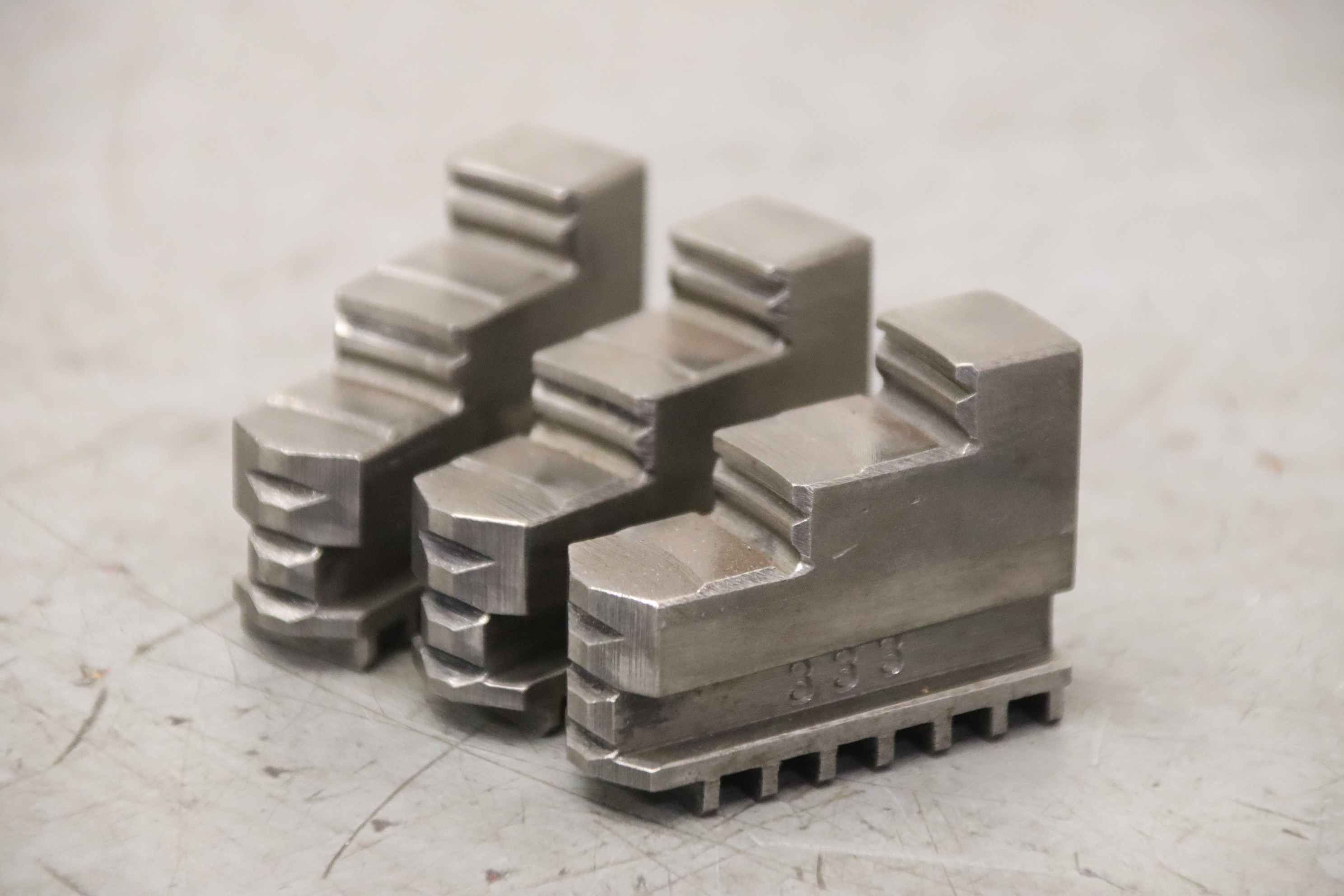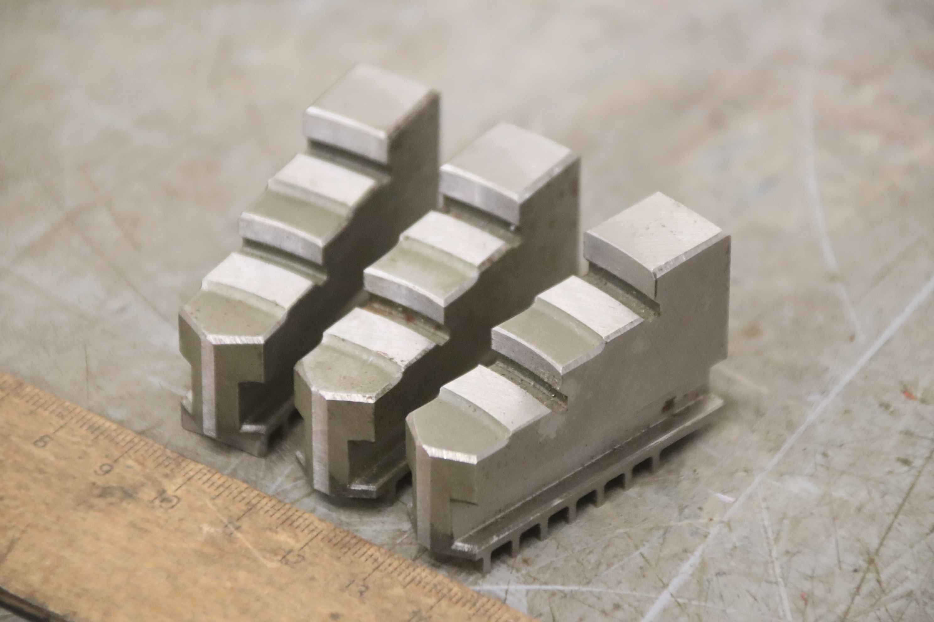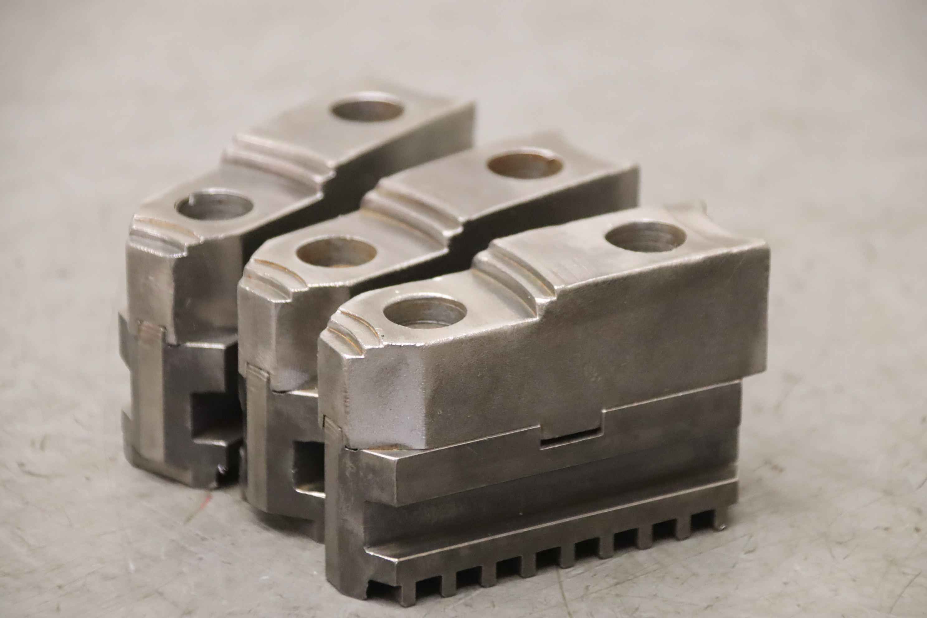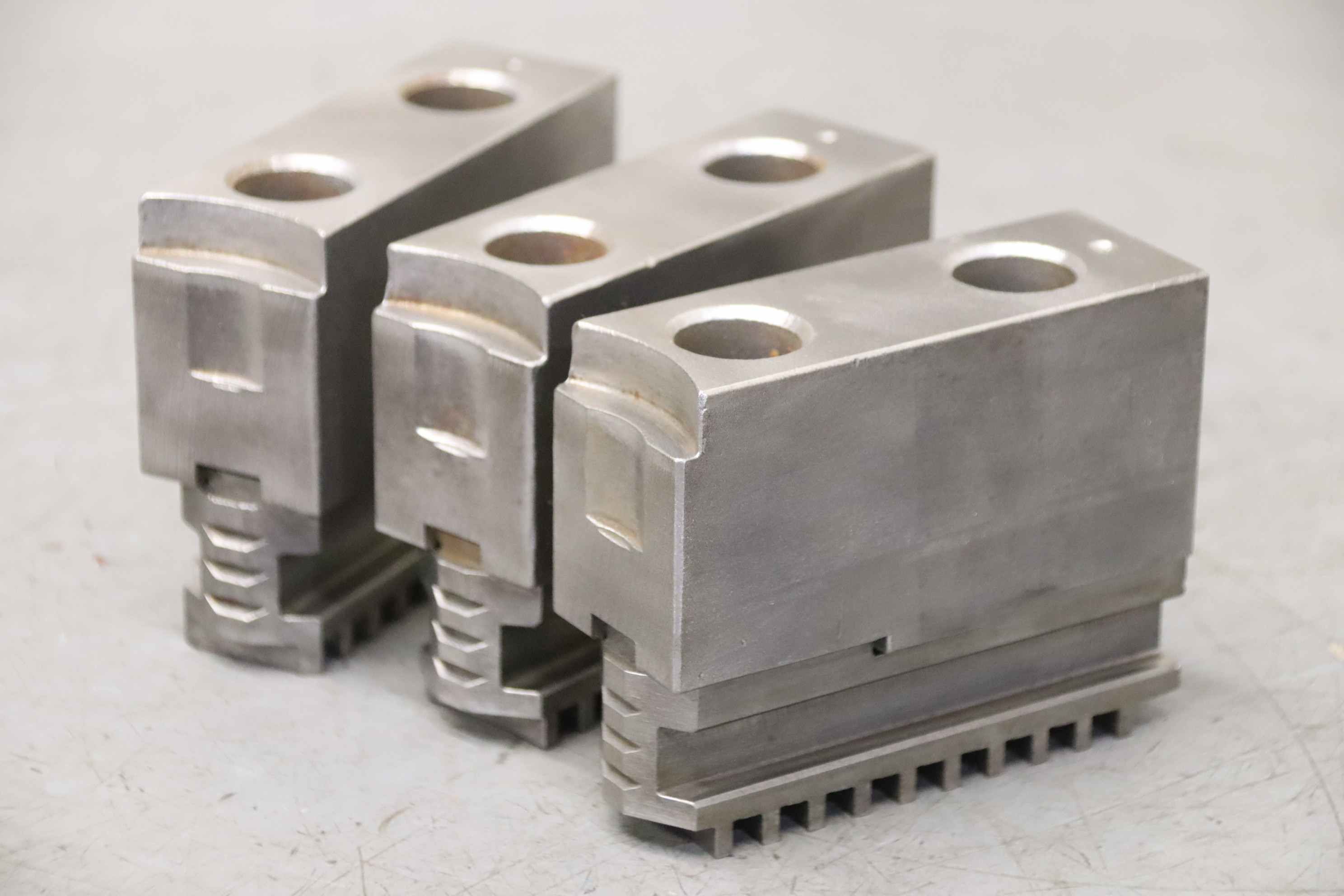 Interchangeable jaws, top jaws, three-jaw chucks, segment jaws, clamping jaws, step block jaws, step top jaws, block jaws, base jaws-Top jaws: Jaw set for three-jaw lathe chucks, soft-Jaw width: 26 mm-Dimensions: see photo technical. drawing-Total dimensions: 83/75/H55 mm-Total weight: 2,0 kg