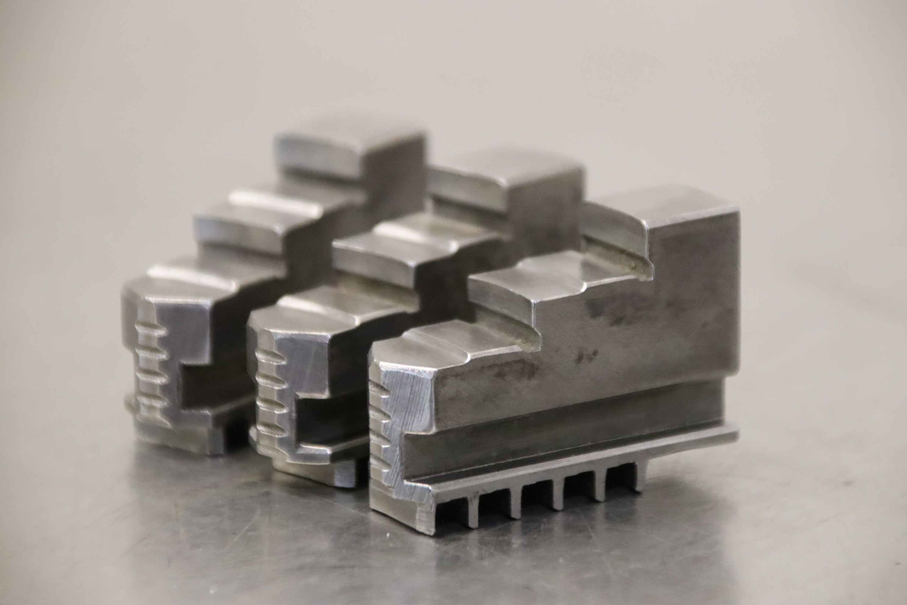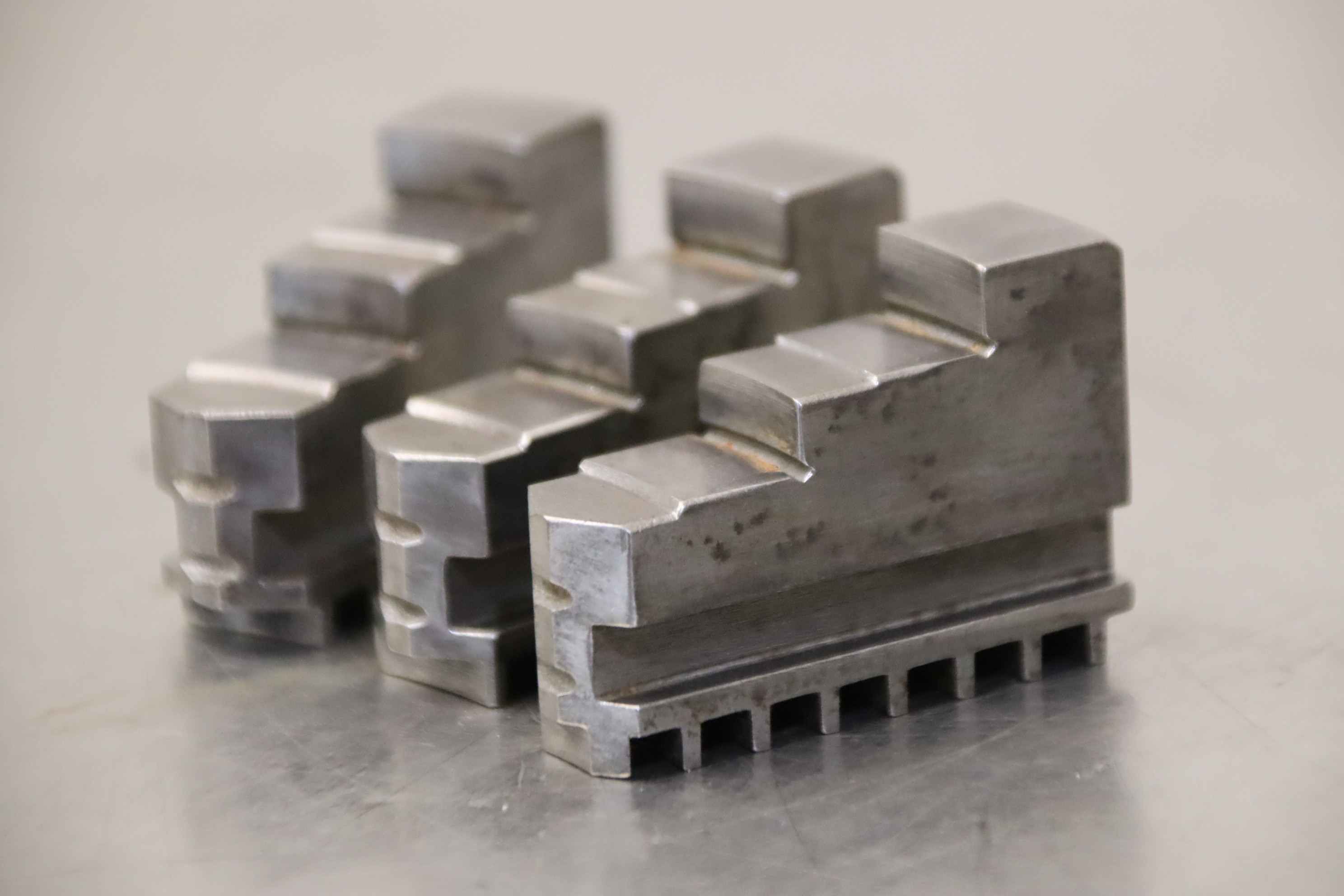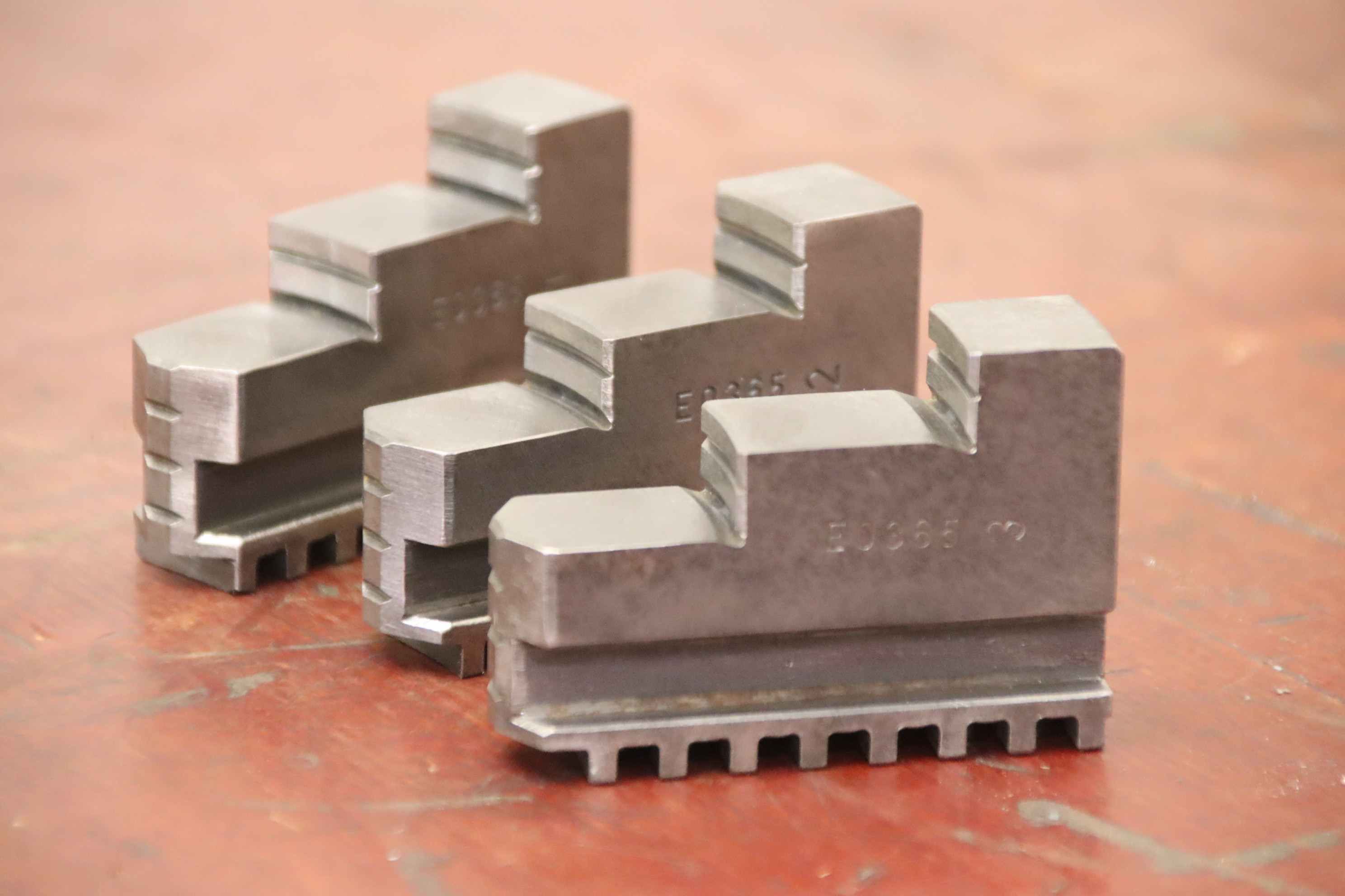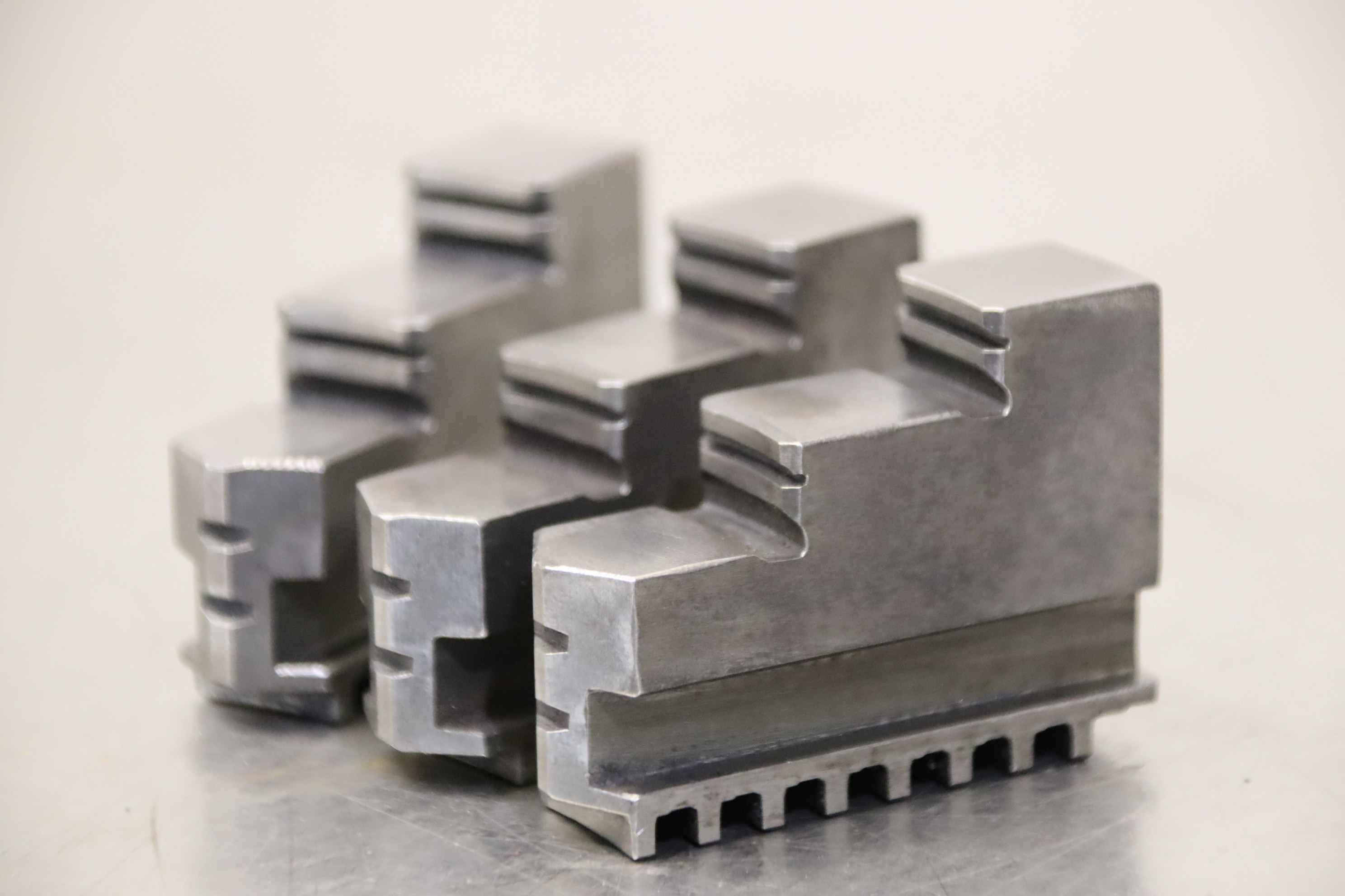Interchangeable jaws, top jaws, three-jaw chucks, segment jaws, clamping jaws, step block jaws, step top jaws, block jaws, base jaws, 4-jaw set-Top jaws: Jaw set for three-jaw lathe chucks, hard-Jaw width: 20 mm-Dimensions: see photo technical. drawing-Total dimensions: 70/60/H55 mm -Total weight: 1.1 kg