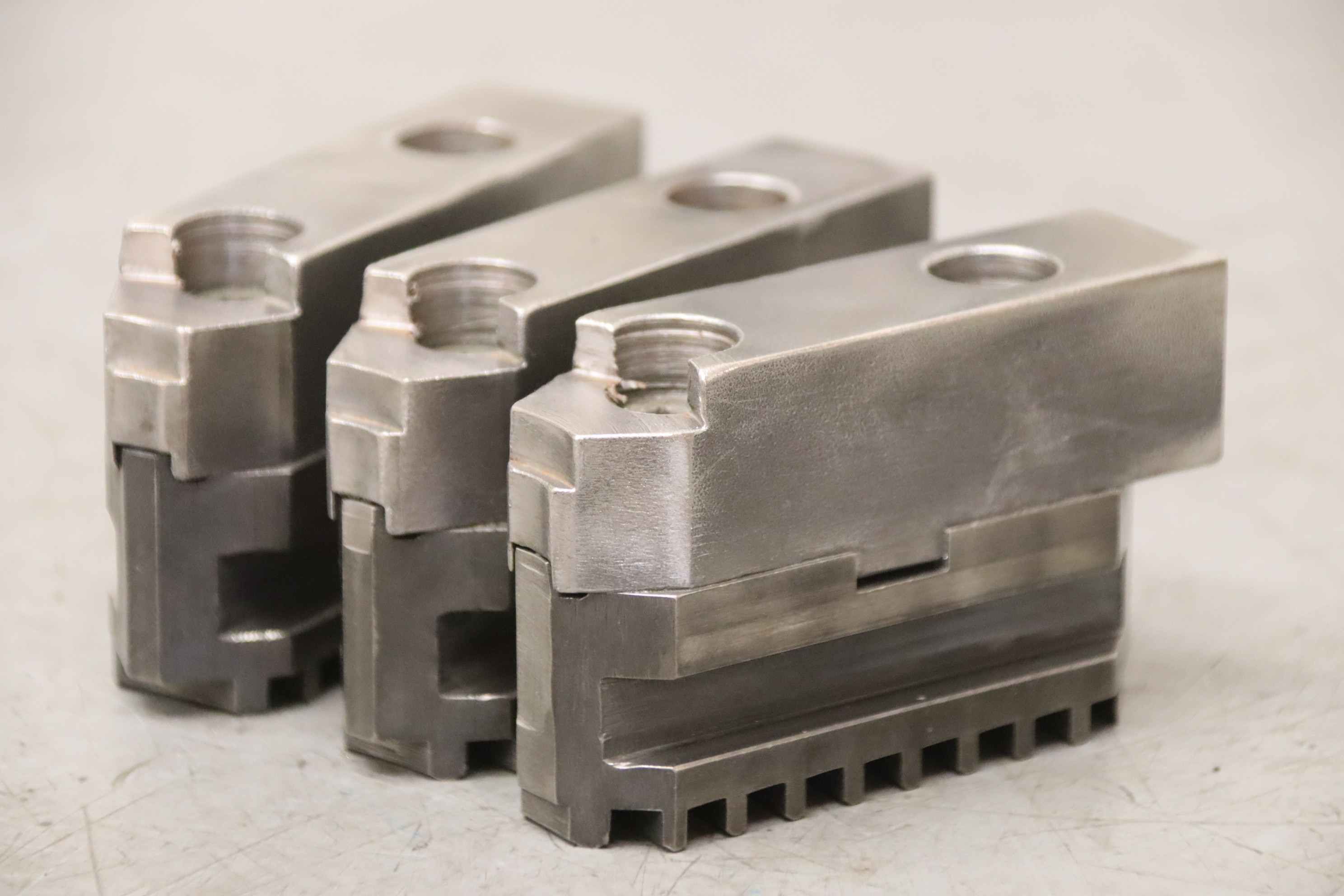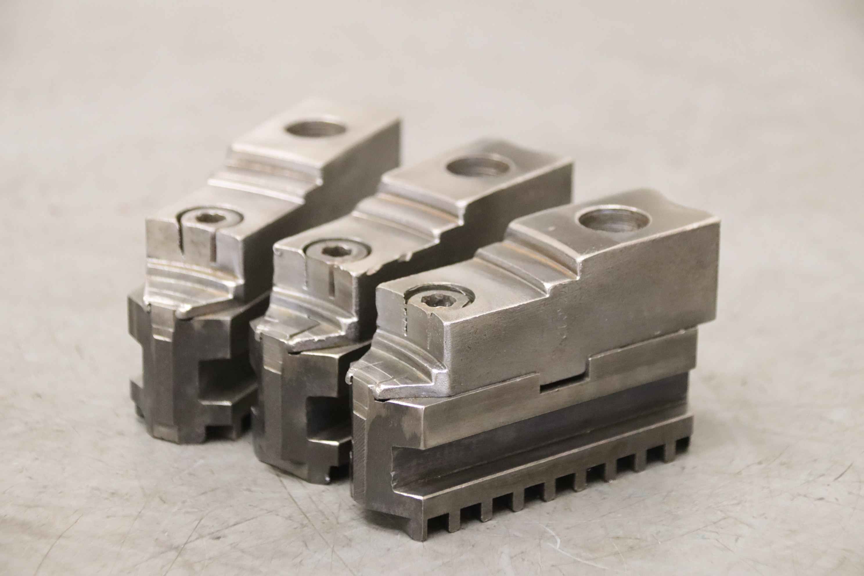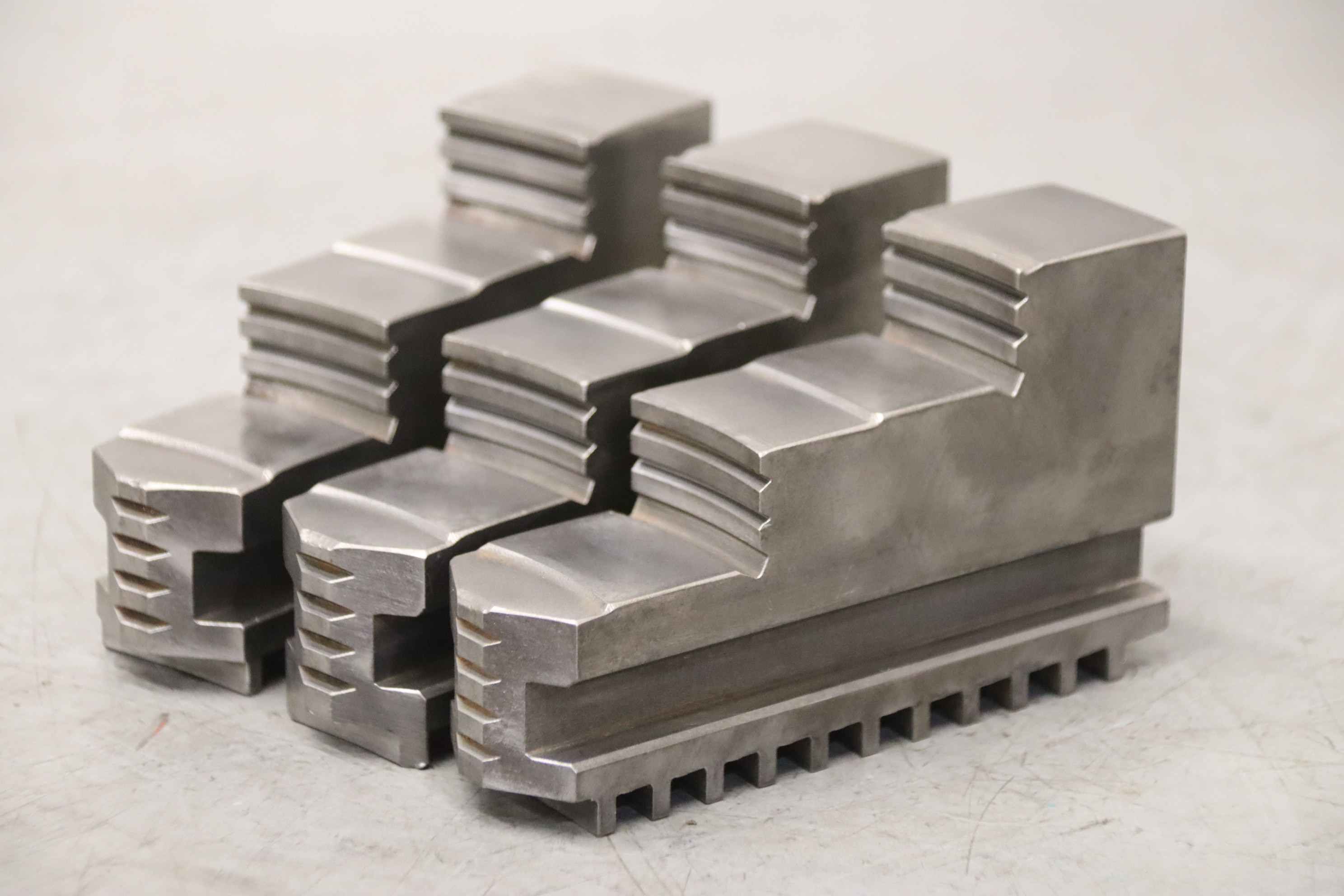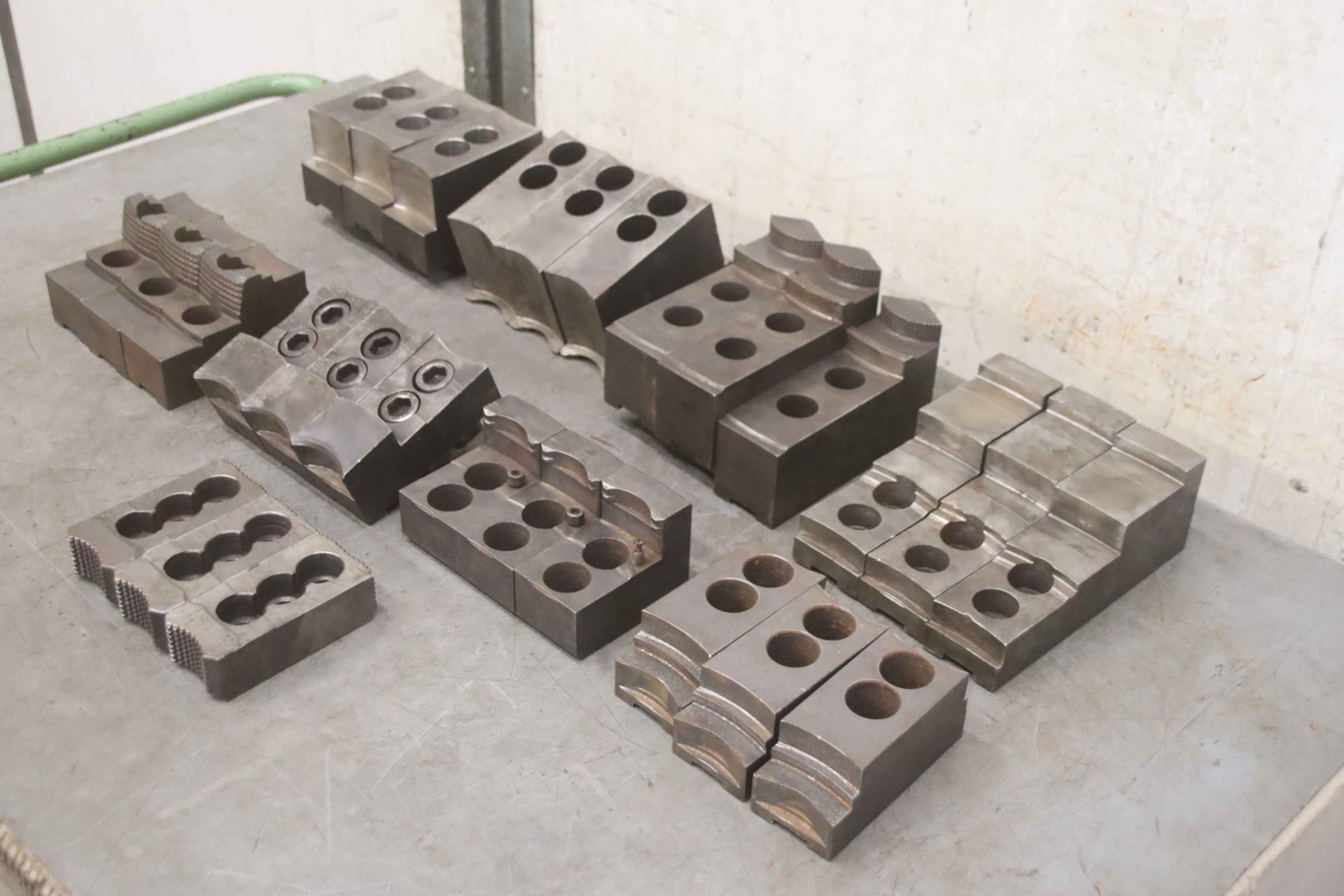 Interchangeable jaws, top jaws, three-jaw chucks, segment jaws-Top jaws: for power chucks-2 set: hard jaws-7 set: soft jaws-Dimensions: see photos / technical. drawing-Price/sale: only complete-Transport dimensions: 700/450/H120 mm-Weight: 101.6 kg