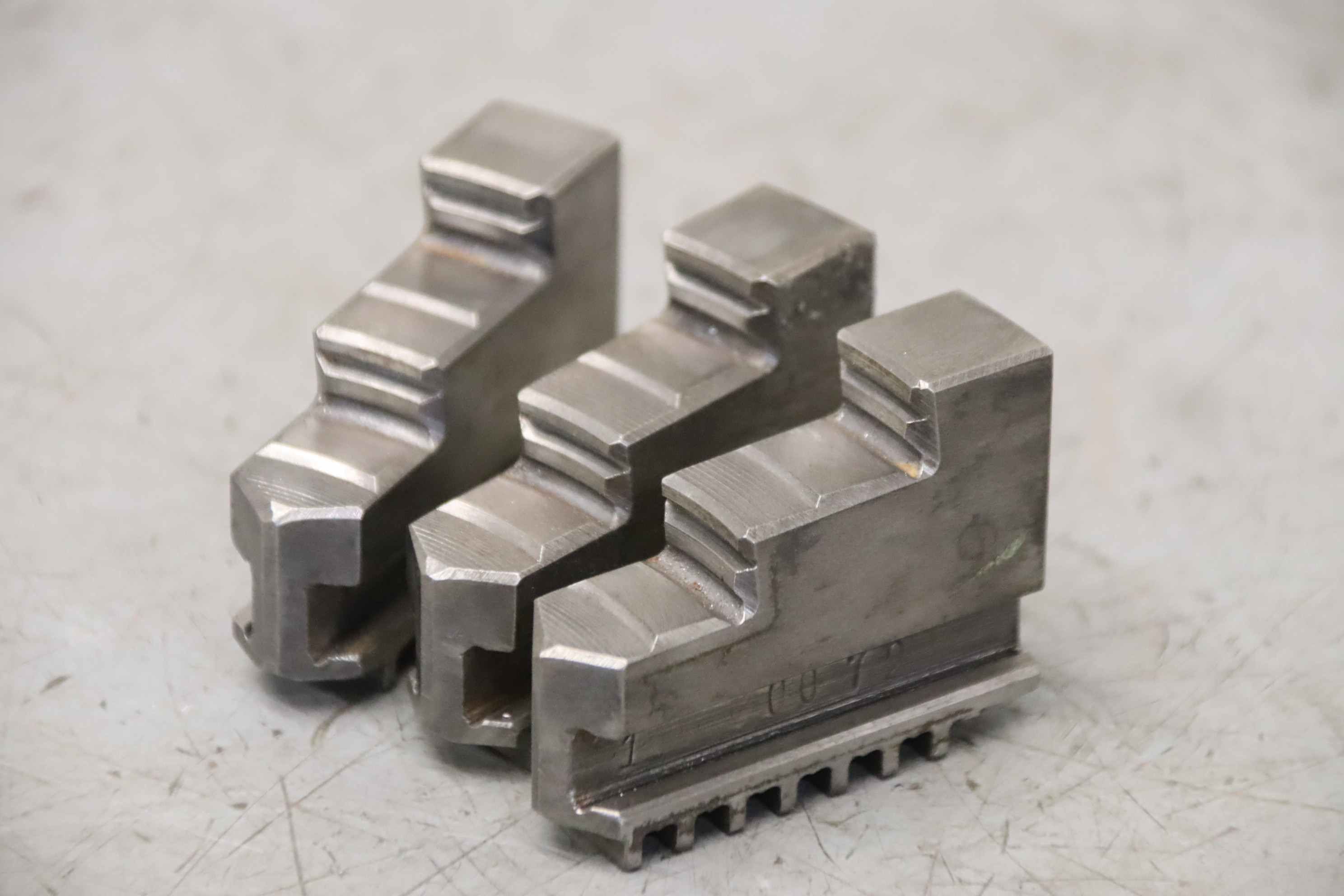 Interchangeable jaws, top jaws, three-jaw chucks, segment jaws, clamping jaws, step block jaws, step top jaws, block jaws, base jaws-Top jaws: Jaw set for three-jaw lathe chucks, hard-Jaw width: 32 mm-Dimensions: see photo technical. drawing-Total dimensions: 125/96/H73 mm-Total weight: 4.1 kg