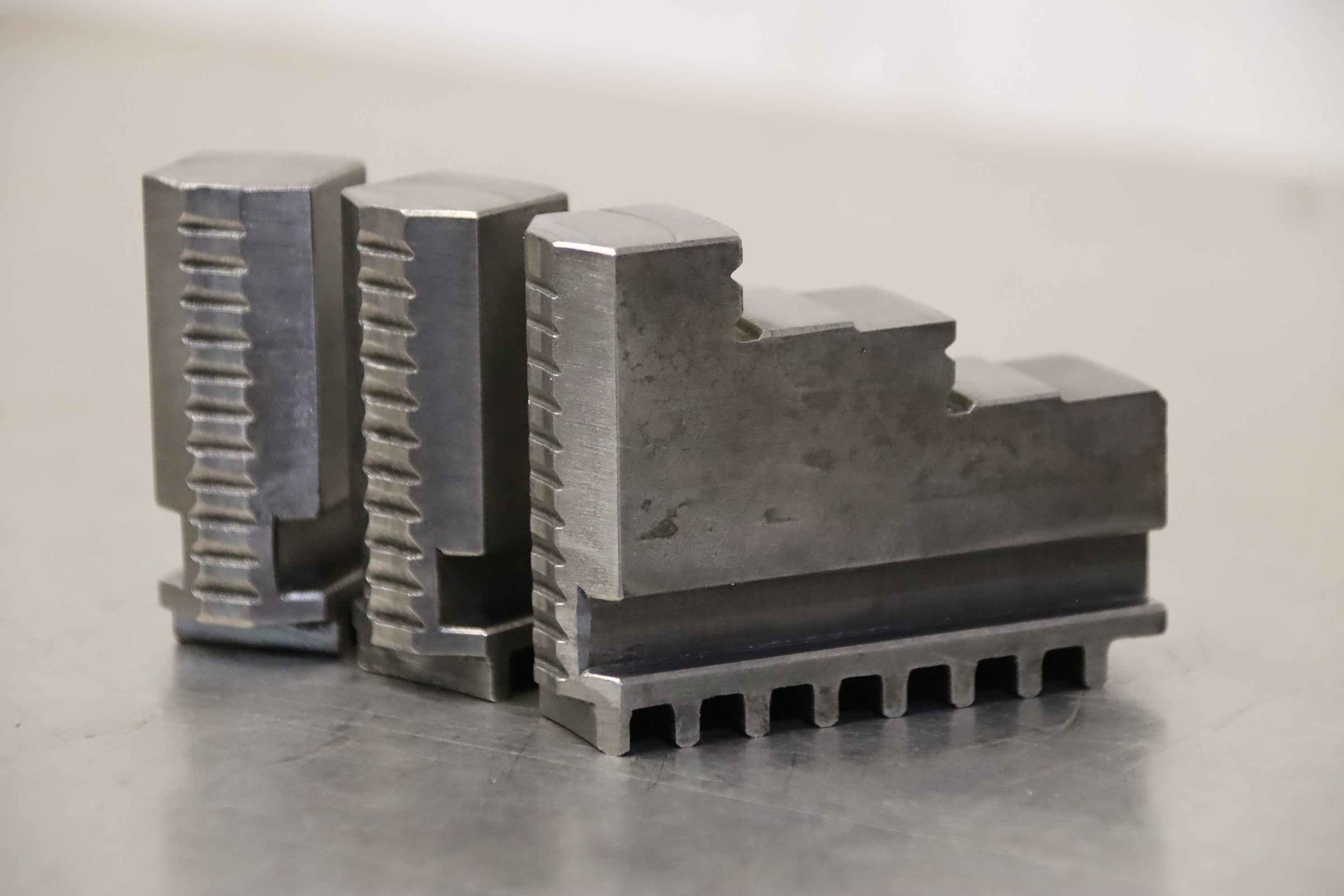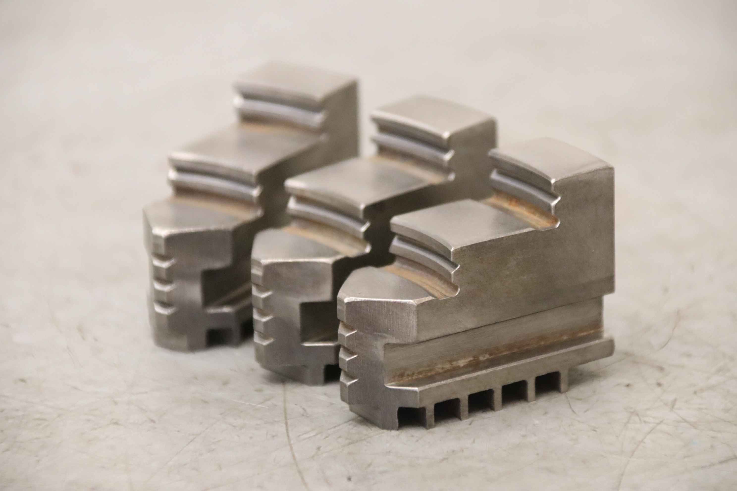 Interchangeable jaws, top jaws, three-jaw chuck, segment jaws, clamping jaws, stepped block jaws, stepped top jaws, block jaws, base jaws, 4-jaw set-Top jaws: Jaw set for three-jaw lathe chucks, hard-Jaw width: 14 mm-Dimensions: see photo techn. drawing-Total dimensions: 50/40/H35 mm-Total weight: 0,3 kg