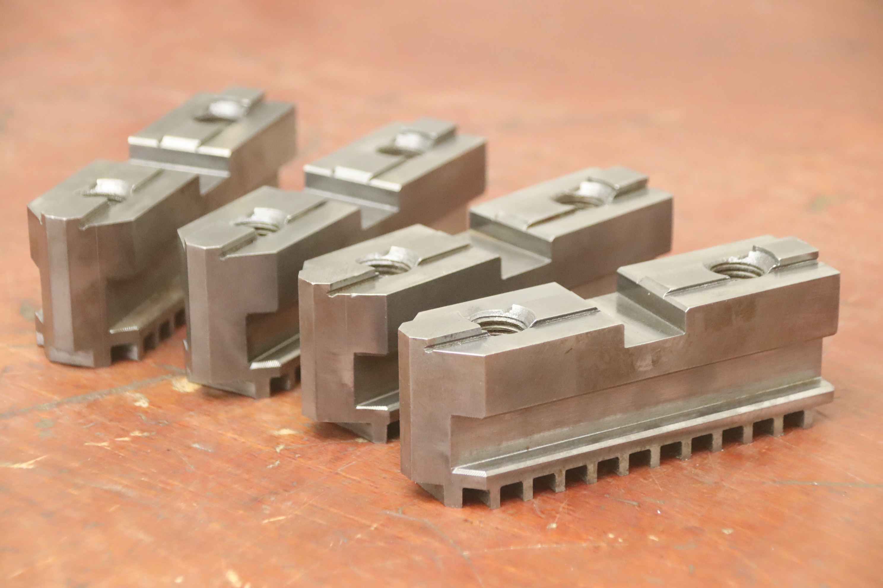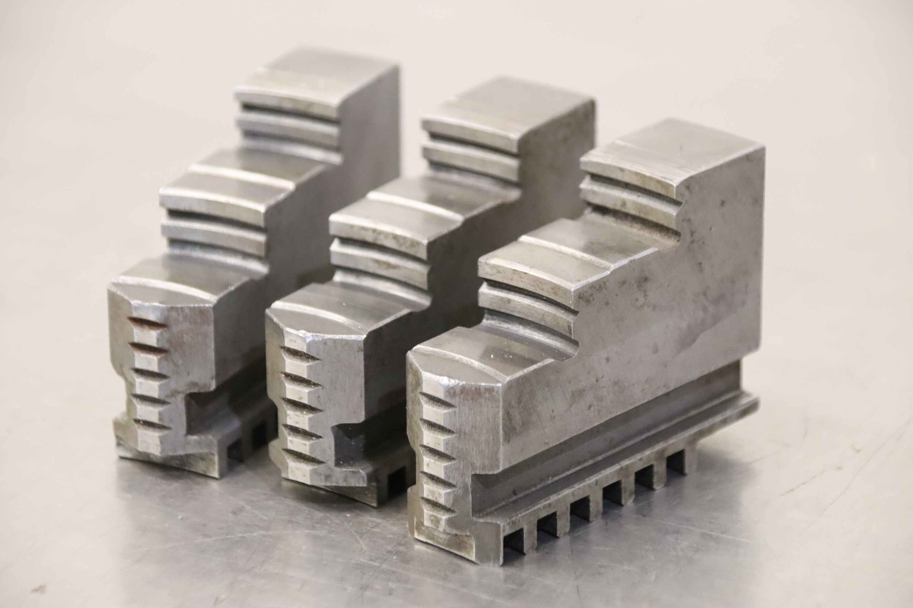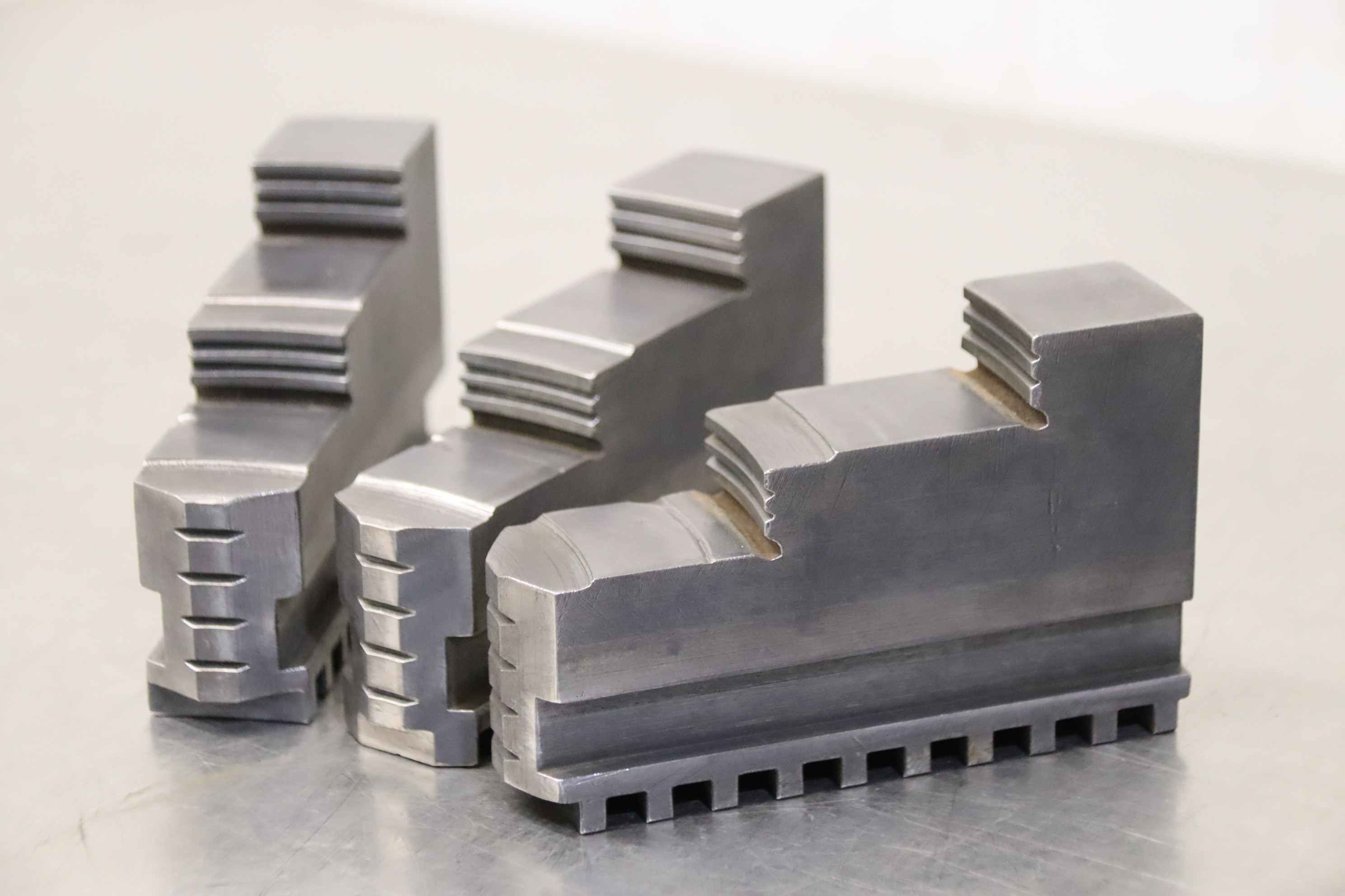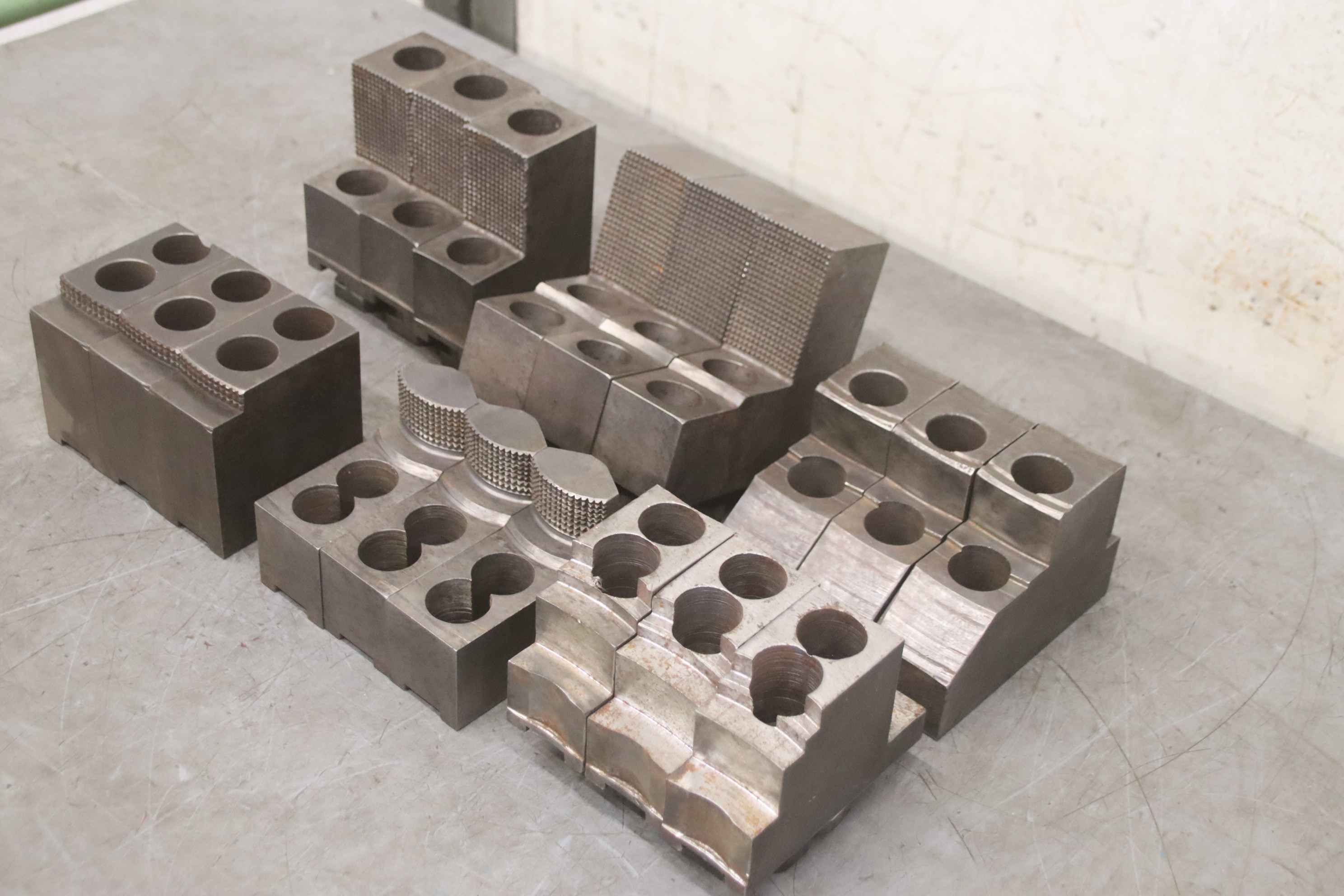 Interchangeable jaws, top jaws, three-jaw chucks, segment jaws-Top jaws: for power chucks-4 set: hard jaws-2 set: soft jaws-Dimensions: see photos / technical. drawing-Price/sale: only complete-Transport dimensions: 480/320/H150 mm-Weight: 57.5 kg