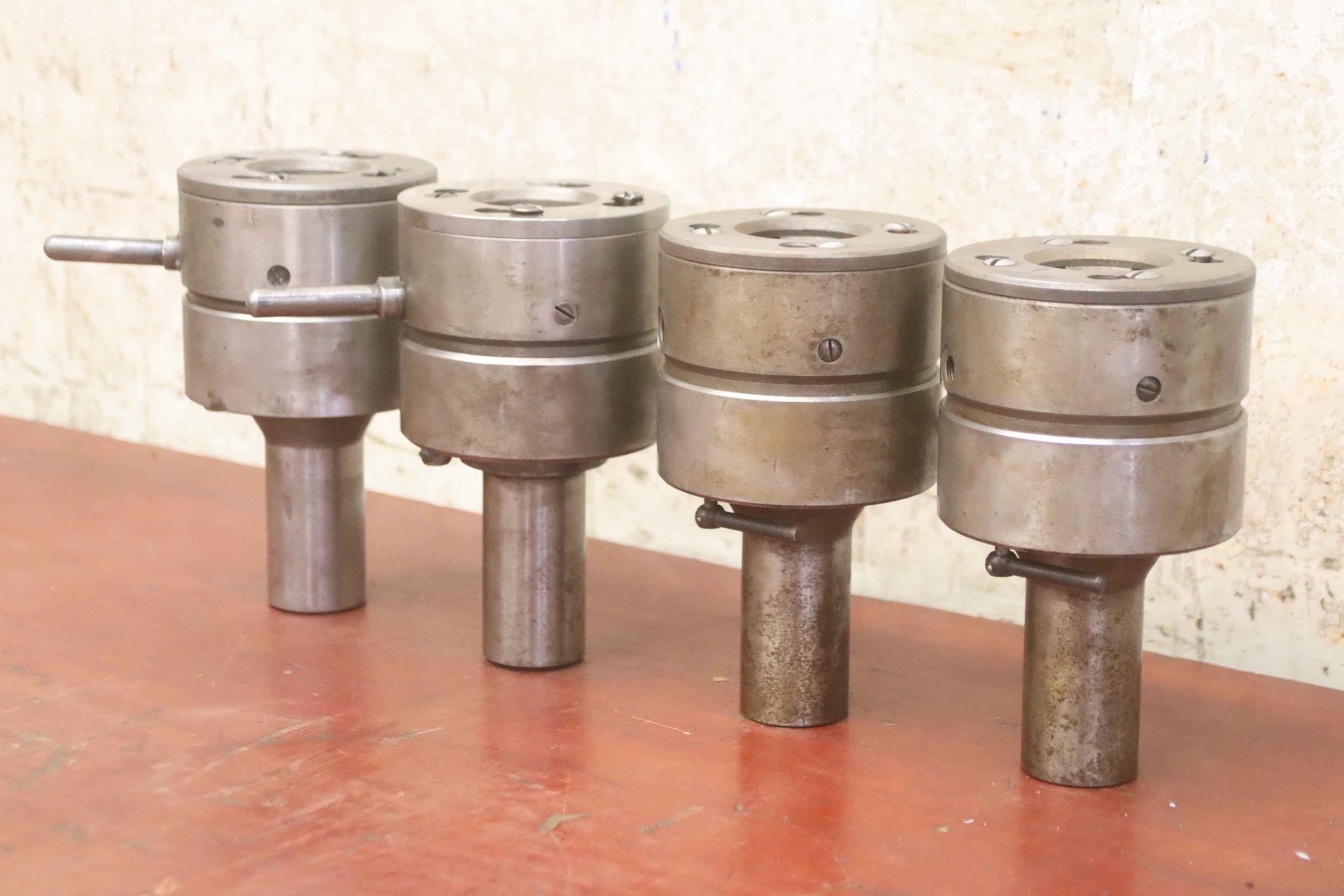 Thread cutting head, thread cutting chuck, thread chuck, tap chuck, milling tool, thread cutting apparatus-Manufacturer: DL, self-opening thread cutting heads 4 pieces-Type: Model A4-Size: M18 x 1.75 1 piece-Size: M15 x 2 1 piece-Size: Ø 30 mm 2 pieces-Shaft: Ø 40 mm-Price/tax: complete-Transport dimensions: 230/230/H180 mm-Weight: 20 kg
