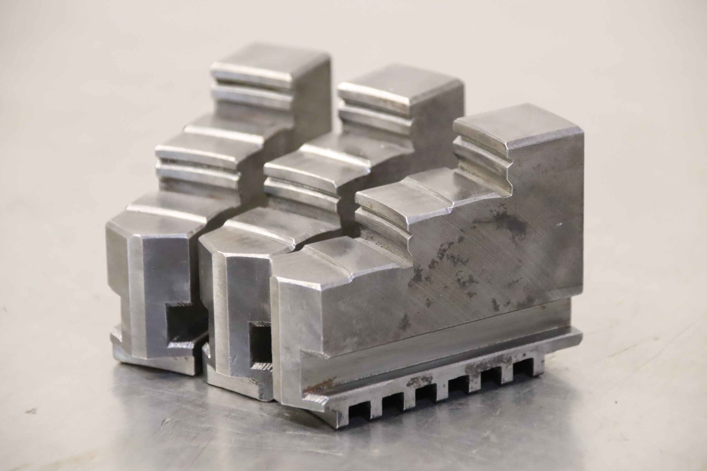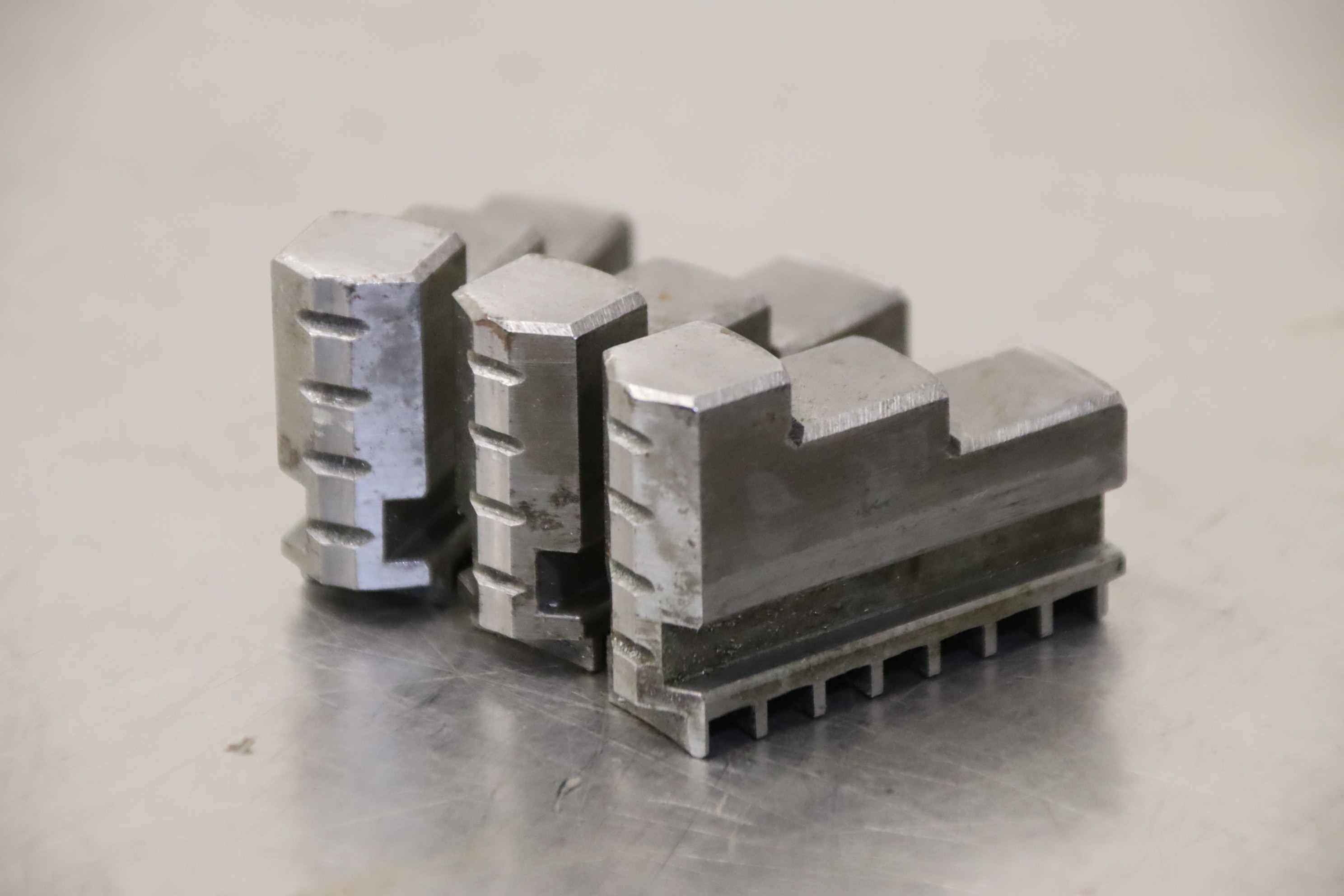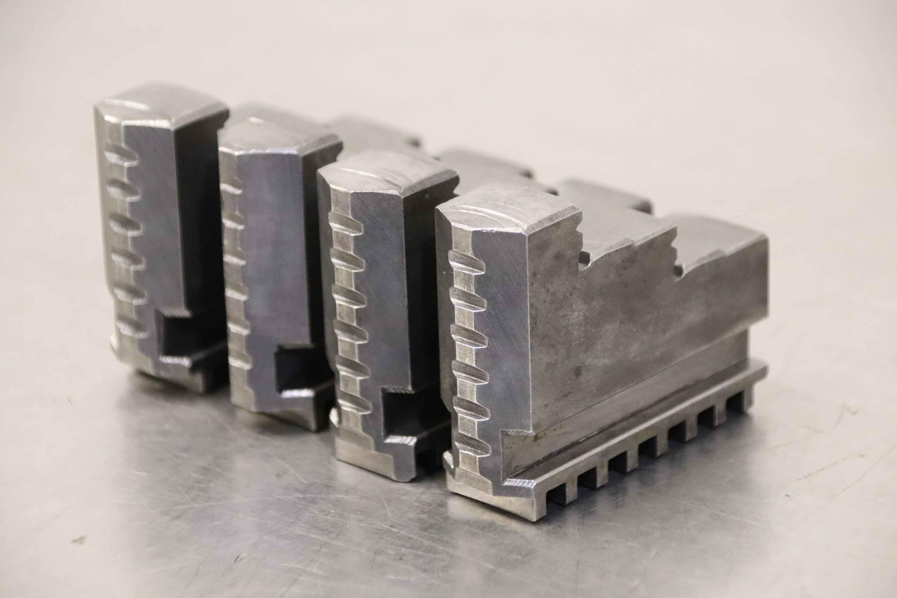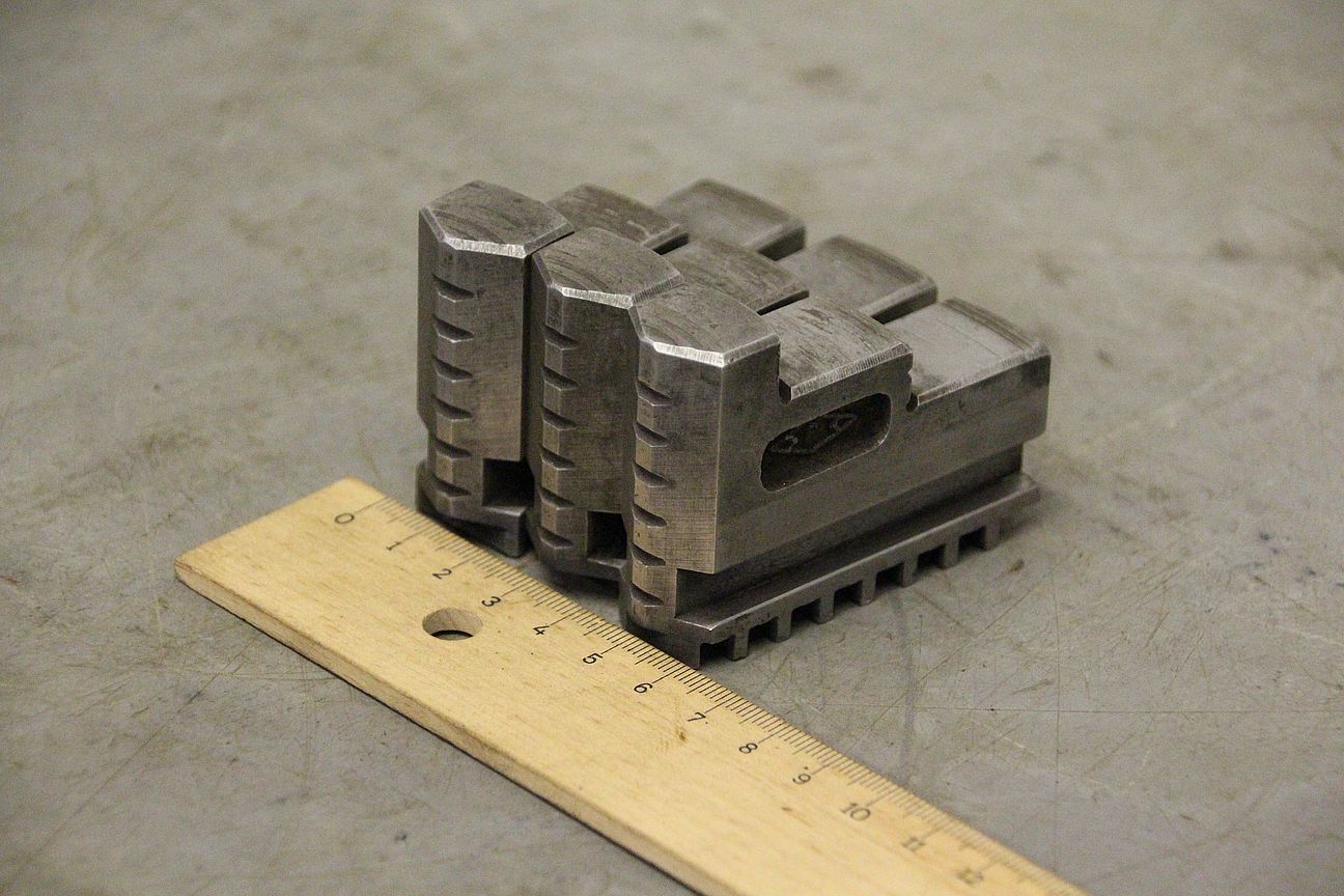 Interchangeable jaws, top jaws, three-jaw chuck, segment jaws, clamping jaws, stepped block jaws, stepped top jaws, block jaws, base jaws, 4-jaw set-Top jaws: Jaw set for three-jaw lathe chucks, hard-Jaw width: 28 mm-Dimensions: see photo techn. drawing-Total dimensions: 115/85/H75 mm-Total weight: 3,7 kg