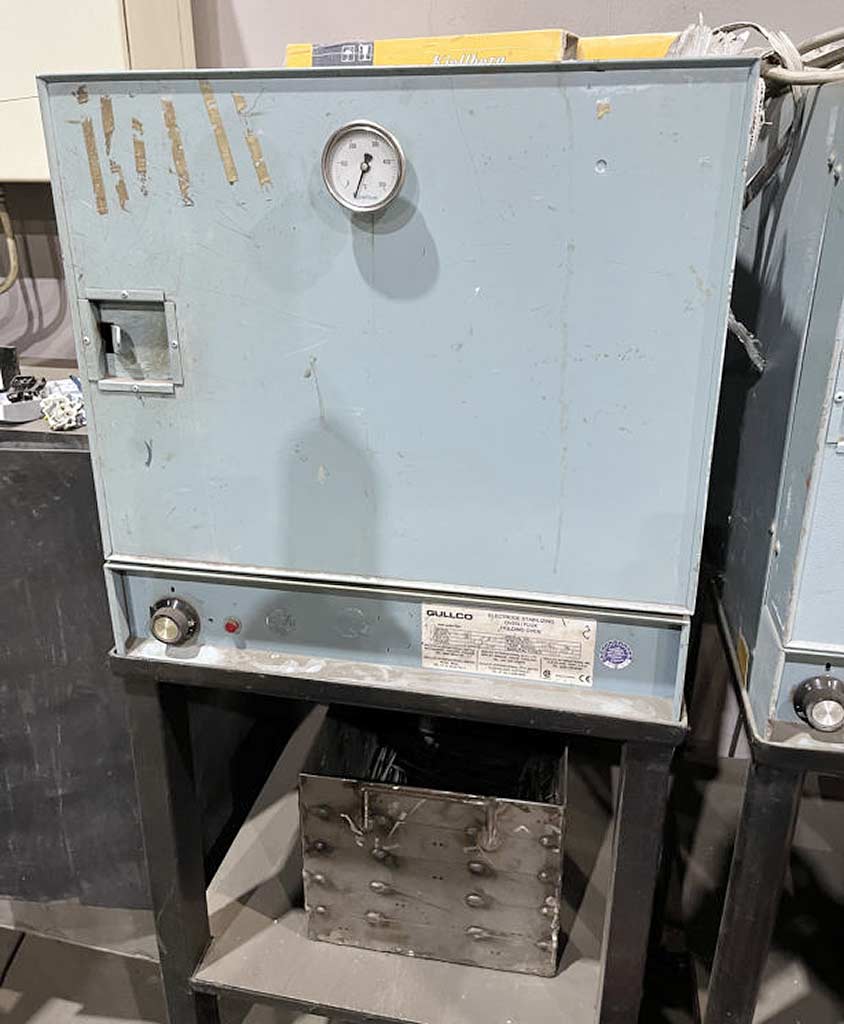 Dostępne są trzy identyczne piece elektrodowe Gullco do suszenia i stabilizacji elektrod spawalniczych. Wymiary wewnętrzne X/Y/Z: ok. 350mm/400mm/480mm, max. długość elektrody: 450mm, max. temperatura: 550C, pobór mocy: 1,5kW, wymiary maszyny X/Y/Z: ok. 560mm/560mm/620mm, waga: ok. 160kg. Dostępna dokumentacja. Możliwa jest wizja lokalna.
