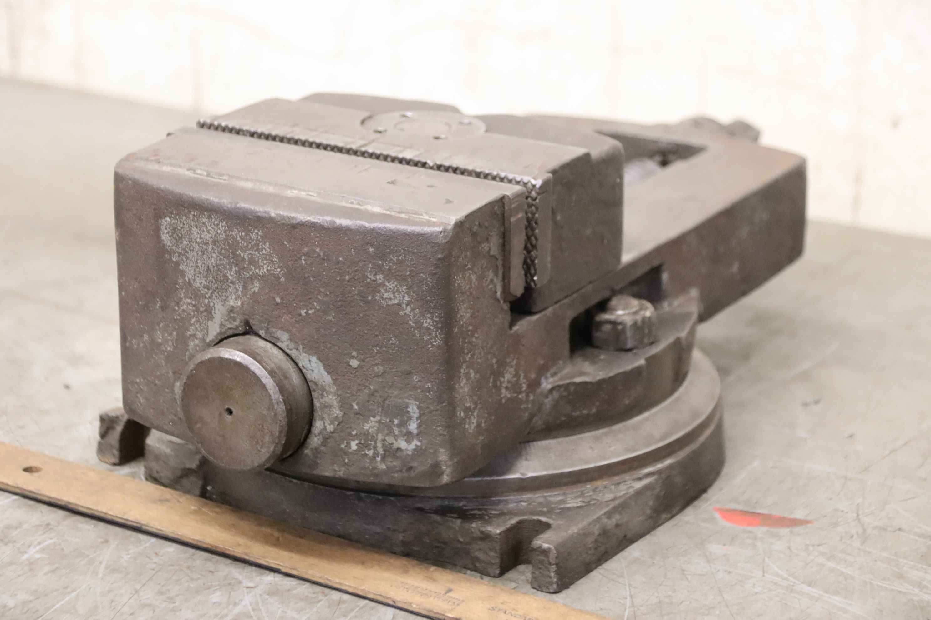 Machine vise, heavy duty vise, drill press vise-Handover: in the current condition as seen-Base plate: See photos for damage-Machine vice: rotatable, clamping jaws 160 x 40 mm-Clamping depth: 185 mm-Dimensions: 445/225/H145 mm-Weight: 33 kg