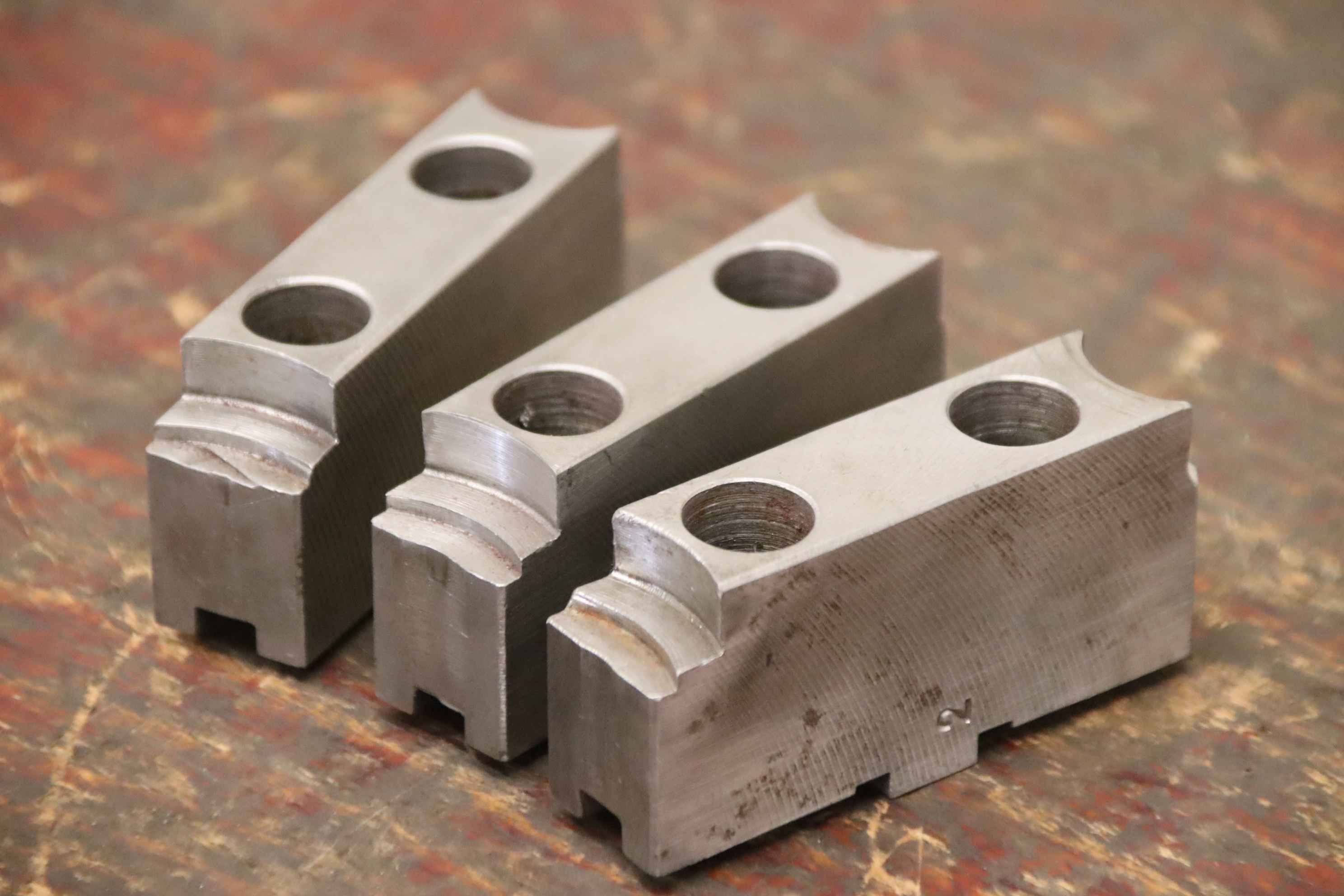 Interchangeable jaws, top jaws, three-jaw chucks, segment jaws, clamping jaws, step block jaws, step top jaws, block jaws, base jaws, 4-jaw set-Top jaws: 4-piece hard rotating jaw set-Jaw width: 21 mm-Dimensions: see photo technical. drawing-Quantity: 2 sets of interchangeable jaws available-Price: per set-Total dimensions: 76/85/H53 mm / 77/85/H51 mm-Total weight: 1.6 kg / 1.5 kg