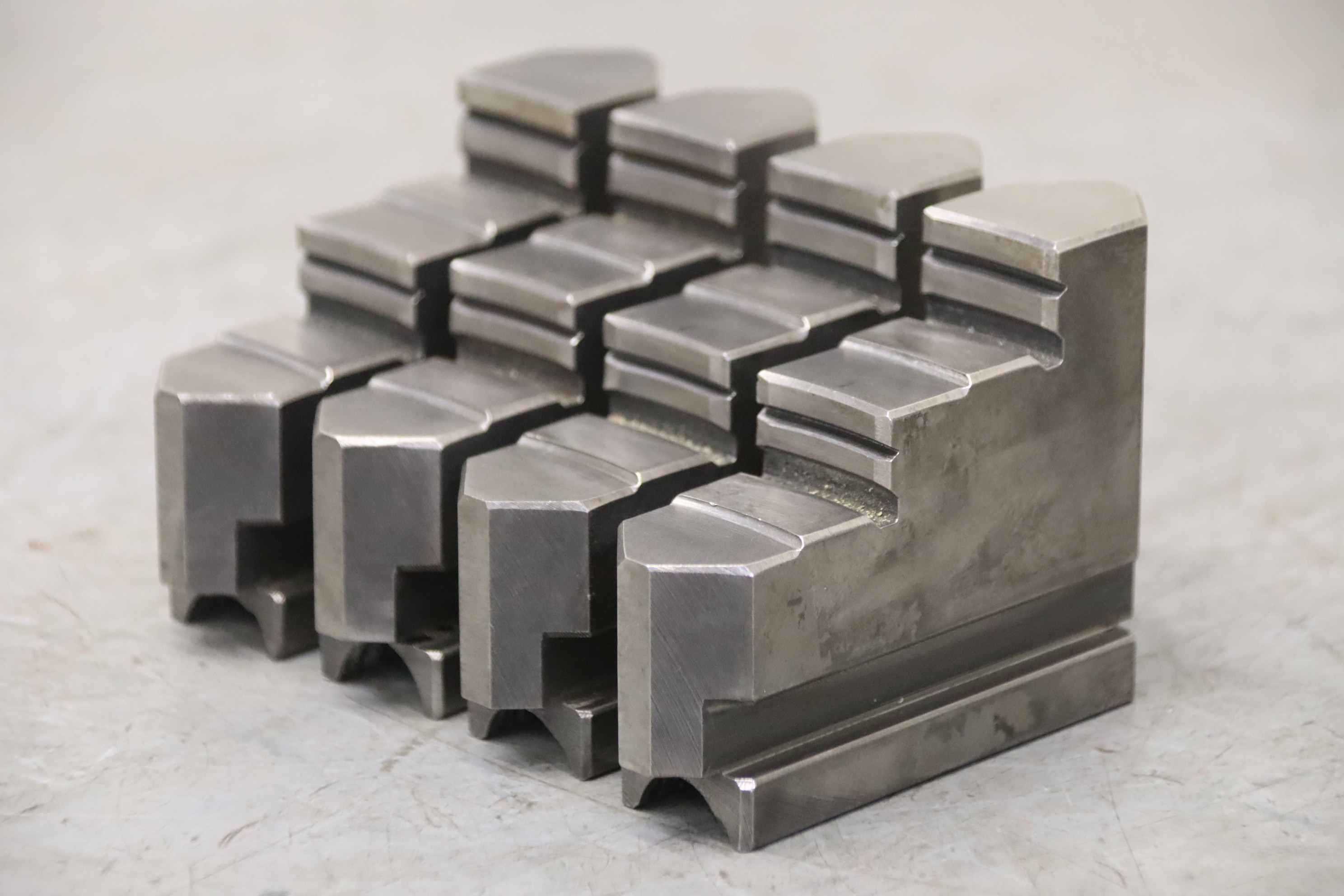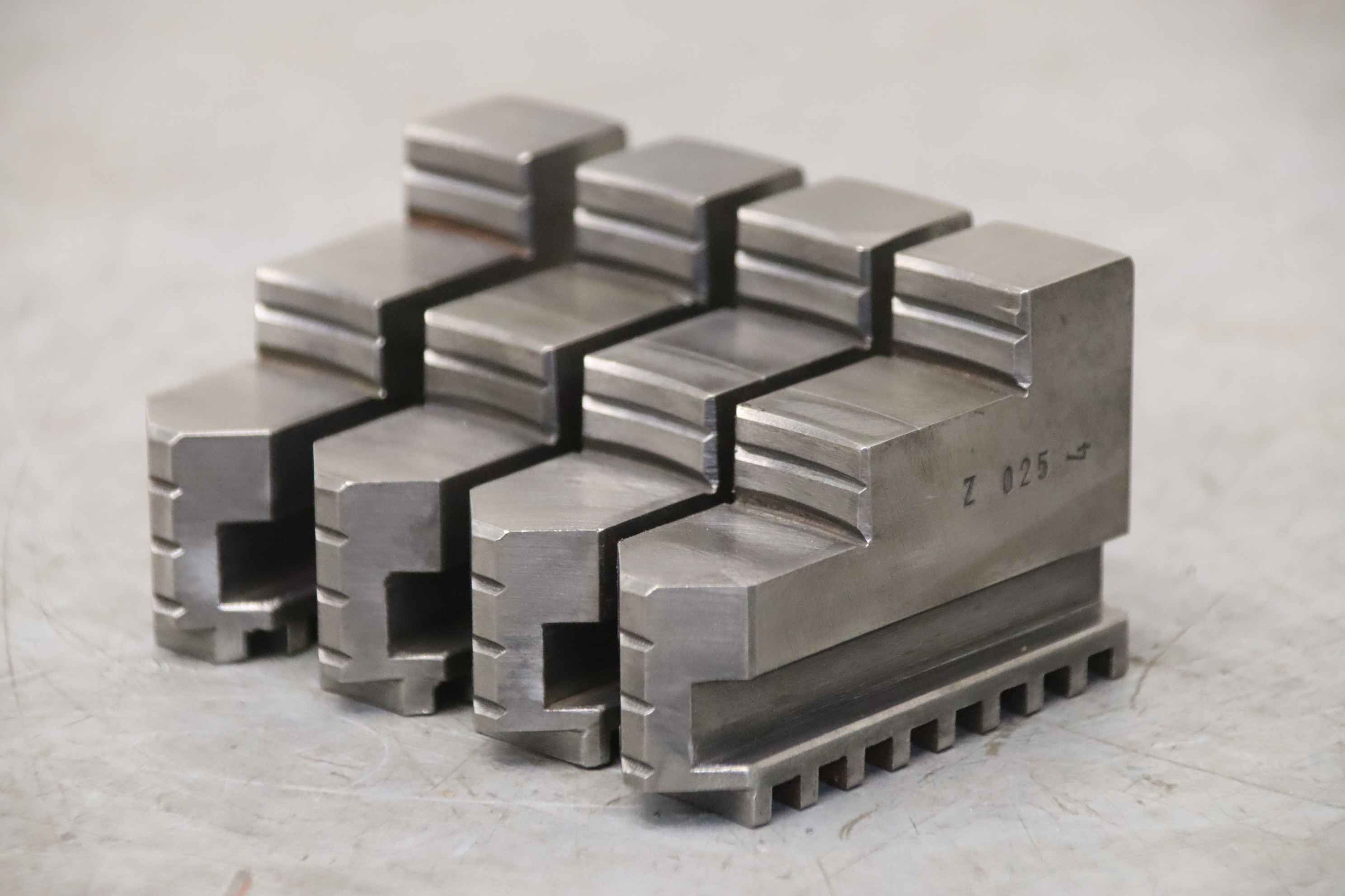 Interchangeable jaws, top jaws, three-jaw chucks, segment jaws, clamping jaws, step block jaws, step top jaws, block jaws, base jaws, 4-jaw set-Top jaws: Turning jaw set, 4-piece, hard-Jaw width: 24 mm-Dimensions: see photo techn. drawing-Dimensions: 90/96/H68 mm-Total weight: 2.7 kg