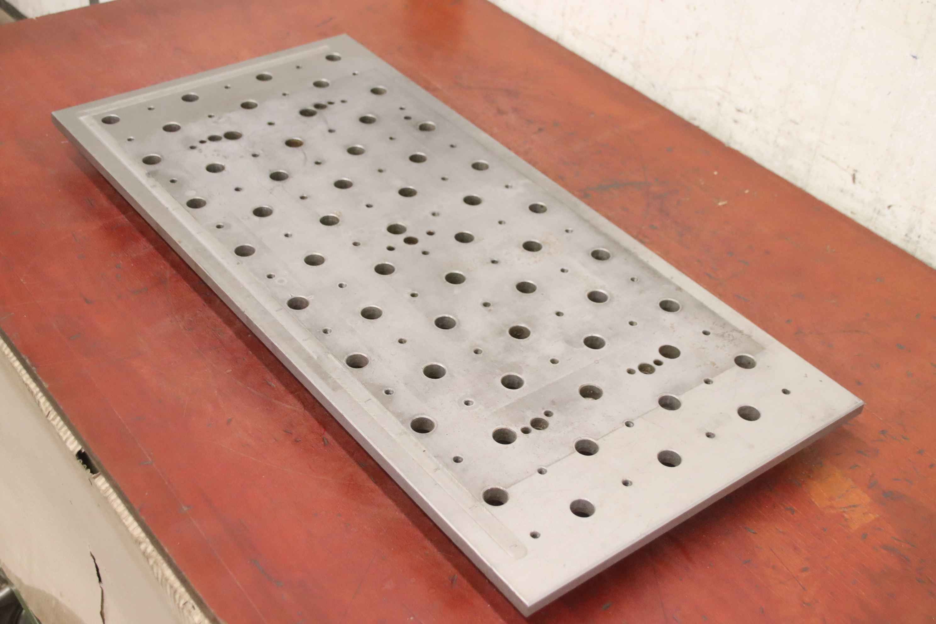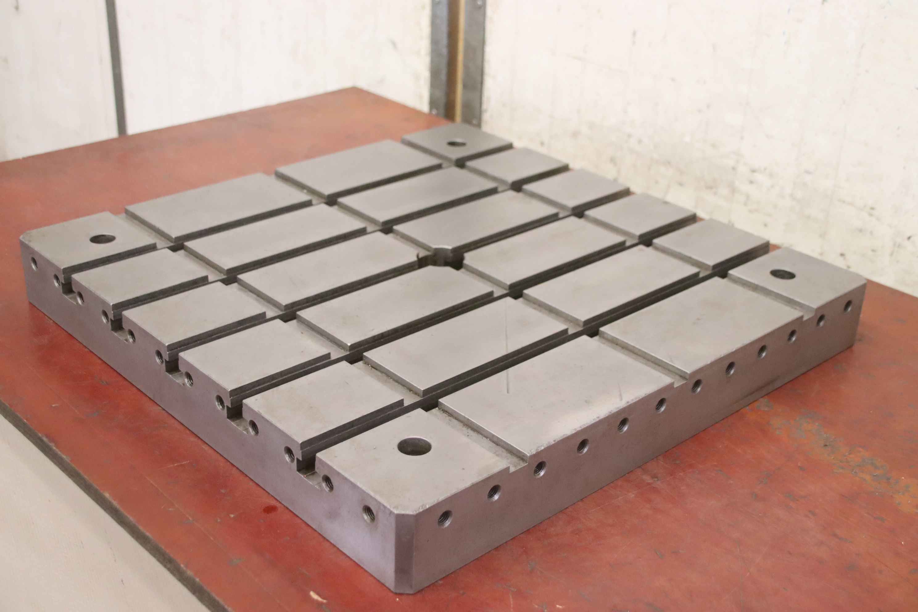 Clamping plate, marking plate, measuring plate, measuring table, welding table, welding table, straightening plate-Clamping plate: clamping area: 850 x 400 mm-Holes: Ø 20 mm-Threaded holes: M8-Dimensions: 850/400/H17 mm-Weight: 41kg