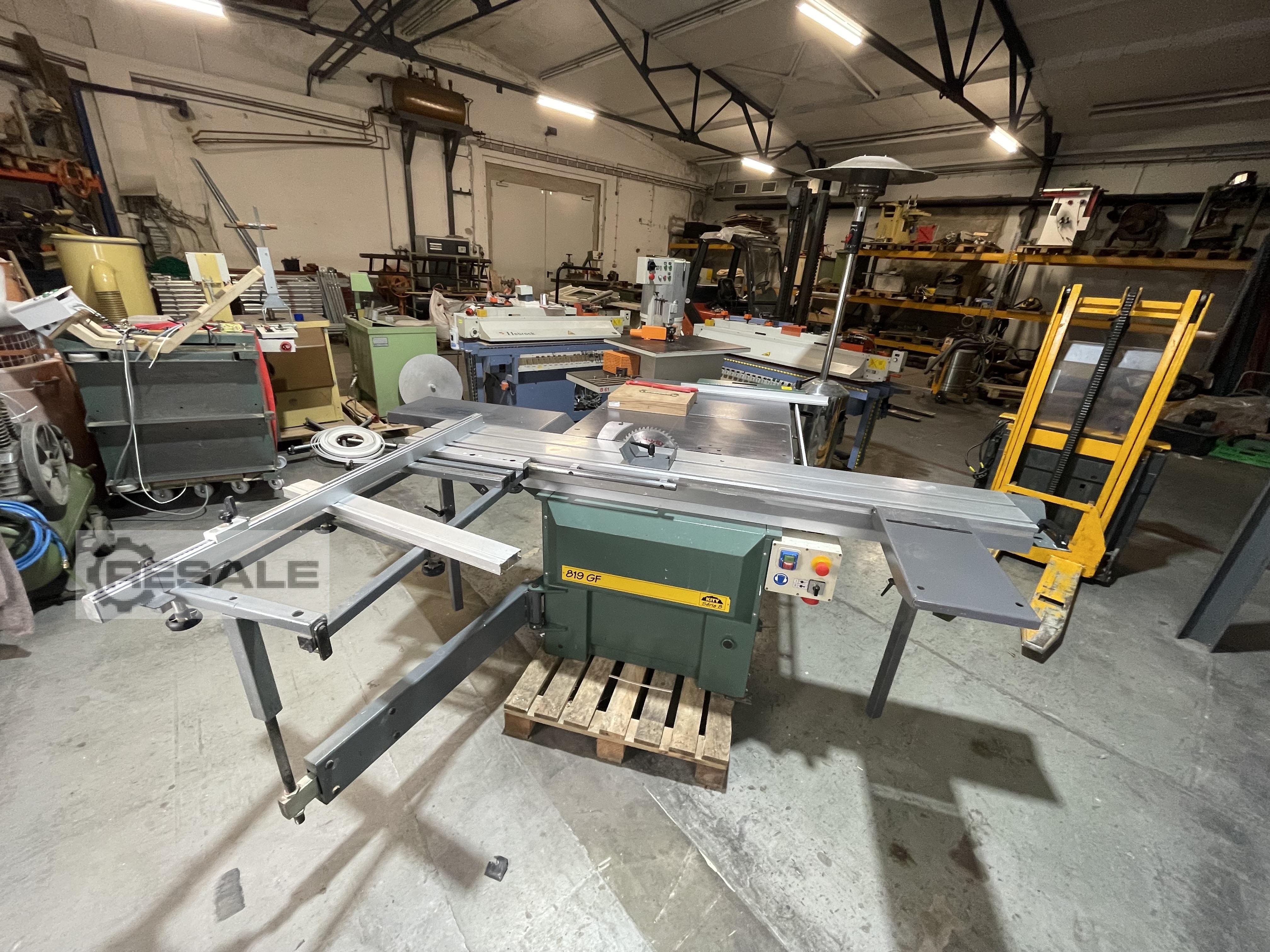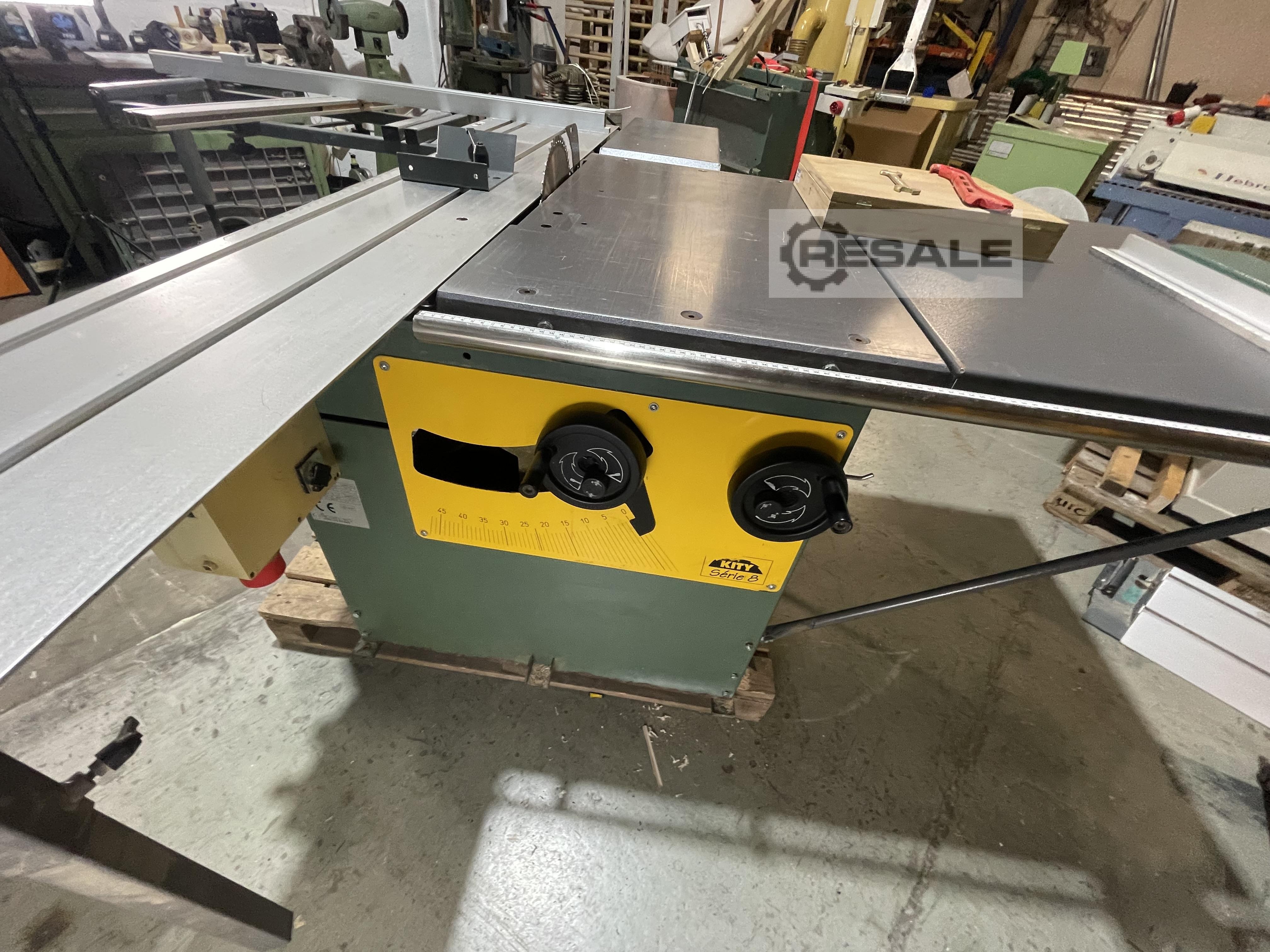 Sawblade tiltable: 45 ° Length of the rolling table: 2050 mm Cutting width: 1100 mm Oferujemy pilarkę formatową Kity z dawnego warsztatu hobbystycznego.