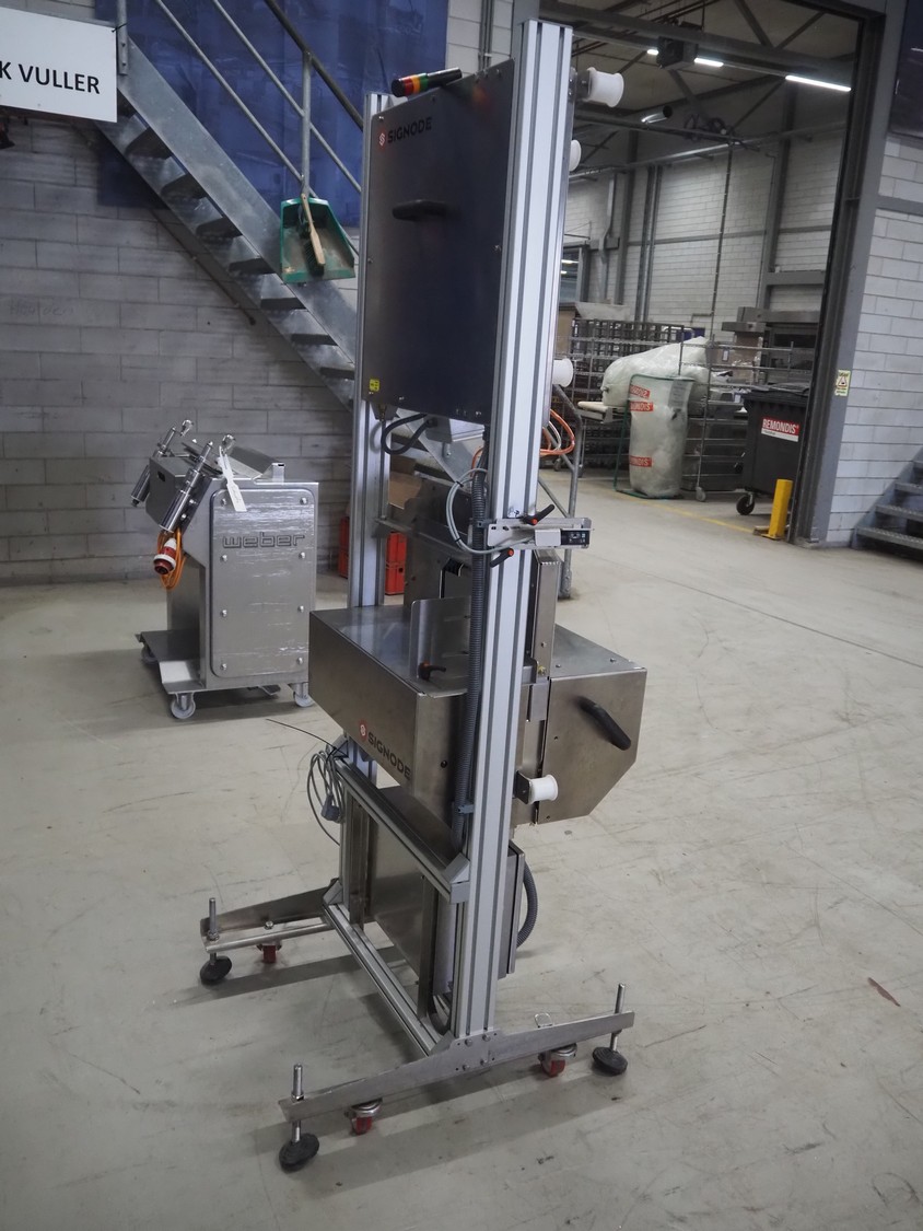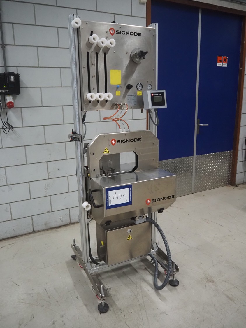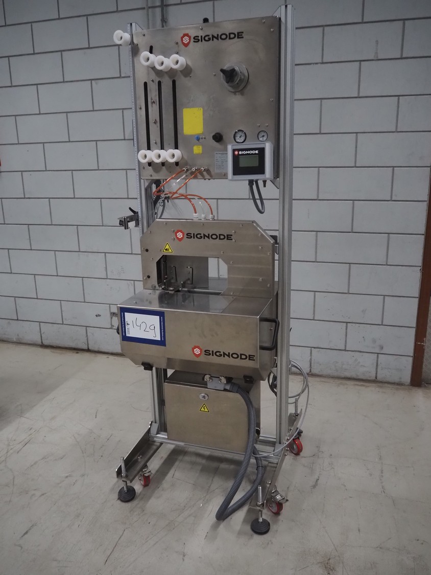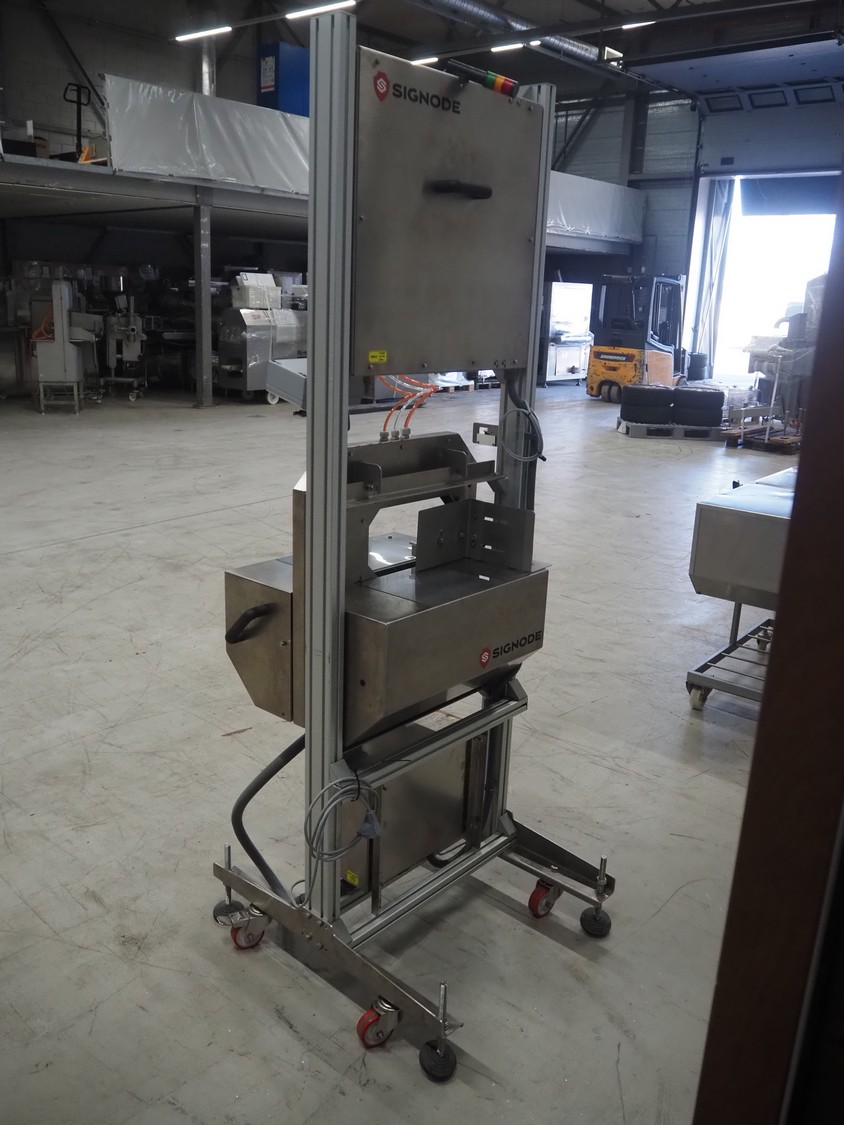 Maszyna do pasowania taśm Signode, model: BA 24-15-40, numer seryjny: 26840772 SNAK200147, rok produkcji: 2020, 24 V, prześwit: 320 mm x 160 mm, wymiary całkowite: 800 mm x 800 mm x 2050 mm.