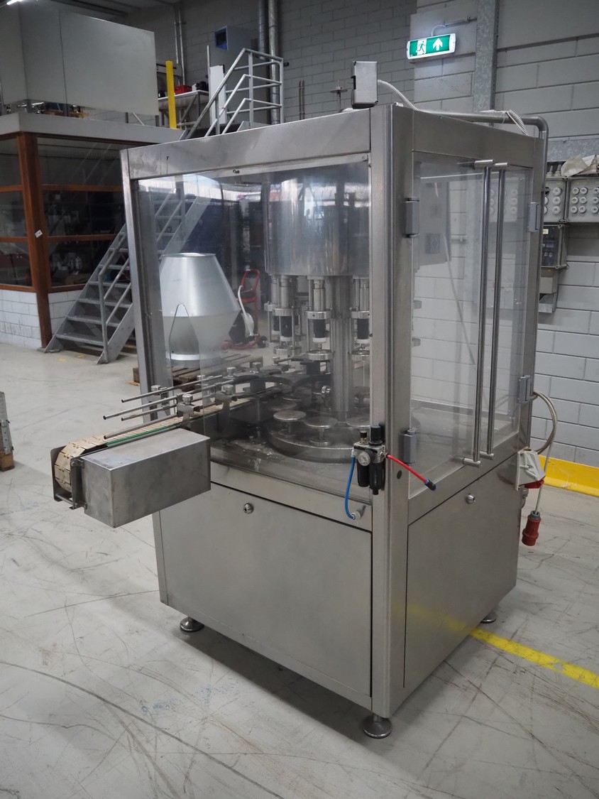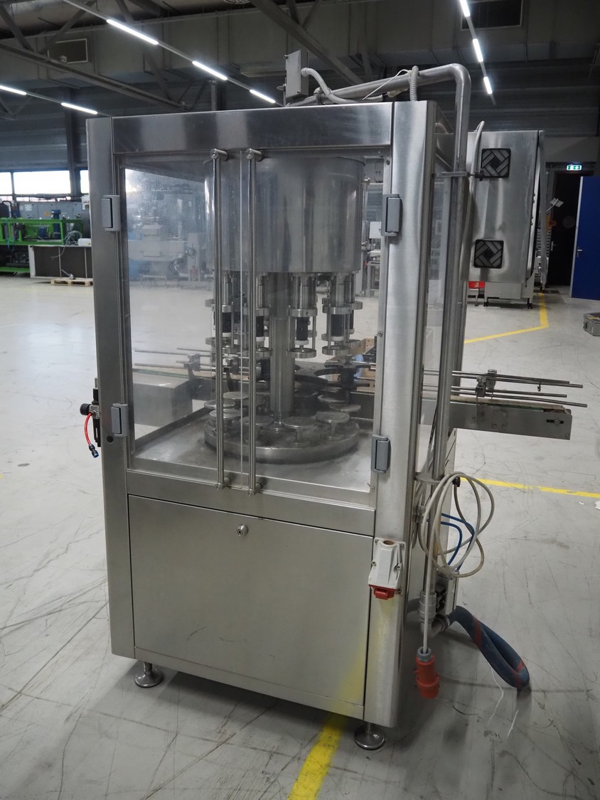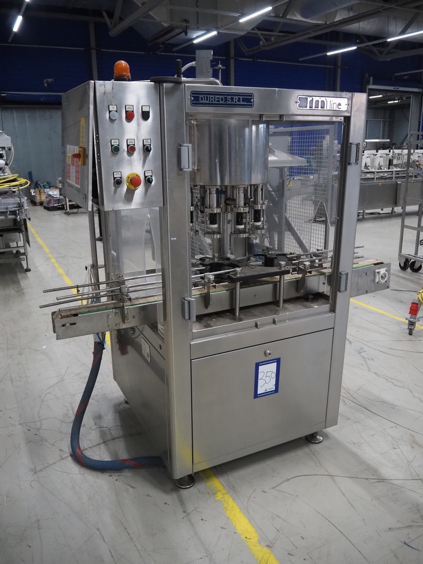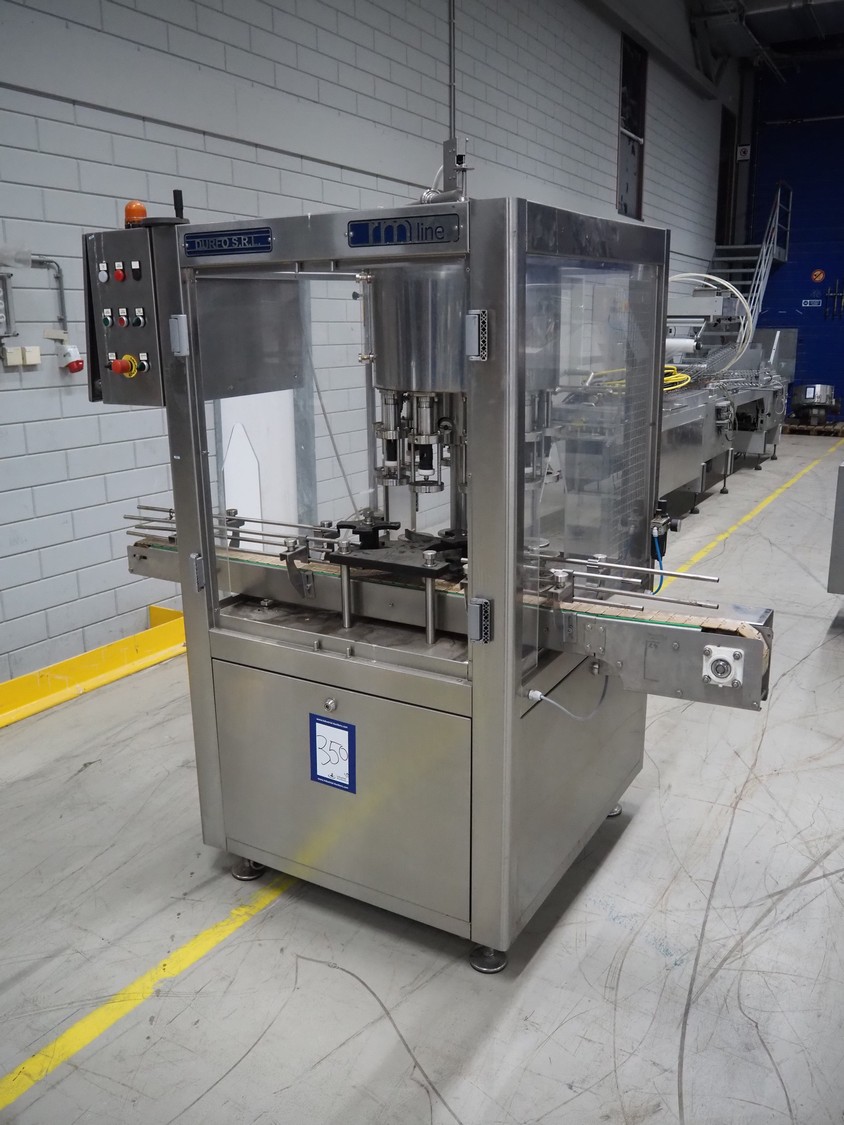 I tak dalej. Maszyna do zamykania kap André Zalkin, typ: CA/3/360/NG, numer seryjny: 24576, rok produkcji: 2011, plastikowy pasek, szerokość taśmy: 80 mm, średnica kubków: 80 mm, całkowita długość taśmy: 7700 mm, całkowite wymiary maszyna zamykająca: 3550 mm x 1450 mm x 3300 mm. Z podnoszącym pasem doprowadzającym, plastikowym pasem z przegrodami, wysokość przegrody: 50 mm, całkowite wymiary: 2100 mm x 1030 mm x 3650 mm. W tym plastikowa paleta i pojemnik na mięso z dodatkowymi częściami.